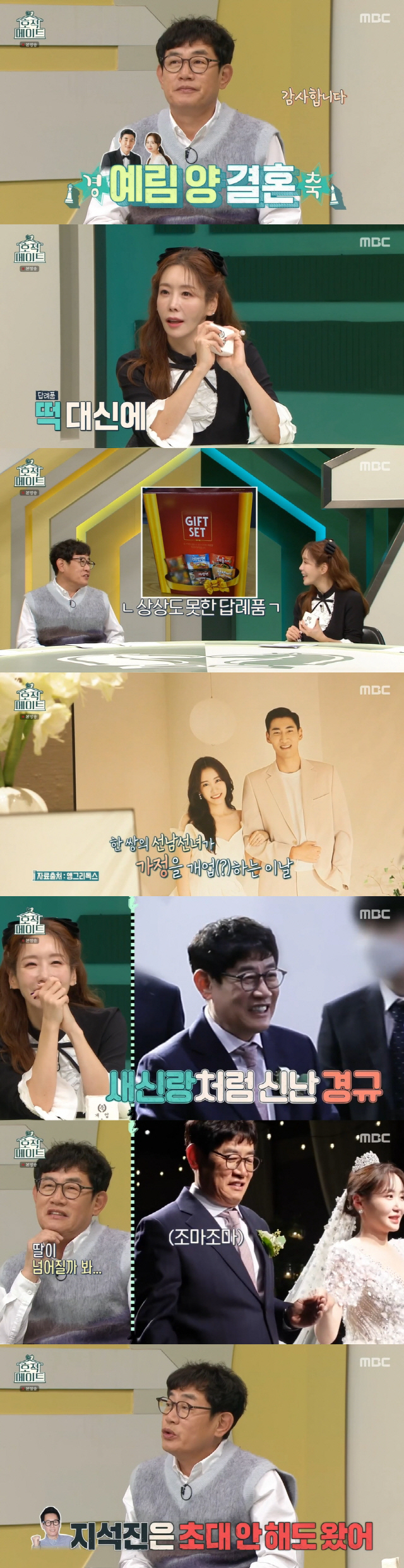 이날 김정은은 "예림 양 결혼식 갔는데 답례품으로 떡 대신에 라면을 주더라"고 말했다. 이에 이경규는 "반응이 폭발적이었다. 결혼식 끝나고 라면 받으려고 아무도 안 갔다. 줄 섰다"며 뿌듯해했다.