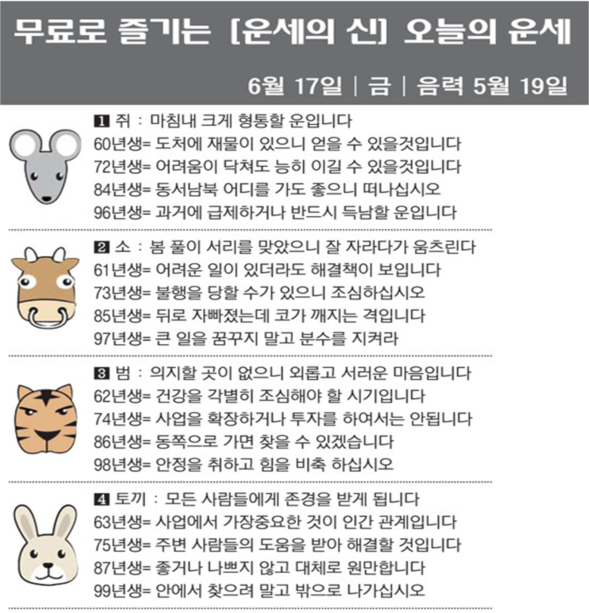 오늘의 운세 2022년 6월 17일 금요일 띠별운세 스포츠조선 2022. 6. 17. 08:35 #운세의신 에서만 무료로 제공하는 운세 모음!▼ 1. #연애궁합 - http://bit.ly/2HGcNGC 2. #오늘의운세 - http://bit.ly/2Kvo4ra 3. #운명의상대 - http://bit.ly/2xjt3ss 4. #평생사주 - http://bit.ly/2rg8WWv 5. #재물운 -http://bit.ly/2rdQz4A 6. #자녀운 - http://bit.ly/2krNsSx