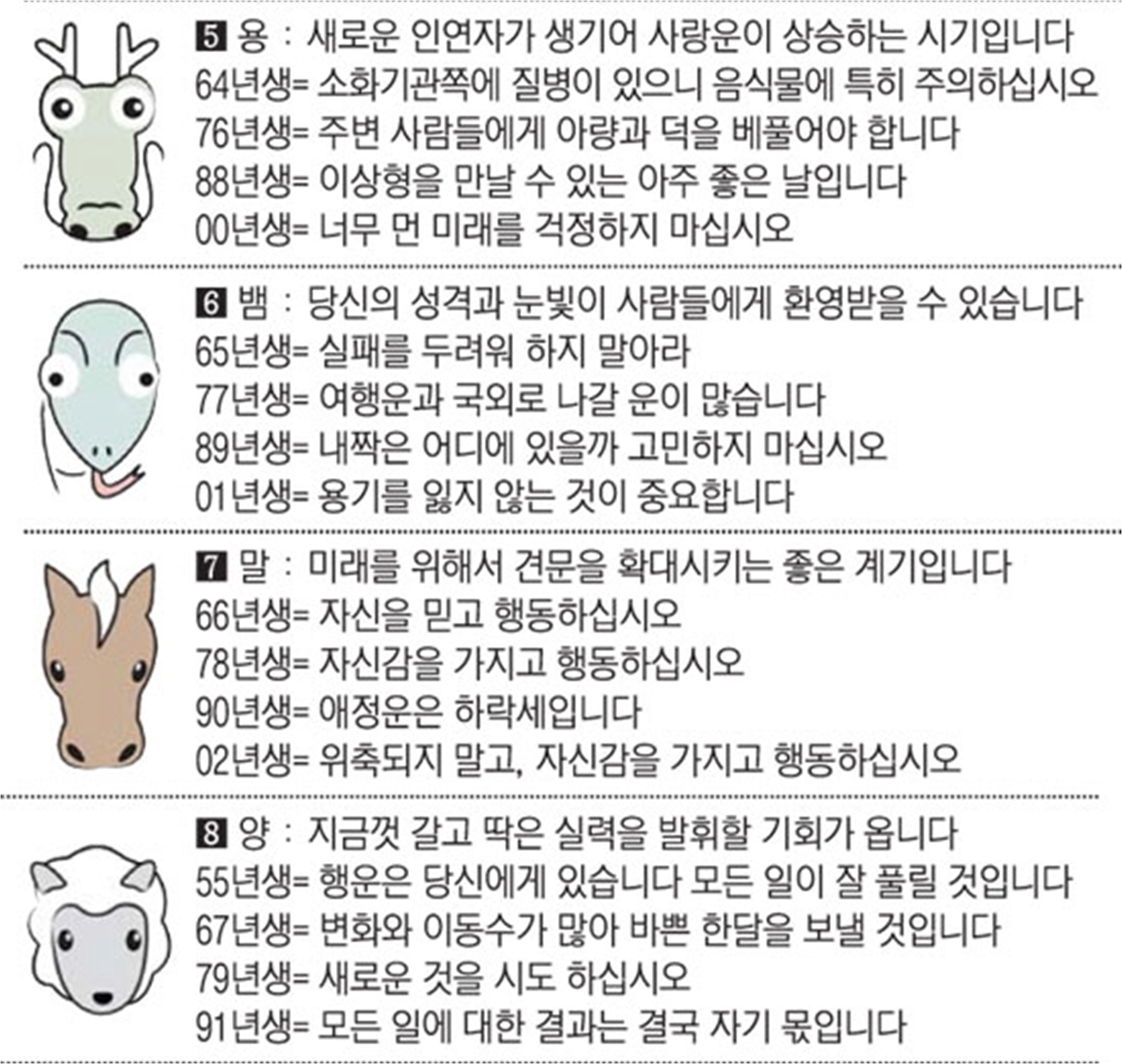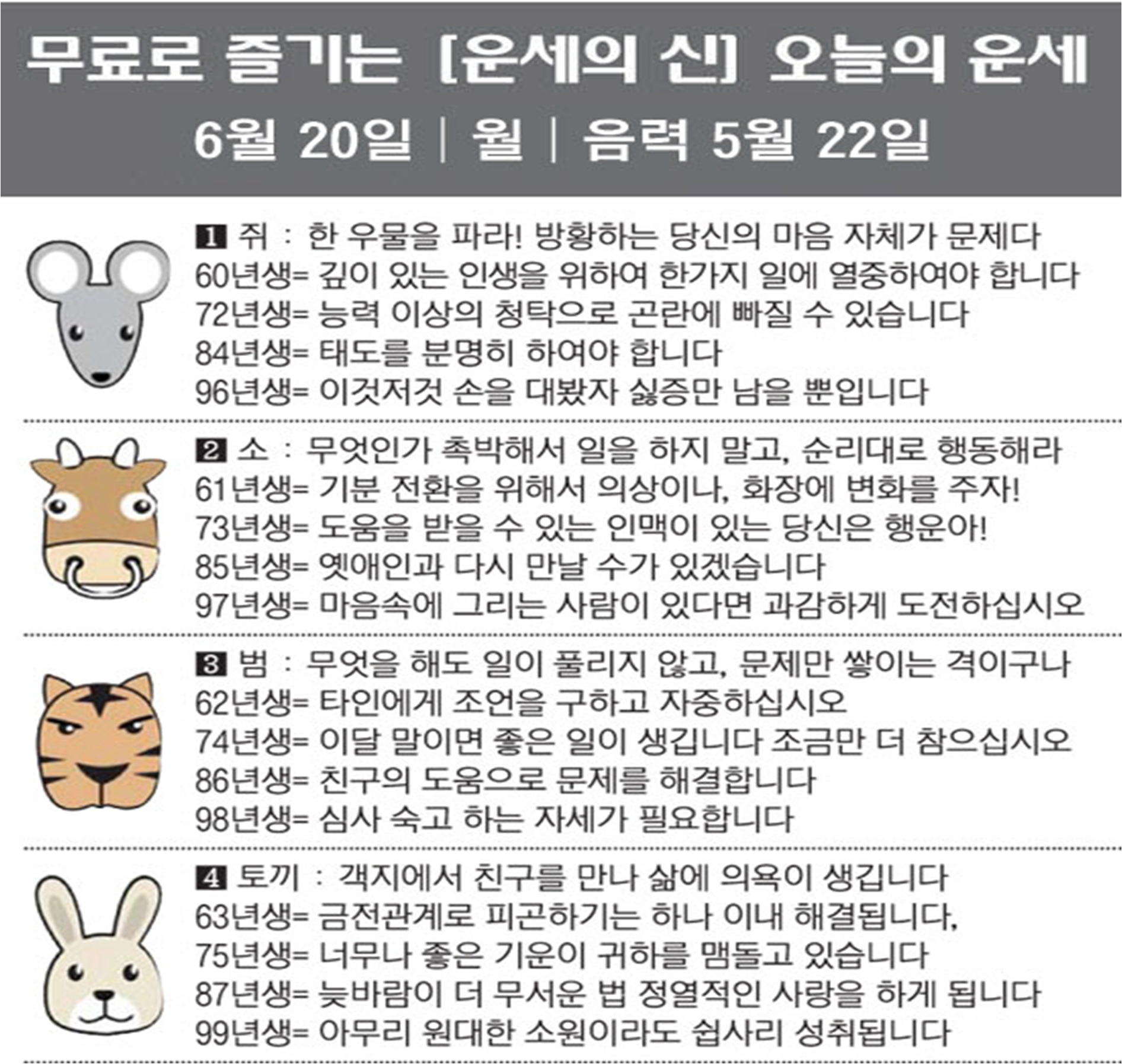 오늘의 운세 2022년 6월 20일 월요일 띠별운세 스포츠조선 2022. 6. 20. 08:40 #운세의신 에서만 무료로 제공하는 운세 모음!▼ 1. #연애궁합 - http://bit.ly/2HGcNGC 2. #오늘의운세 - http://bit.ly/2Kvo4ra 3. #운명의상대 - http://bit.ly/2xjt3ss 4. #평생사주 - http://bit.ly/2rg8WWv 5. #재물운 -http://bit.ly/2rdQz4A 6. #자녀운 - http://bit.ly/2krNsSx