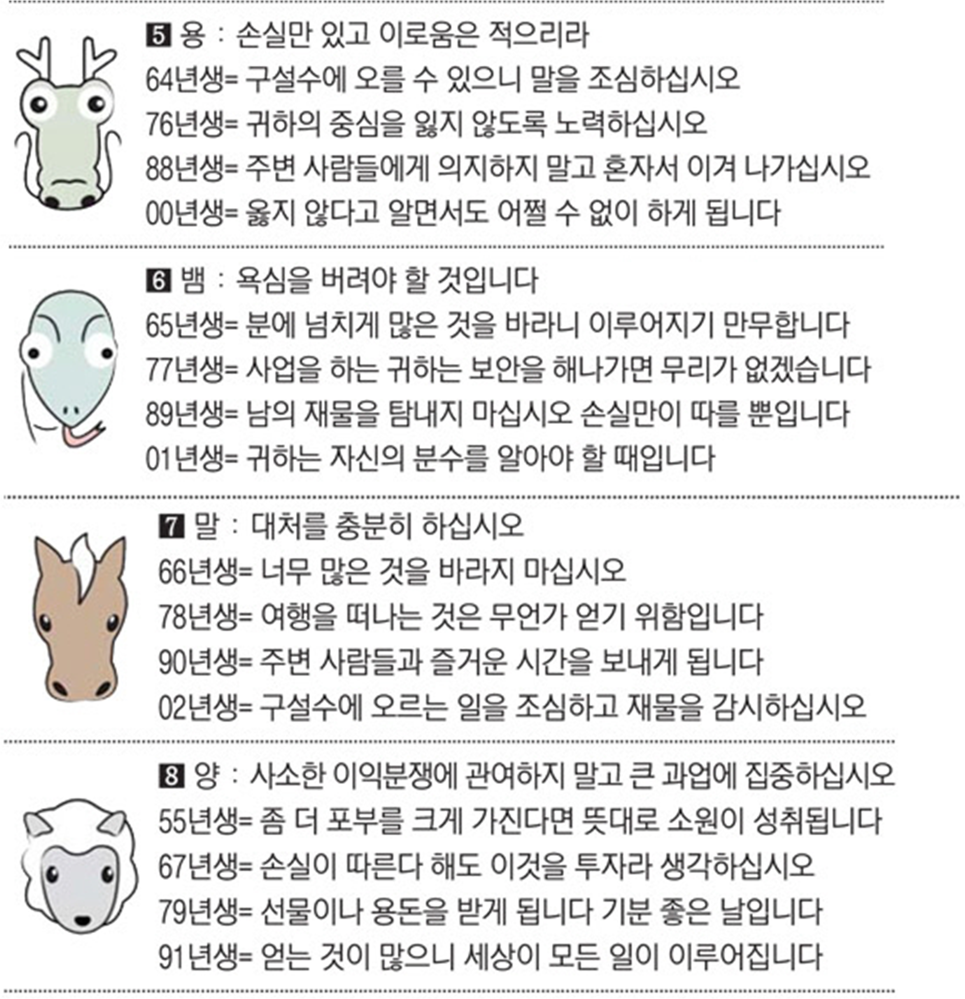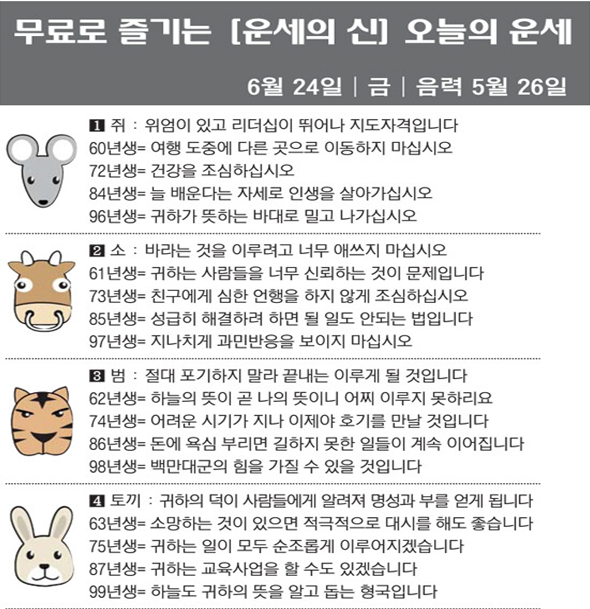 오늘의 운세 2022년 6월 24일 금요일 #띠별운세 스포츠조선 2022. 6. 24. 08:51 #운세의신 에서만 무료로 제공하는 운세 모음!▼ 1. #연애궁합 - http://bit.ly/2HGcNGC 2. #오늘의운세 - http://bit.ly/2Kvo4ra 3. #운명의상대 - http://bit.ly/2xjt3ss 4. #평생사주 - http://bit.ly/2rg8WWv 5. #재물운 -http://bit.ly/2rdQz4A 6. #자녀운 - http://bit.ly/2krNsSx