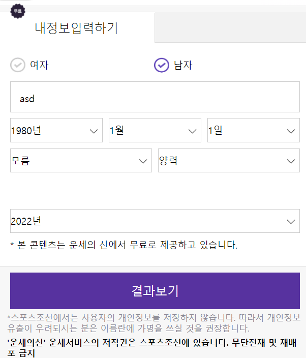 그동안 '공짜'라는 말에 밑 져야 본전이라는 생각으로 사이트에 보아도 제목만 공짜일 뿐, 현실은 유료 서비스 이용을 유도하거나 회원가입을 해야 이용 가능한, 일명 낚시성 광고가 대부분이거나 일부만 무료로 제공하고 추가적인 정보는 결제를 해야 볼 수 있는 식의 무료 운세 서비스가 많았는데요,