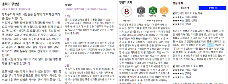 신년 한 해 전반적으로는 어떤지, 매 월 나의 운세는 어떤지 또 어떤 숫자가 행운의 숫자이고 어떤 색이 내게 행운을 가져다줄지, 불행을 가져다줄지 이 모든걸 무료로 볼 수 있다니 웬만한 사이트 유료 운세보다 훨씬 나은것 같네요!