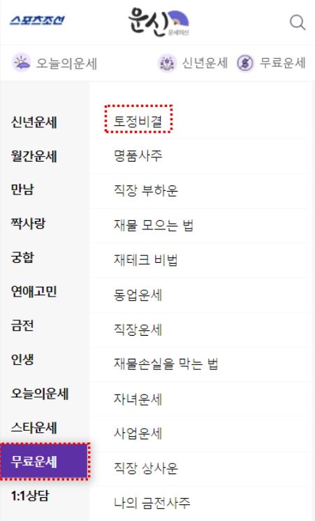 그리고 왼쪽의 '무료운세' 클릭 후 오른쪽 가장 위에 노출되고 있는 '토정비결' 을 클릭합니다.