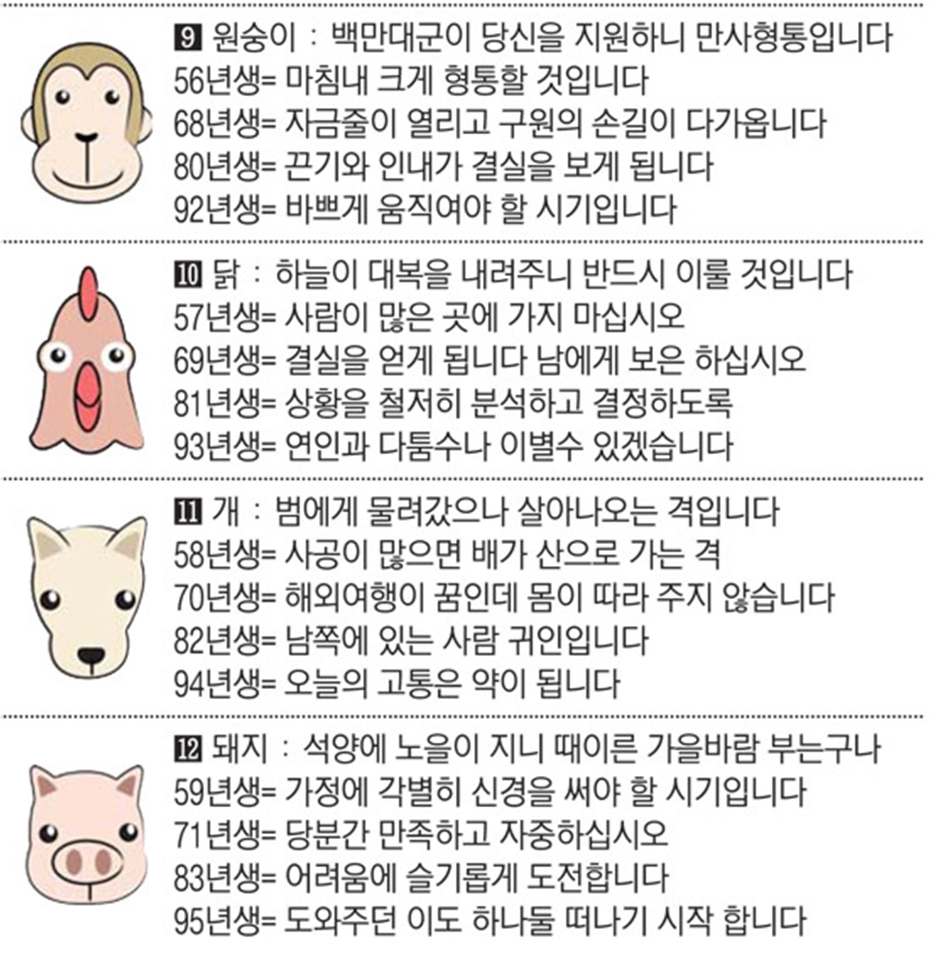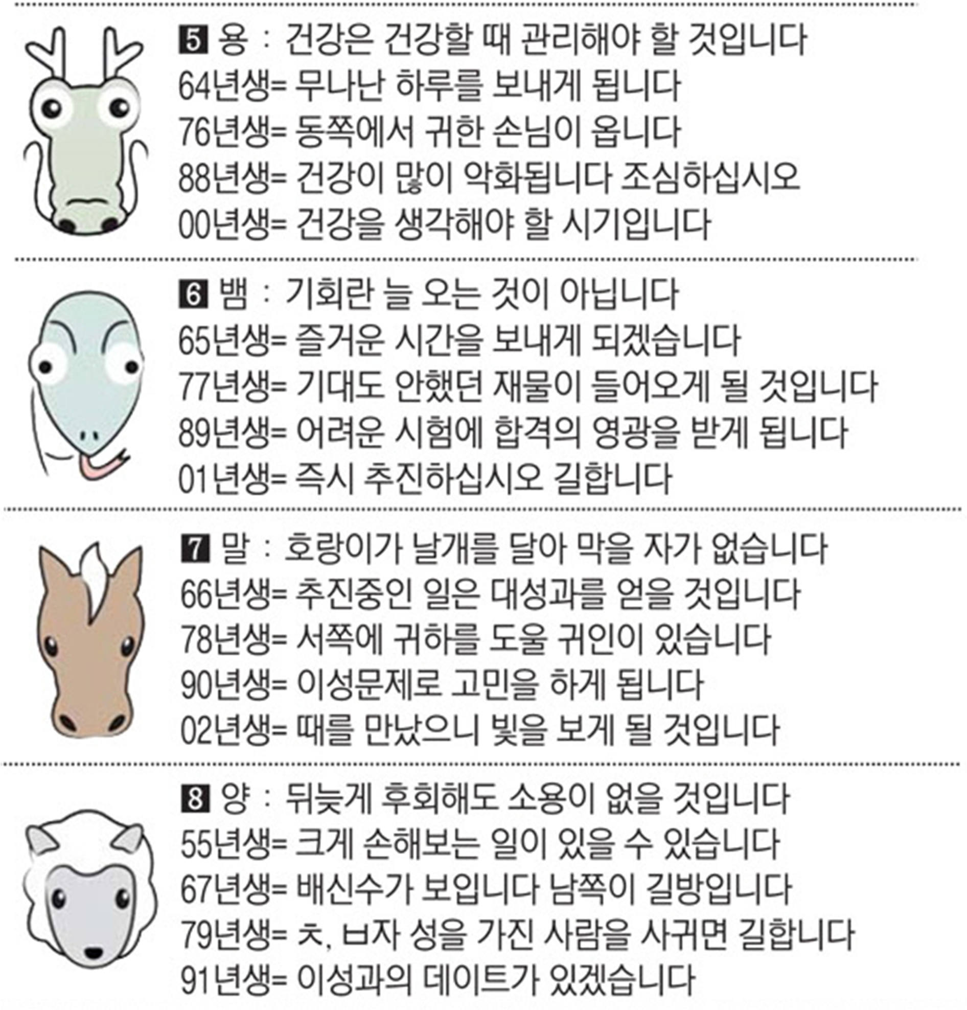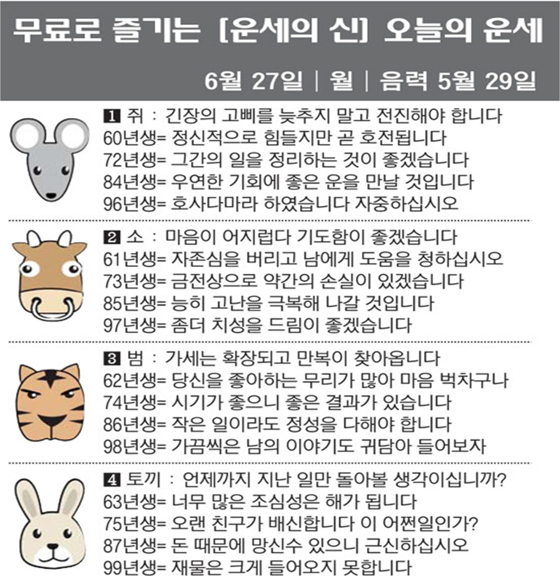 오늘의 운세 2022년 6월 27일 월요일 띠별운세 스포츠조선 2022. 6. 27. 08:52 #운세의신 에서만 무료로 제공하는 운세 모음!▼ 1. #연애궁합 - http://bit.ly/2HGcNGC 2. #오늘의운세 - http://bit.ly/2Kvo4ra 3. #운명의상대 - http://bit.ly/2xjt3ss 4. #평생사주 - http://bit.ly/2rg8WWv 5. #재물운 -http://bit.ly/2rdQz4A 6. #자녀운 - http://bit.ly/2krNsSx