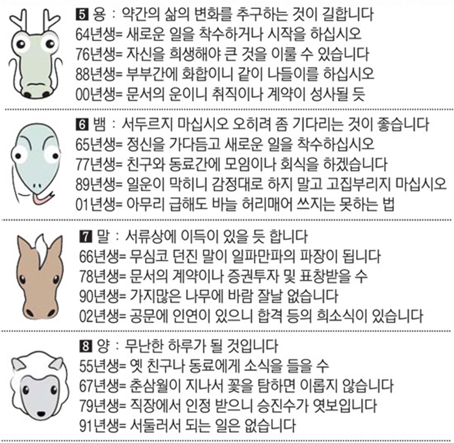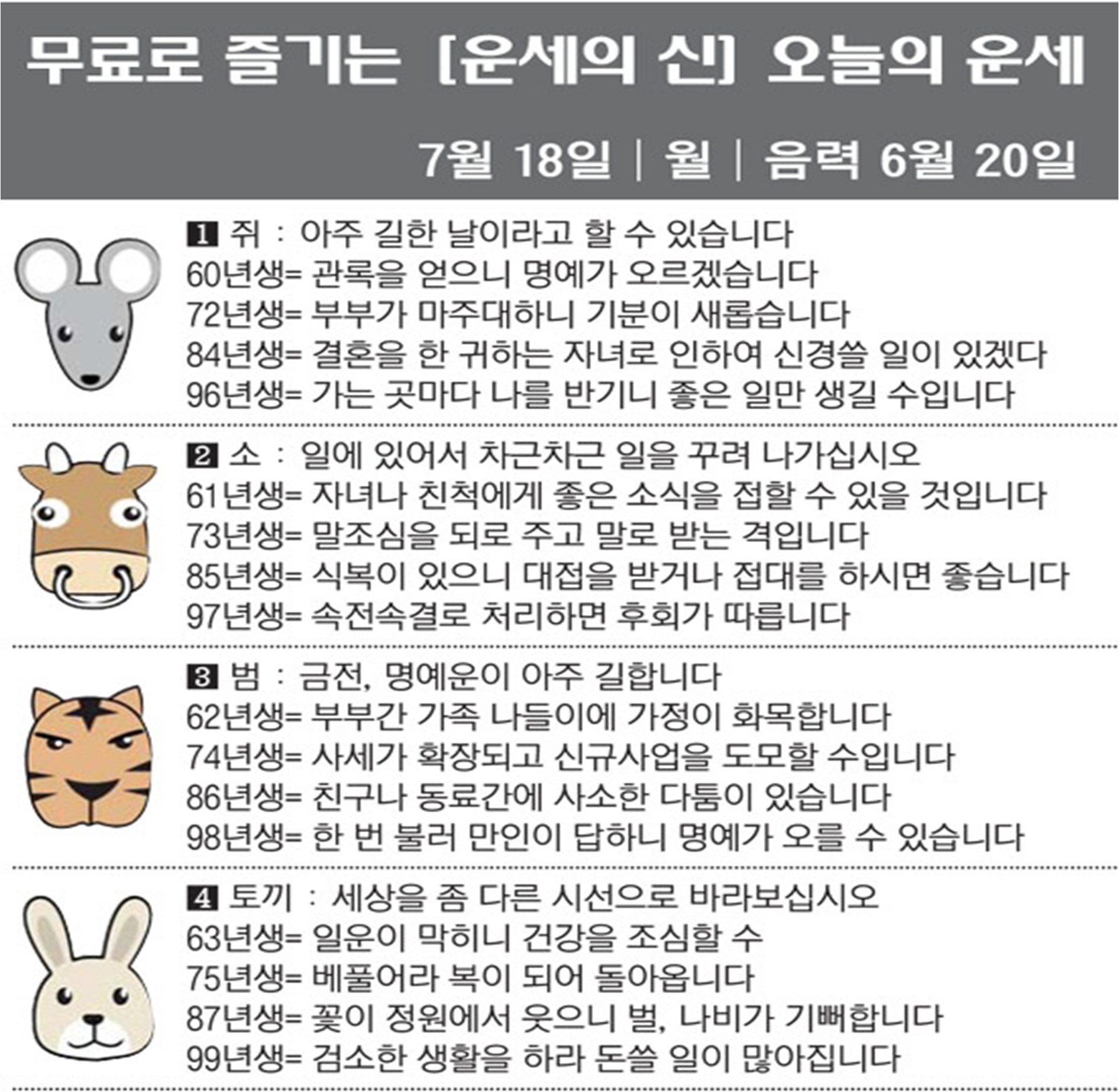 오늘의 운세 2022년 7월 18일 월요일 띠별운세 스포츠조선 2022. 7. 18. 08:42 #운세의신 에서만 무료로 제공하는 운세 모음!▼ 1. #연애궁합 - http://bit.ly/2HGcNGC 2. #오늘의운세 - http://bit.ly/2Kvo4ra 3. #운명의상대 - http://bit.ly/2xjt3ss 4. #평생사주 - http://bit.ly/2rg8WWv 5. #재물운 -http://bit.ly/2rdQz4A 6. #자녀운 - http://bit.ly/2krNsSx