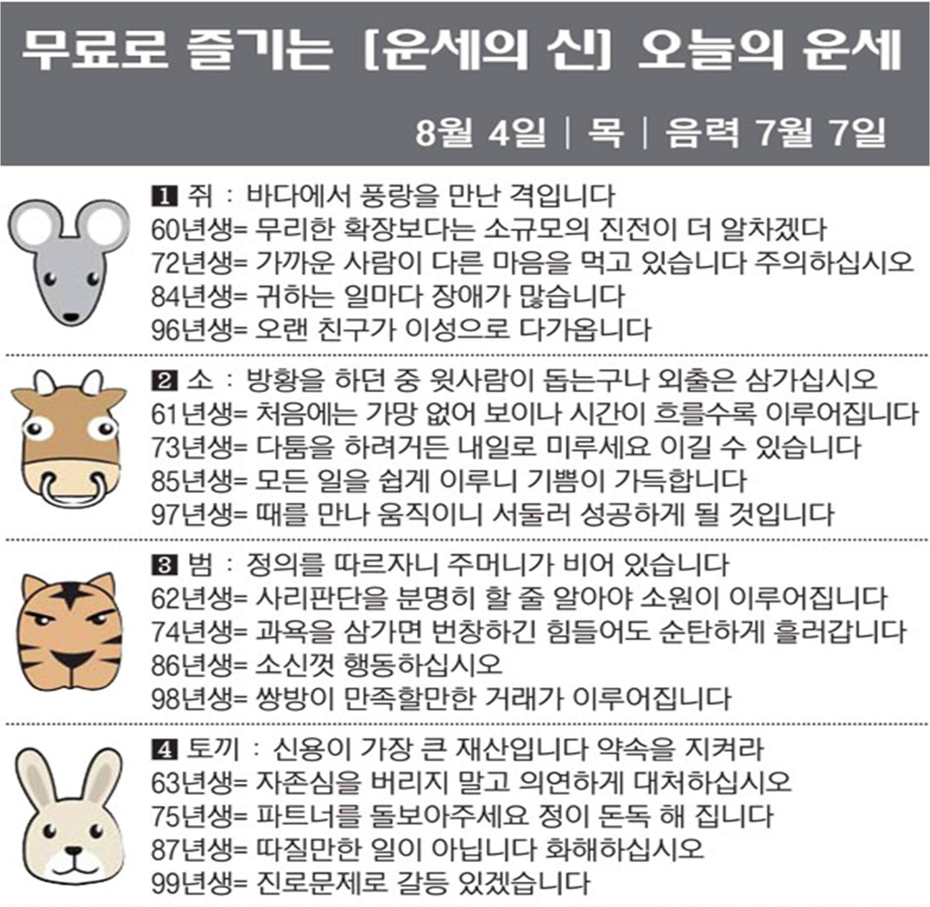 오늘의 운세 2022년 8월 4일 목요일 띠별운세 스포츠조선 2022. 8. 4. 08:38 #운세의신 에서만 무료로 제공하는 운세 모음!▼ 1. #연애궁합 - http://bit.ly/2HGcNGC 2. #오늘의운세 - http://bit.ly/2Kvo4ra 3. #운명의상대 - http://bit.ly/2xjt3ss 4. #평생사주 - http://bit.ly/2rg8WWv 5. #재물운 -http://bit.ly/2rdQz4A 6. #자녀운 - http://bit.ly/2krNsSx