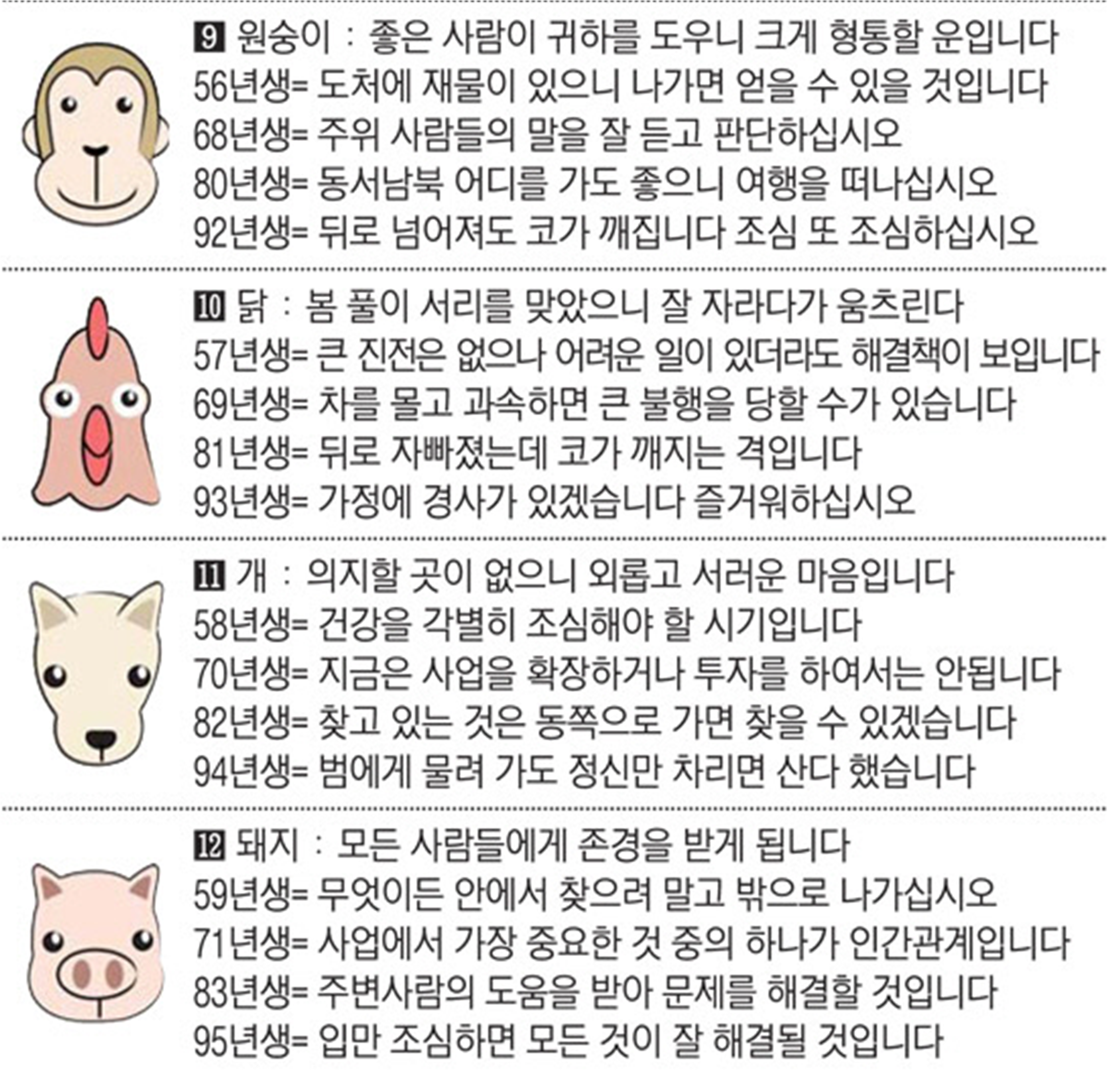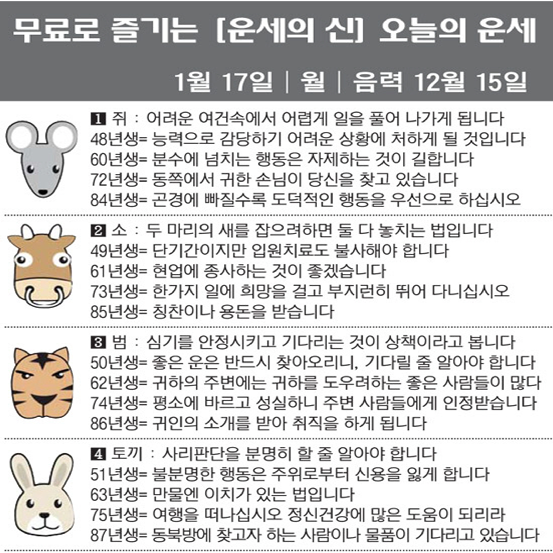오늘의 운세 2022년 1월 17일 월요일 띠별운세 스포츠조선 2022. 1. 17. 08:27 ★2022 신년운세 보러가기 : https://bit.ly/360Jzf4 #운세의신 에서만 무료로 제공하는 운세 모음!▼ 1. #연애궁합 - http://bit.ly/2HGcNGC 2. #오늘의운세 - http://bit.ly/2Kvo4ra 3. #운명의상대 - http://bit.ly/2xjt3ss 4. #평생사주 - http://bit.ly/2rg8WWv 5. #재물운 -http://bit.ly/2rdQz4A 6. #자녀운 - http://bit.ly/2krNsSx