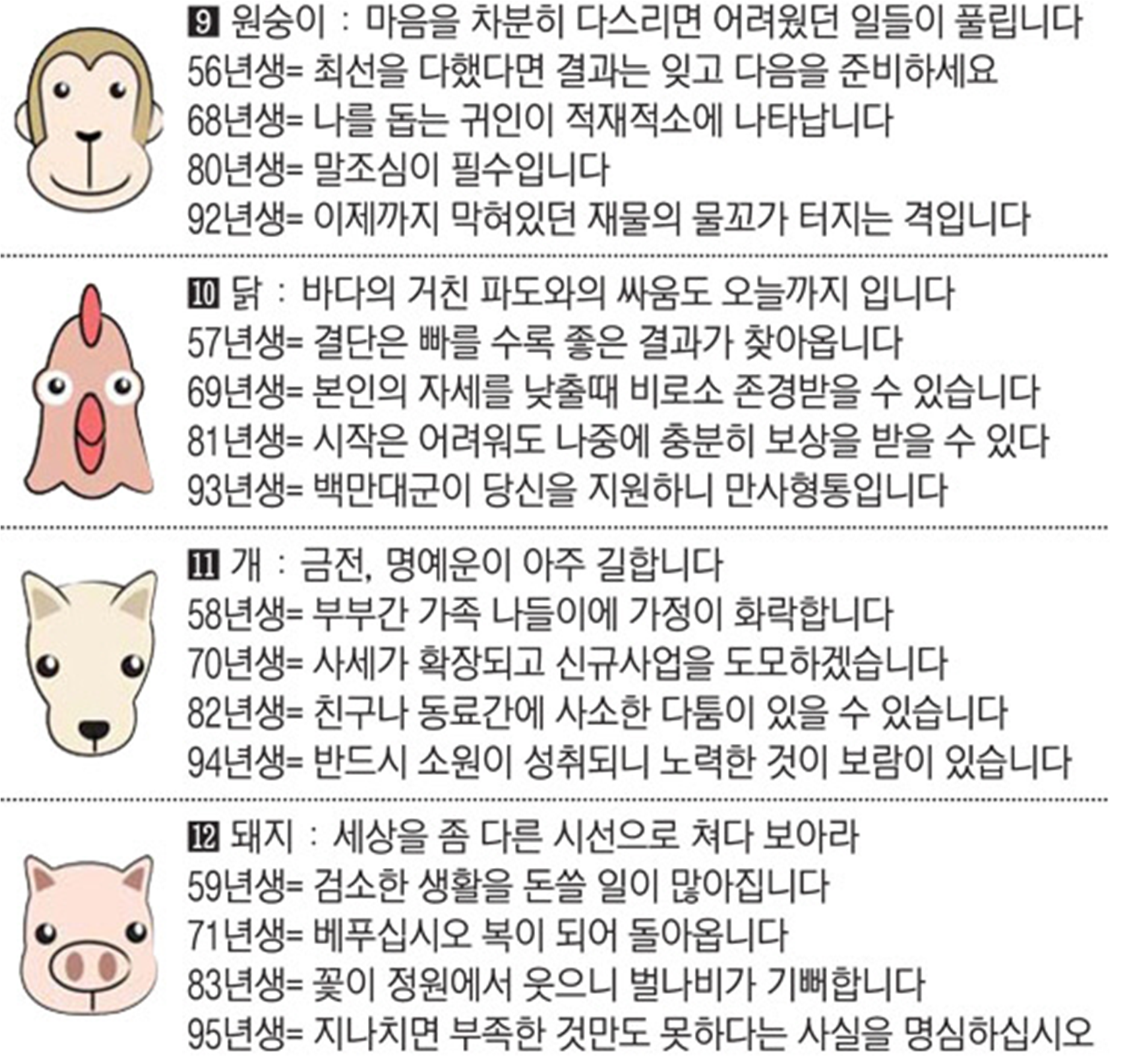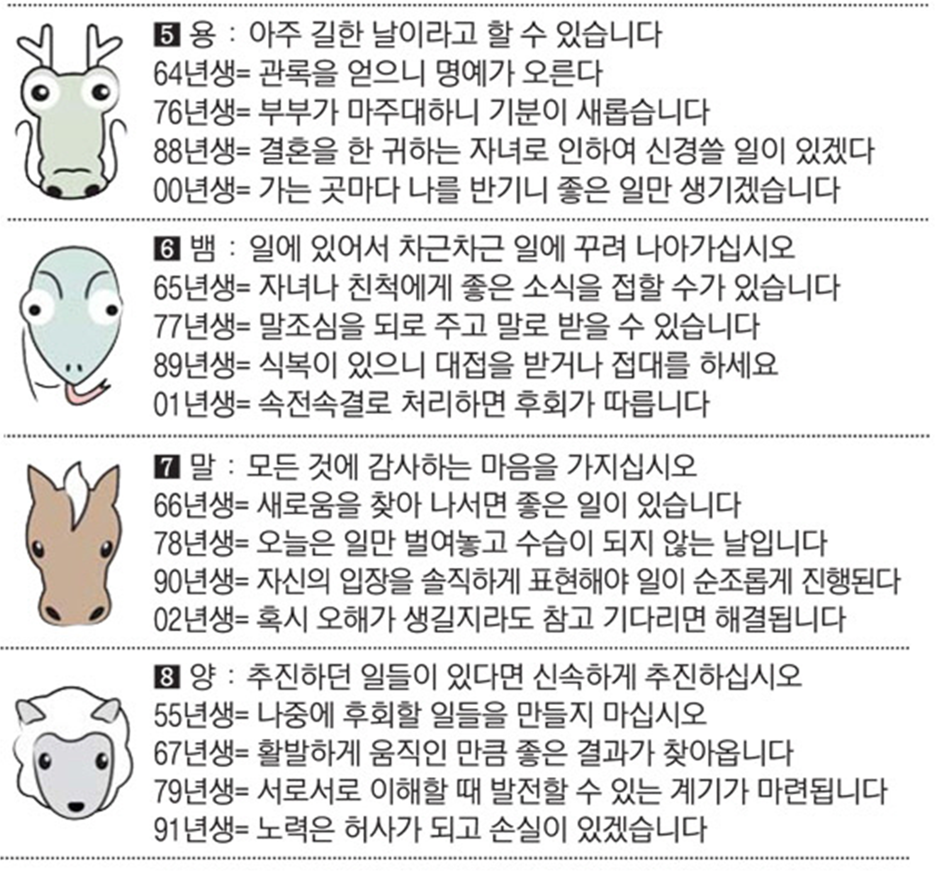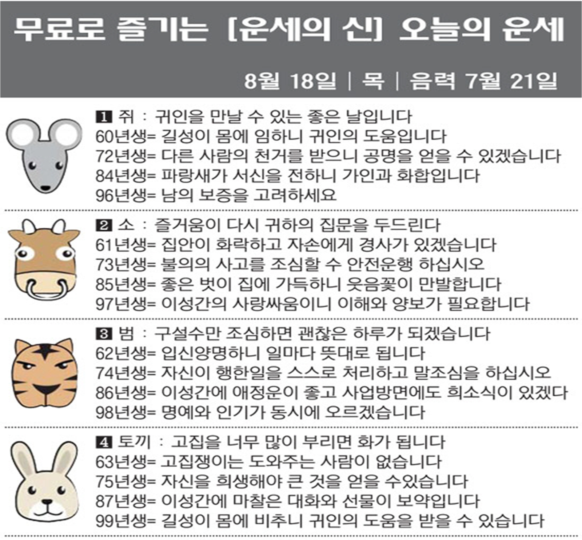 오늘의 운세 2022년 8월 18일 목요일 띠별운세 스포츠조선 2022. 8. 18. 08:46 #운세의신 에서만 무료로 제공하는 운세 모음!▼ 1. #연애궁합 - http://bit.ly/2HGcNGC 2. #오늘의운세 - http://bit.ly/2Kvo4ra 3. #운명의상대 - http://bit.ly/2xjt3ss 4. #평생사주 - http://bit.ly/2rg8WWv 5. #재물운 -http://bit.ly/2rdQz4A 6. #자녀운 - http://bit.ly/2krNsSx