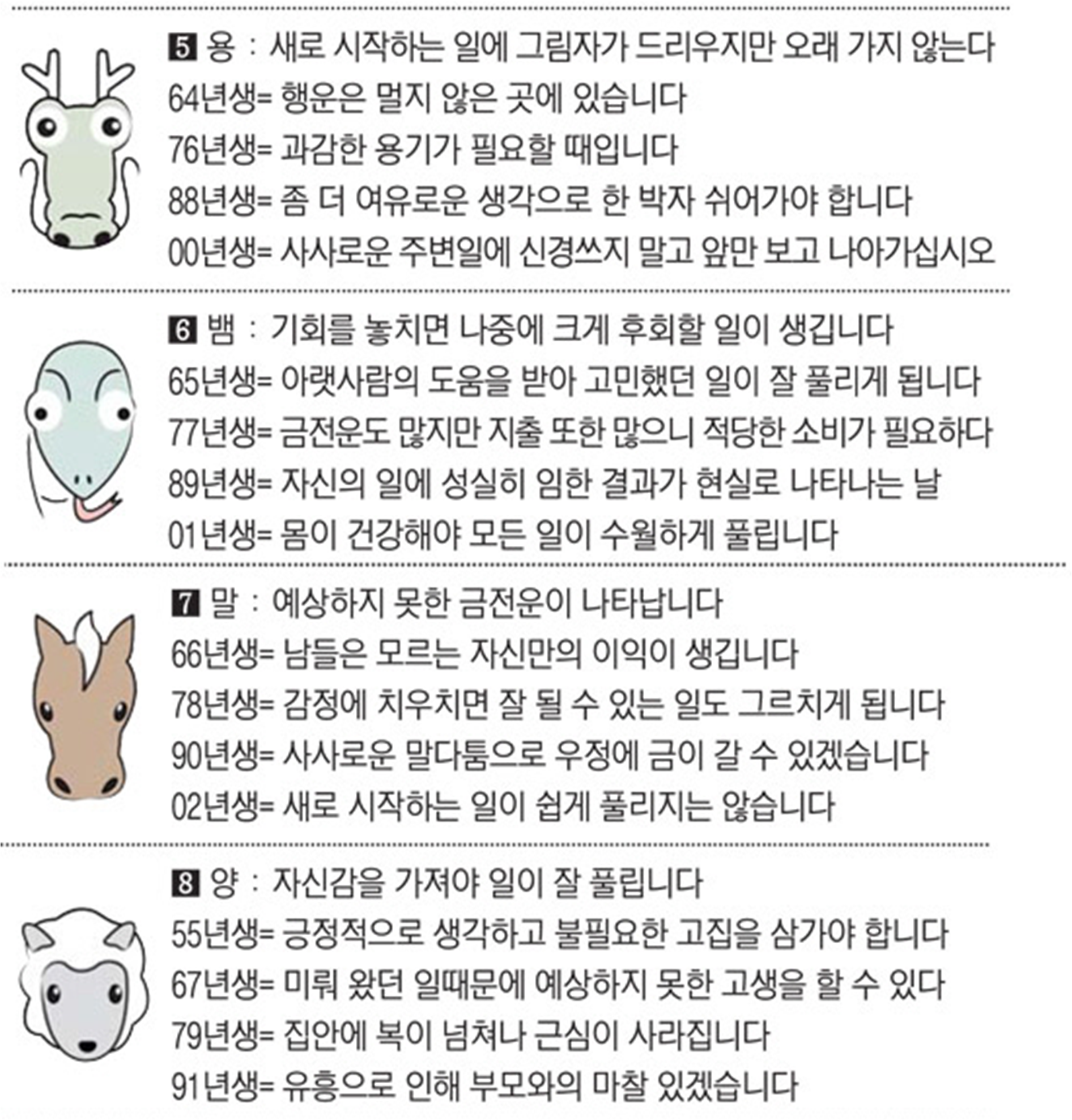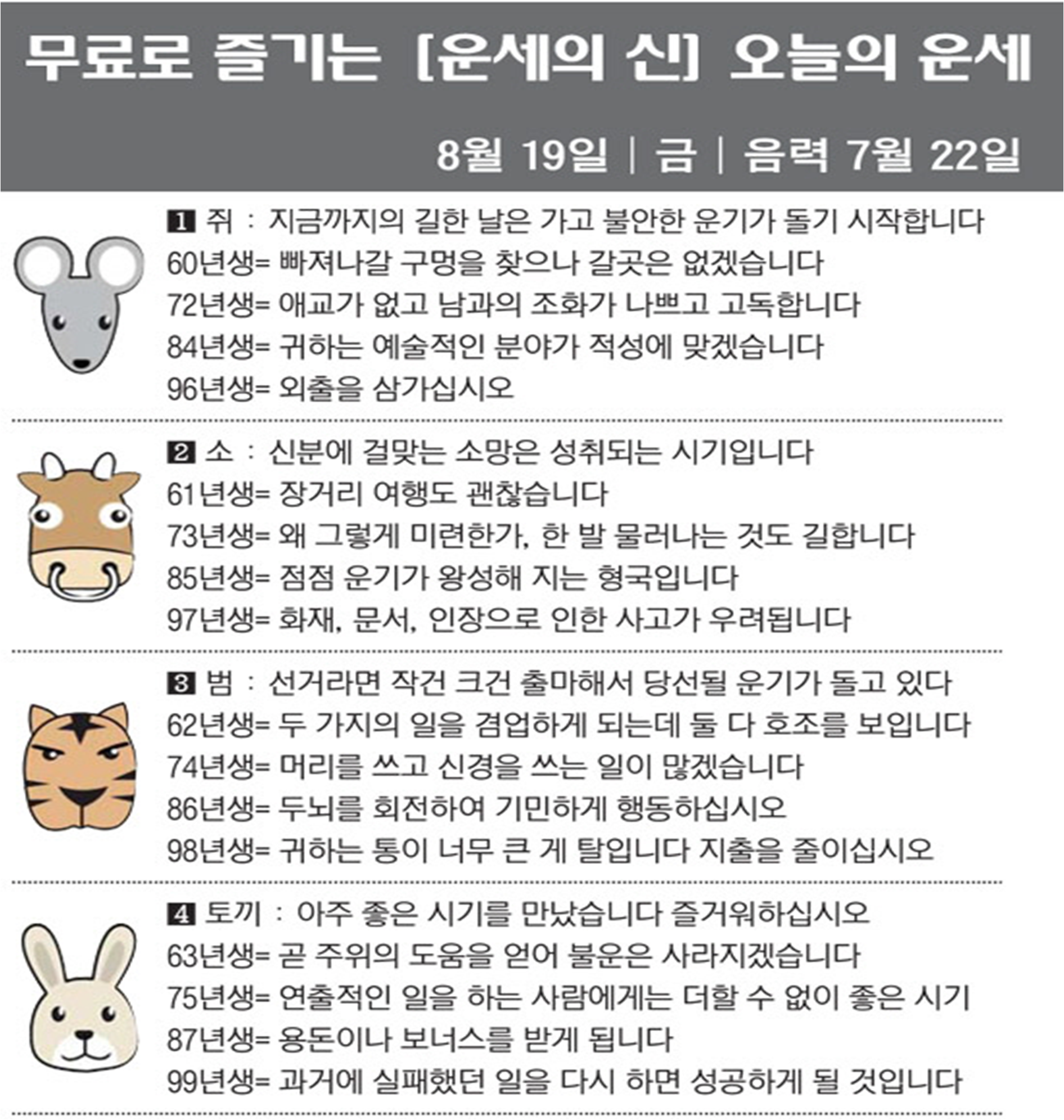 오늘의 운세 2022년 8월 19일 금요일 띠별운세 스포츠조선 2022. 8. 19. 08:45 #운세의신 에서만 무료로 제공하는 운세 모음!▼ 1. #연애궁합 - http://bit.ly/2HGcNGC 2. #오늘의운세 - http://bit.ly/2Kvo4ra 3. #운명의상대 - http://bit.ly/2xjt3ss 4. #평생사주 - http://bit.ly/2rg8WWv 5. #재물운 -http://bit.ly/2rdQz4A 6. #자녀운 - http://bit.ly/2krNsSx