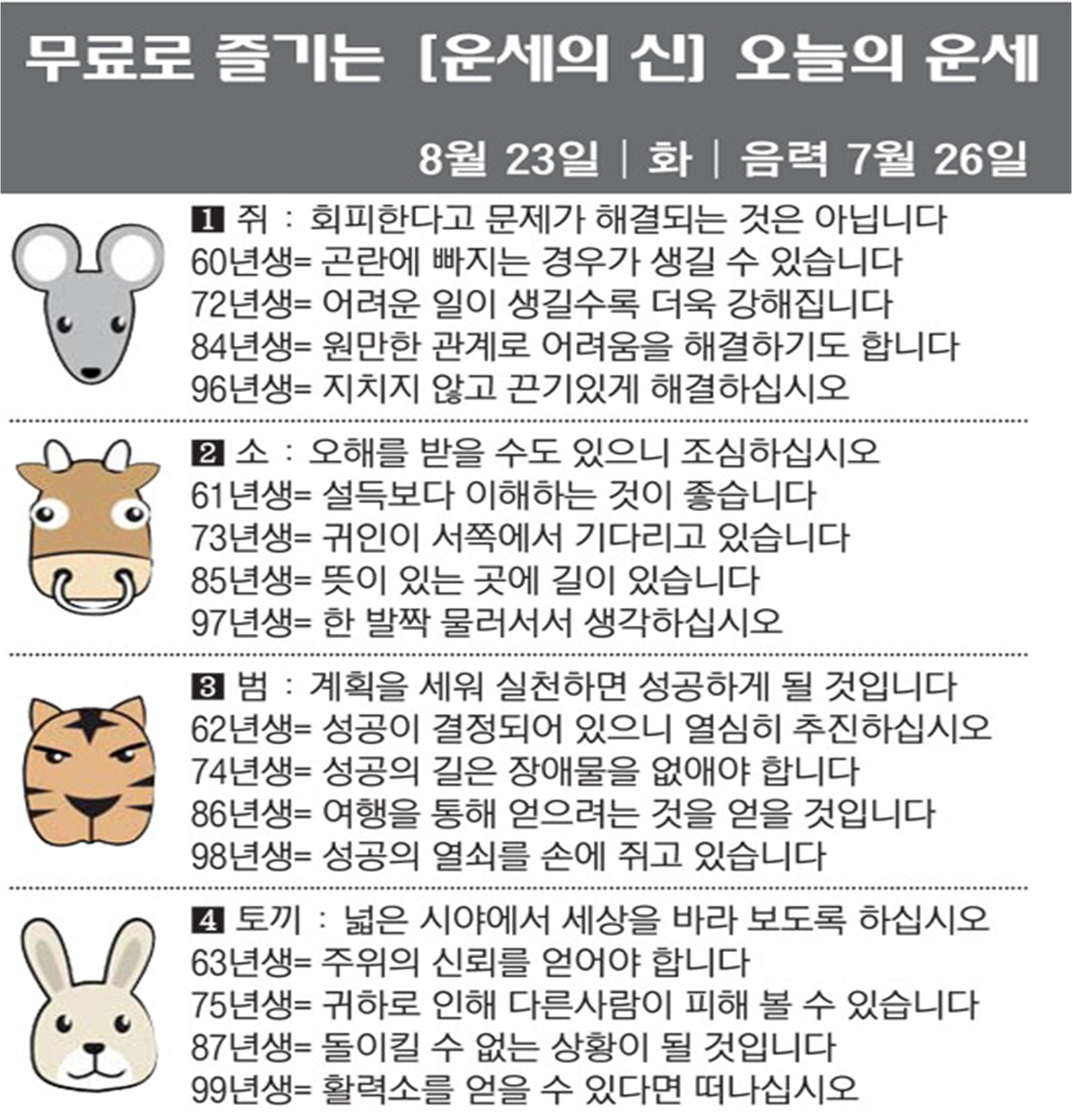 오늘의 운세 2022년 8월 23일 화요일 띠별운세 스포츠조선 2022. 8. 23. 08:39 #운세의신 에서만 무료로 제공하는 운세 모음!▼ 1. #연애궁합 - http://bit.ly/2HGcNGC 2. #오늘의운세 - http://bit.ly/2Kvo4ra 3. #운명의상대 - http://bit.ly/2xjt3ss 4. #평생사주 - http://bit.ly/2rg8WWv 5. #재물운 -http://bit.ly/2rdQz4A 6. #자녀운 - http://bit.ly/2krNsSx