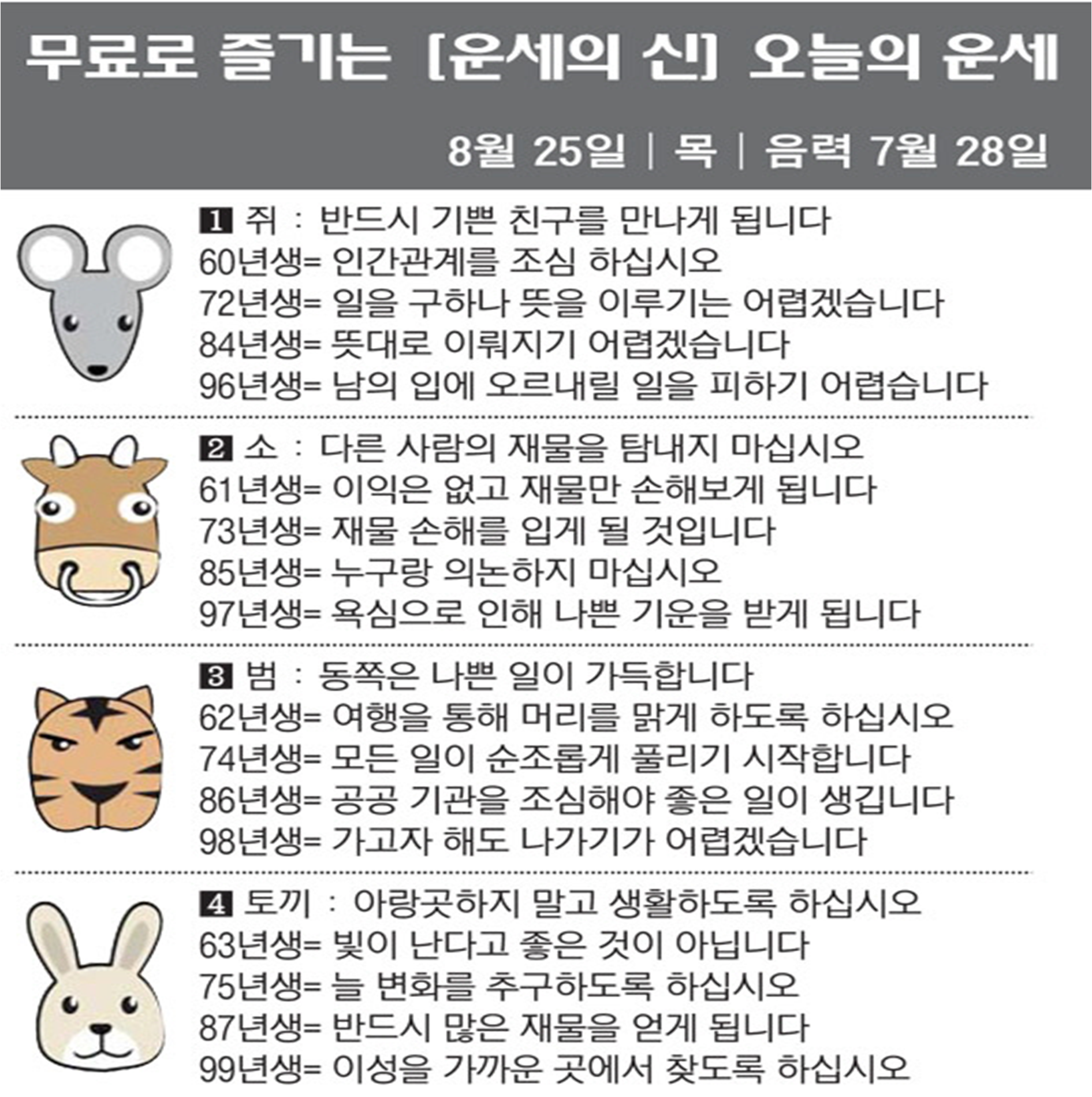 오늘의 운세 2022년 8월 25일 목요일 띠별운세 스포츠조선 2022. 8. 25. 09:09 #운세의신 에서만 무료로 제공하는 운세 모음!▼ 1. #연애궁합 - http://bit.ly/2HGcNGC 2. #오늘의운세 - http://bit.ly/2Kvo4ra 3. #운명의상대 - http://bit.ly/2xjt3ss 4. #평생사주 - http://bit.ly/2rg8WWv 5. #재물운 -http://bit.ly/2rdQz4A 6. #자녀운 - http://bit.ly/2krNsSx