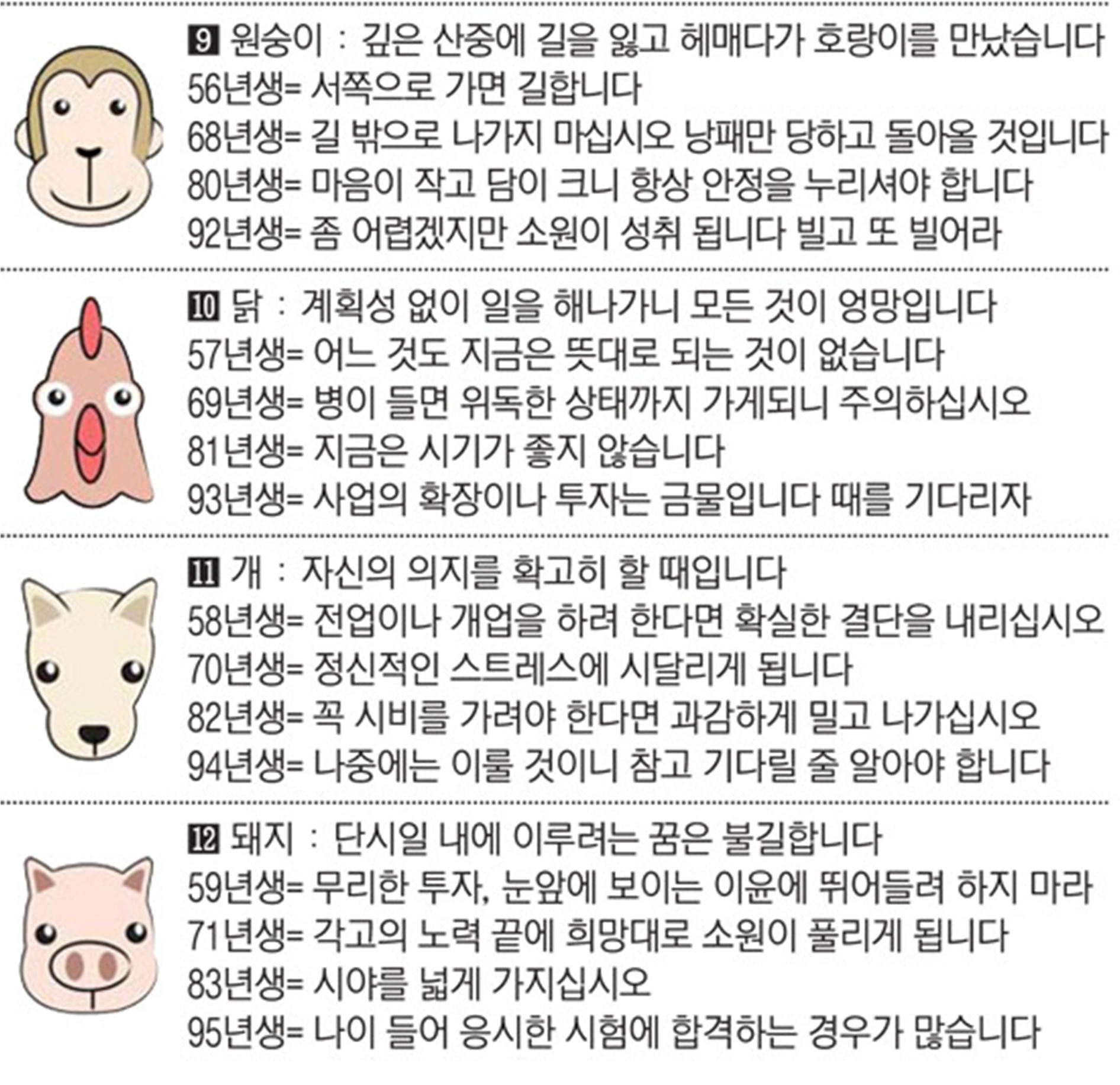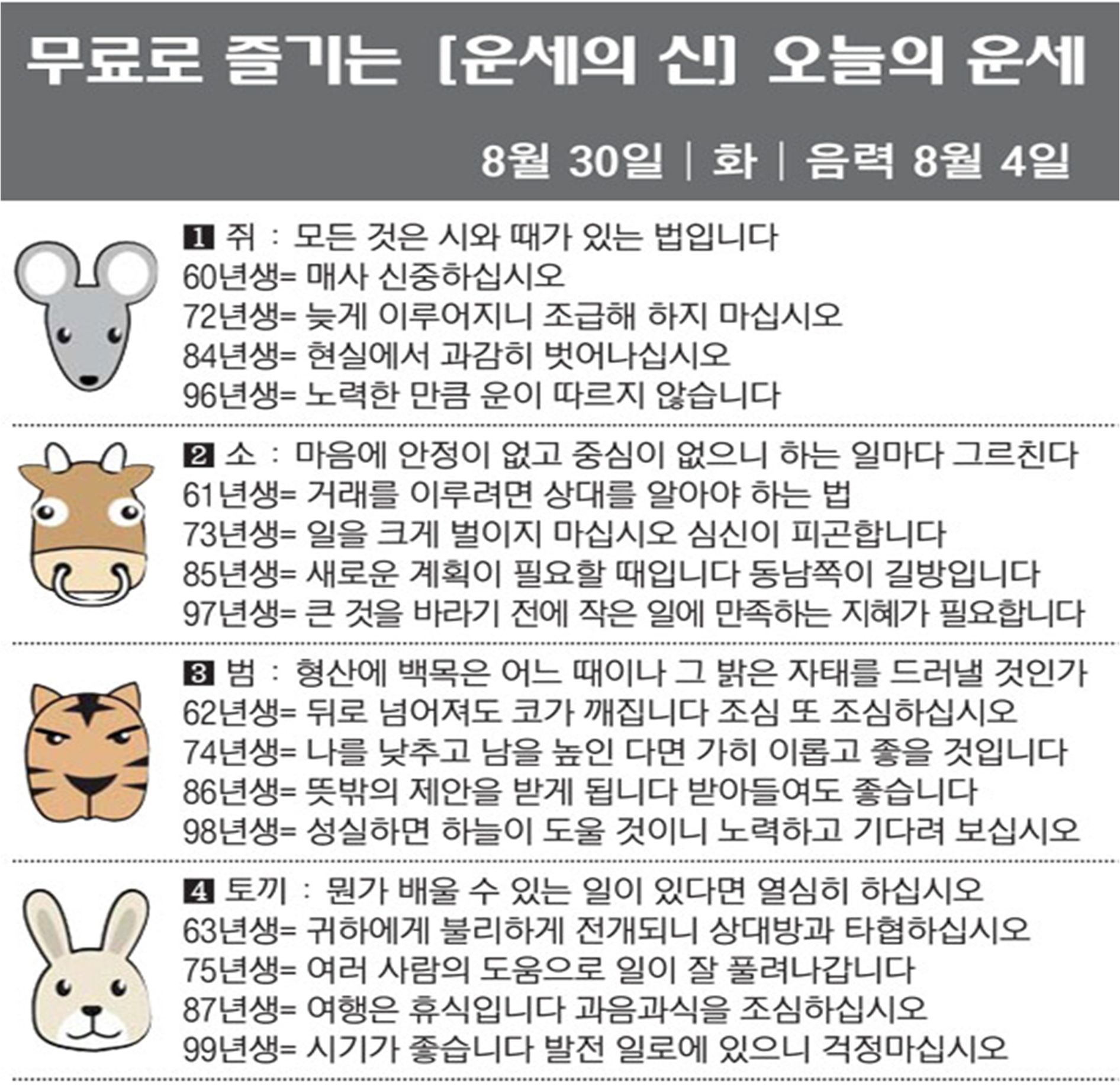 오늘의 운세 2022년 8월 30일 화요일 띠별운세 스포츠조선 2022. 8. 30. 08:41 #운세의신 에서만 무료로 제공하는 운세 모음!▼ 1. #연애궁합 - http://bit.ly/2HGcNGC 2. #오늘의운세 - http://bit.ly/2Kvo4ra 3. #운명의상대 - http://bit.ly/2xjt3ss 4. #평생사주 - http://bit.ly/2rg8WWv 5. #재물운 -http://bit.ly/2rdQz4A 6. #자녀운 - http://bit.ly/2krNsSx