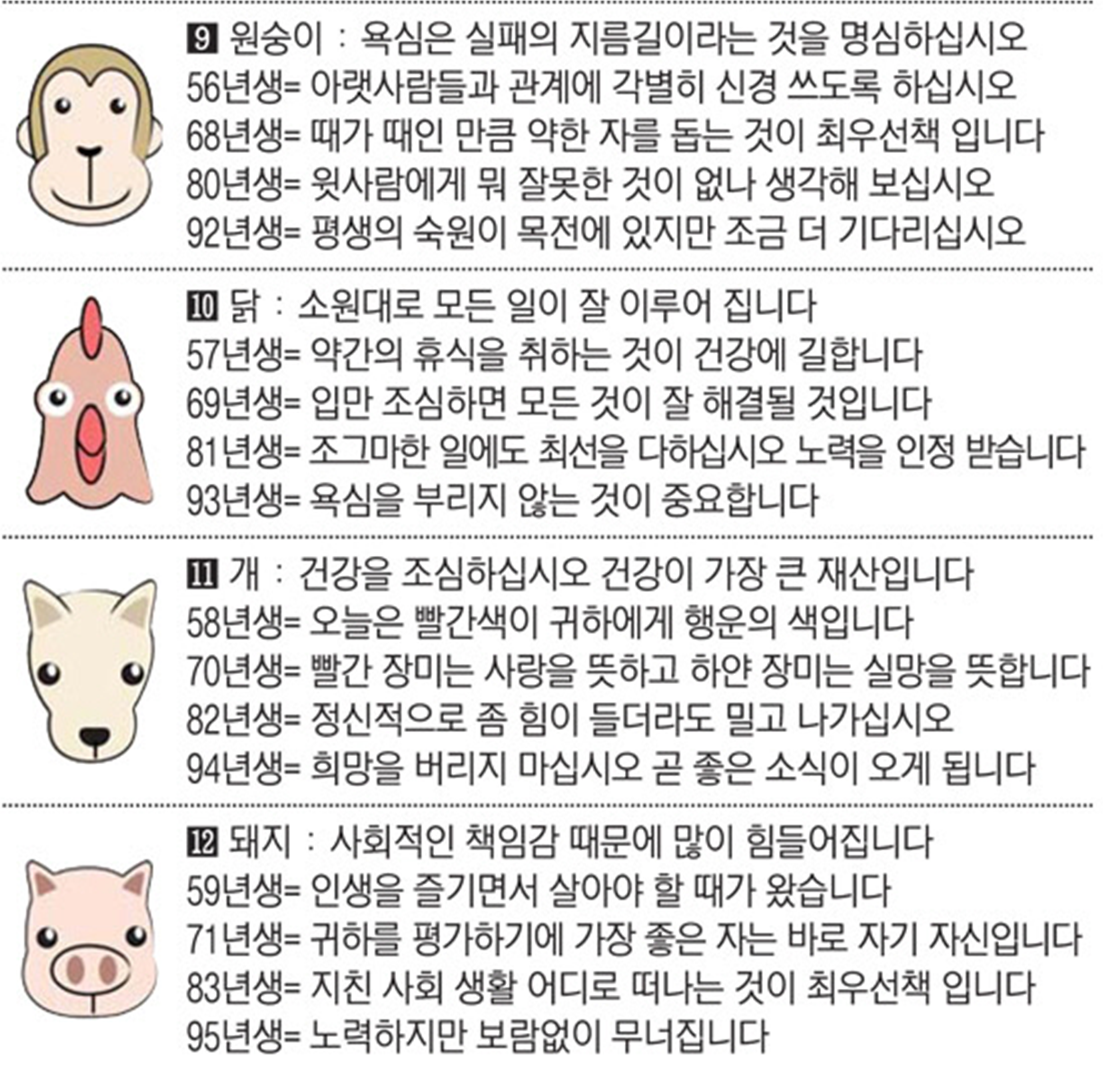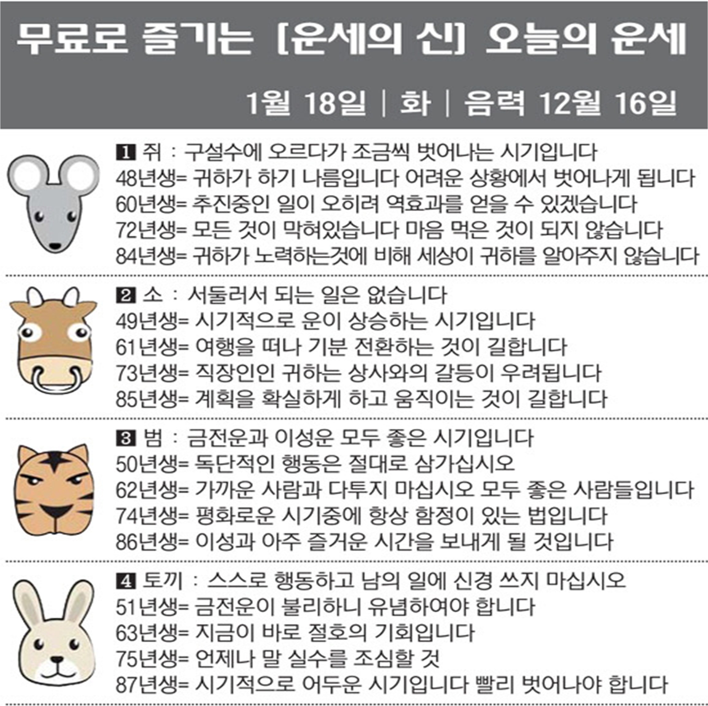 오늘의 운세 2022년 1월 18일 화요일 띠별운세 스포츠조선 2022. 1. 18. 08:49 ★2022 신년운세 보러가기 : https://bit.ly/360Jzf4 #운세의신 에서만 무료로 제공하는 운세 모음!▼ 1. #연애궁합 - http://bit.ly/2HGcNGC 2. #오늘의운세 - http://bit.ly/2Kvo4ra 3. #운명의상대 - http://bit.ly/2xjt3ss 4. #평생사주 - http://bit.ly/2rg8WWv 5. #재물운 -http://bit.ly/2rdQz4A 6. #자녀운 - http://bit.ly/2krNsSx