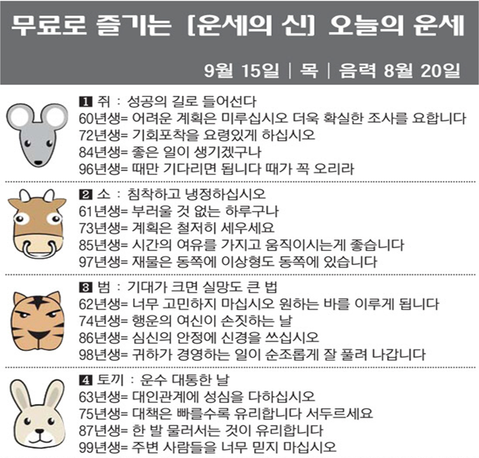 오늘의 운세 2022년 9월 15일 목요일 띠별운세 스포츠조선 2022. 9. 15. 08:43 #운세의신 에서만 무료로 제공하는 운세 모음!▼ 1. #연애궁합 - http://bit.ly/2HGcNGC 2. #오늘의운세 - http://bit.ly/2Kvo4ra 3. #운명의상대 - http://bit.ly/2xjt3ss 4. #평생사주 - http://bit.ly/2rg8WWv 5. #재물운 -http://bit.ly/2rdQz4A 6. #자녀운 - http://bit.ly/2krNsSx