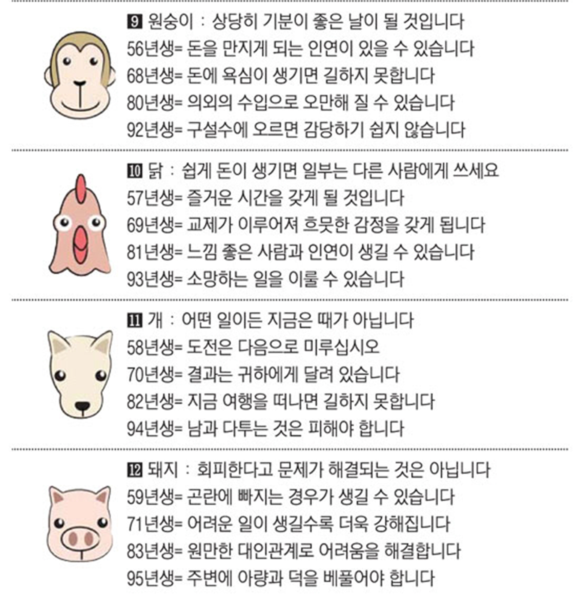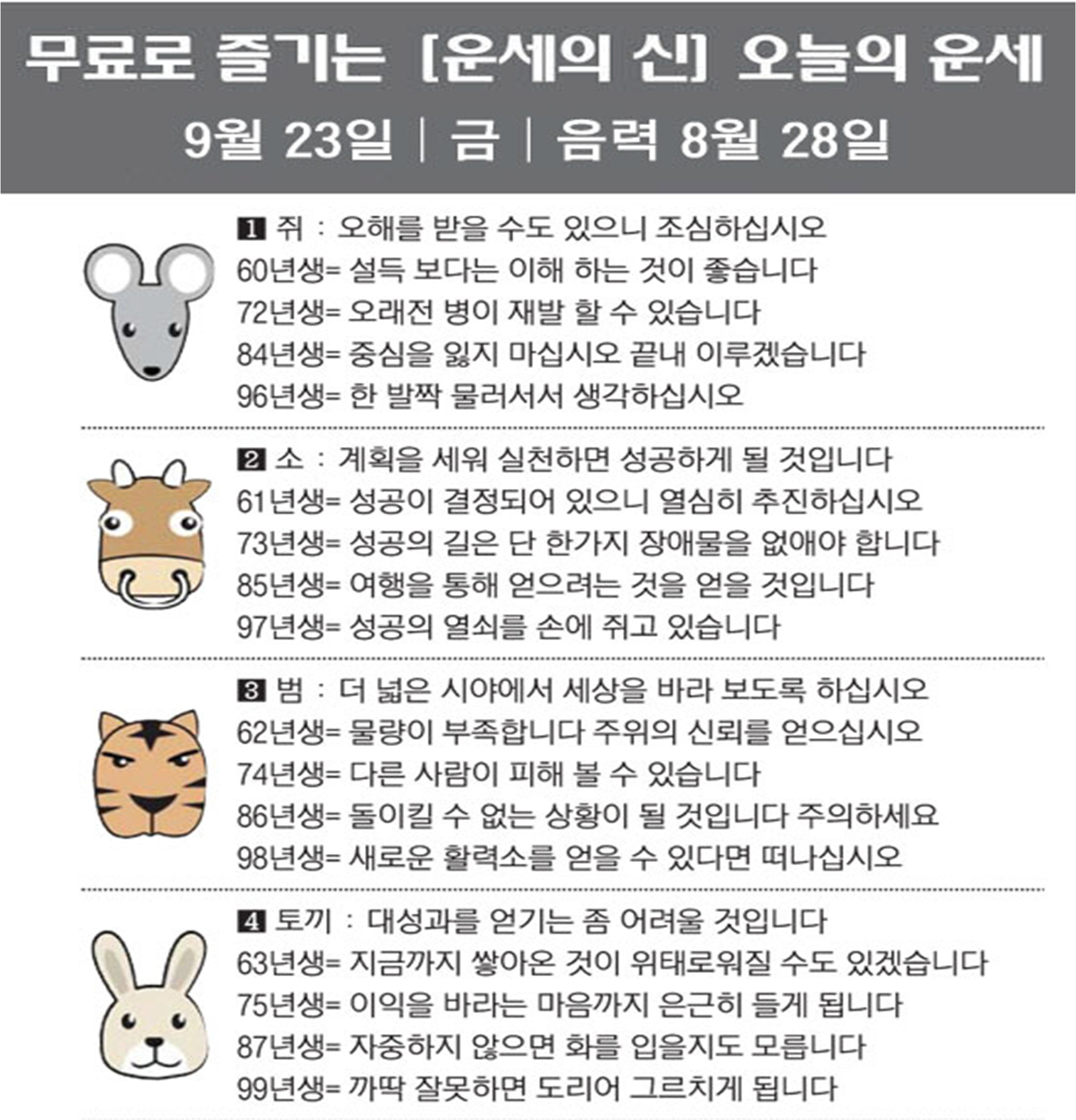 오늘의 운세 2022년 9월 23일 금요일 띠별운세 스포츠조선 2022. 9. 23. 08:44 #운세의신 에서만 무료로 제공하는 운세 모음!▼ 1. #연애궁합 - http://bit.ly/2HGcNGC 2. #오늘의운세 - http://bit.ly/2Kvo4ra 3. #운명의상대 - http://bit.ly/2xjt3ss 4. #평생사주 - http://bit.ly/2rg8WWv 5. #재물운 -http://bit.ly/2rdQz4A 6. #자녀운 - http://bit.ly/2krNsSx