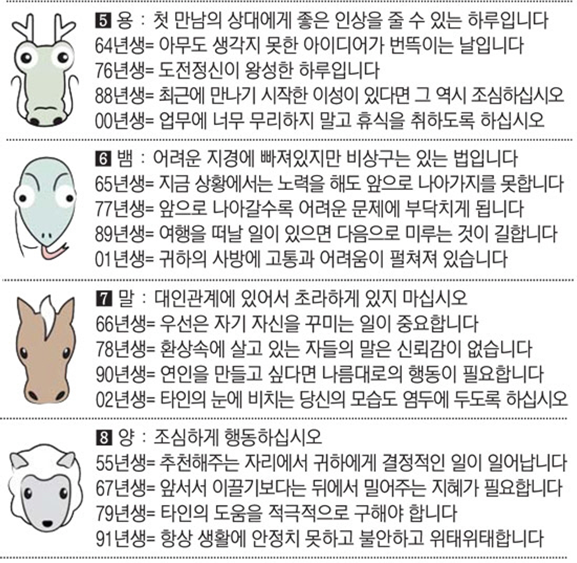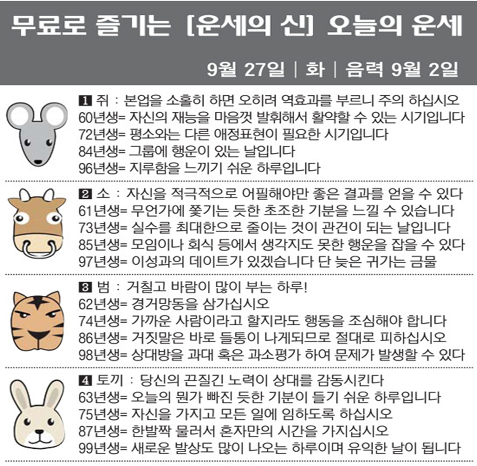 오늘의 운세 2022년 9월 27일 화요일 띠별운세 스포츠조선 2022. 9. 27. 08:38 #운세의신 에서만 무료로 제공하는 운세 모음!▼ 1. #연애궁합 - http://bit.ly/2HGcNGC 2. #오늘의운세 - http://bit.ly/2Kvo4ra 3. #운명의상대 - http://bit.ly/2xjt3ss 4. #평생사주 - http://bit.ly/2rg8WWv 5. #재물운 -http://bit.ly/2rdQz4A 6. #자녀운 - http://bit.ly/2krNsSx