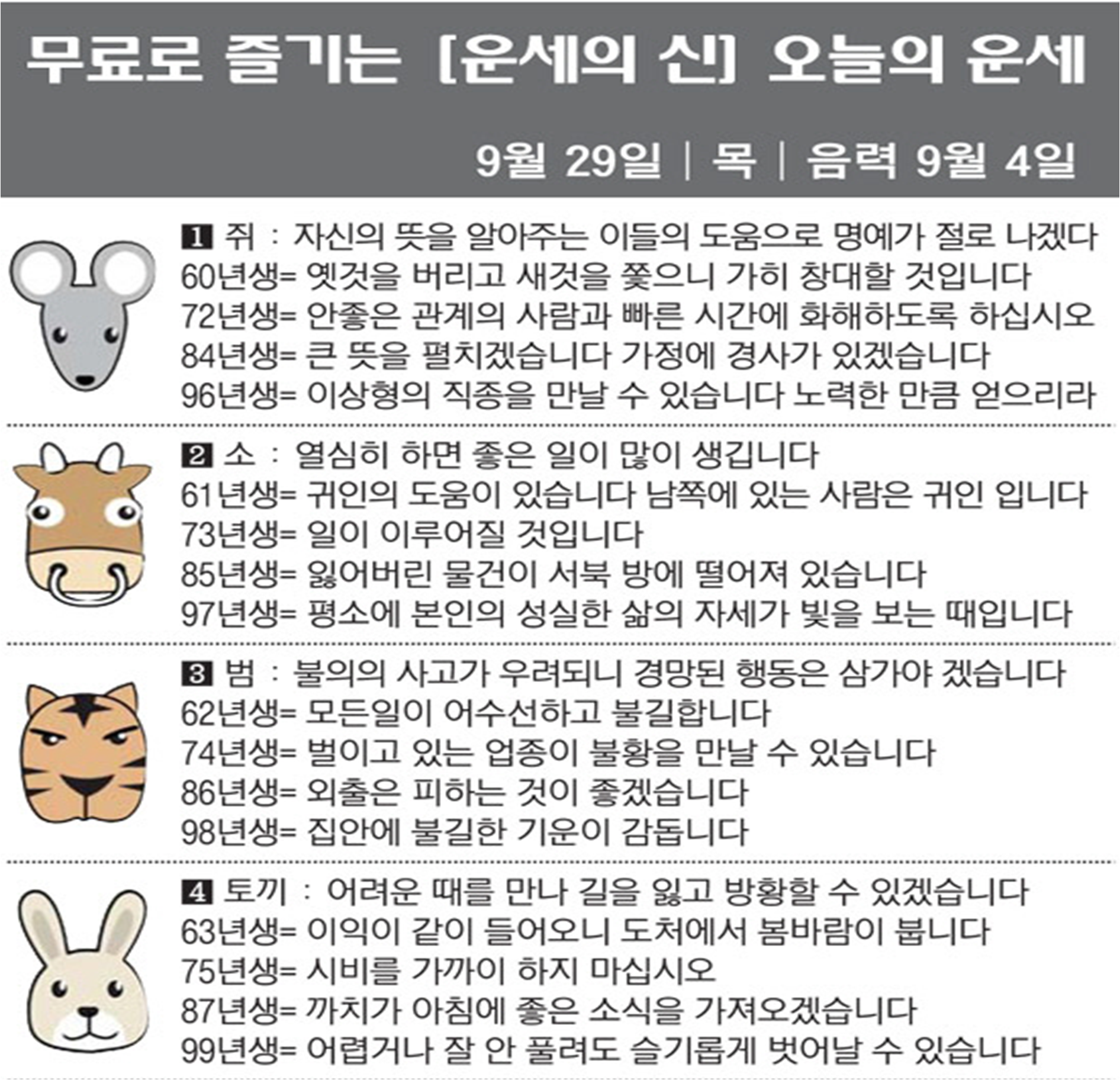 오늘의 운세 2022년 9월 29일 목요일 띠별운세 스포츠조선 2022. 9. 29. 08:34 #운세의신 에서만 무료로 제공하는 운세 모음!▼ 1. #연애궁합 - http://bit.ly/2HGcNGC 2. #오늘의운세 - http://bit.ly/2Kvo4ra 3. #운명의상대 - http://bit.ly/2xjt3ss 4. #평생사주 - http://bit.ly/2rg8WWv 5. #재물운 -http://bit.ly/2rdQz4A 6. #자녀운 - http://bit.ly/2krNsSx