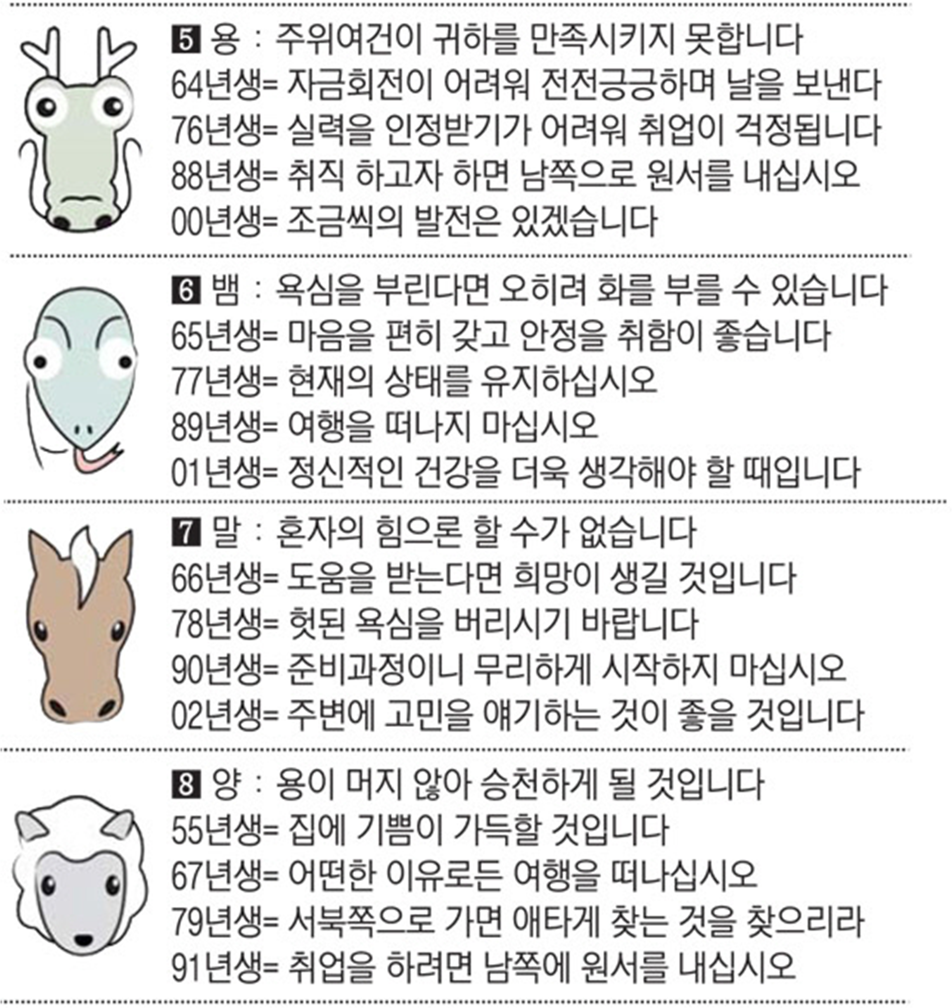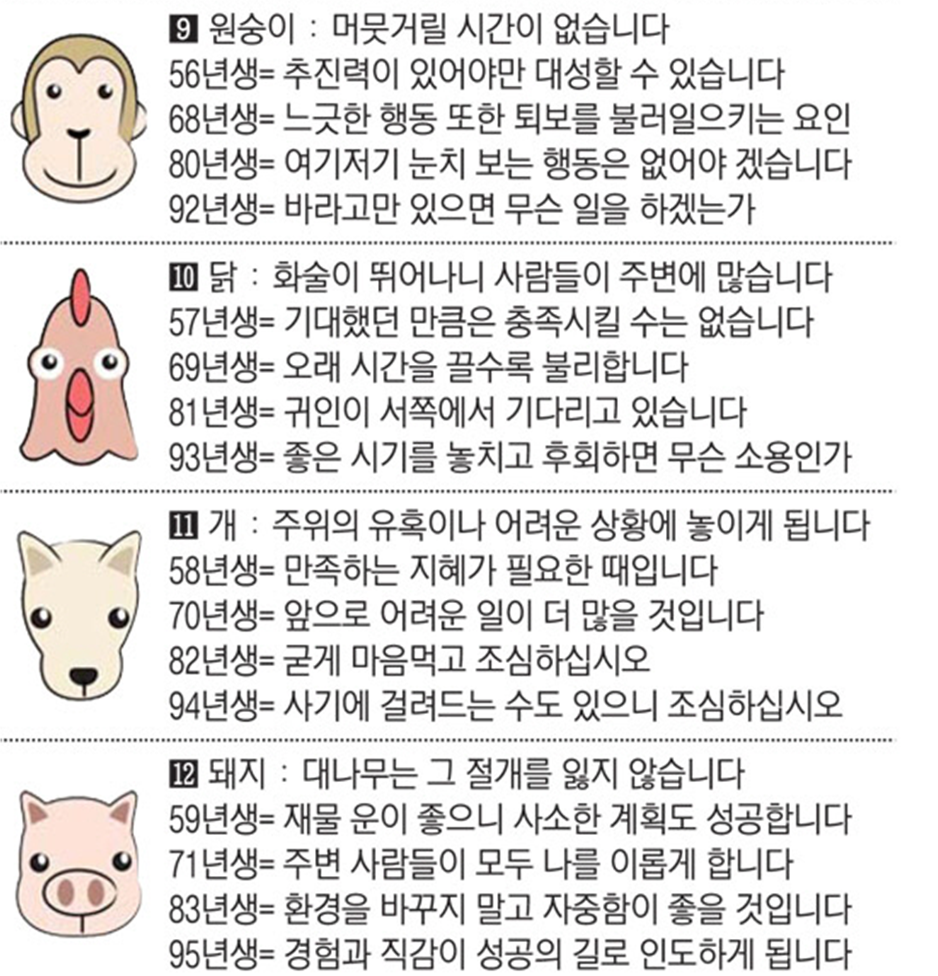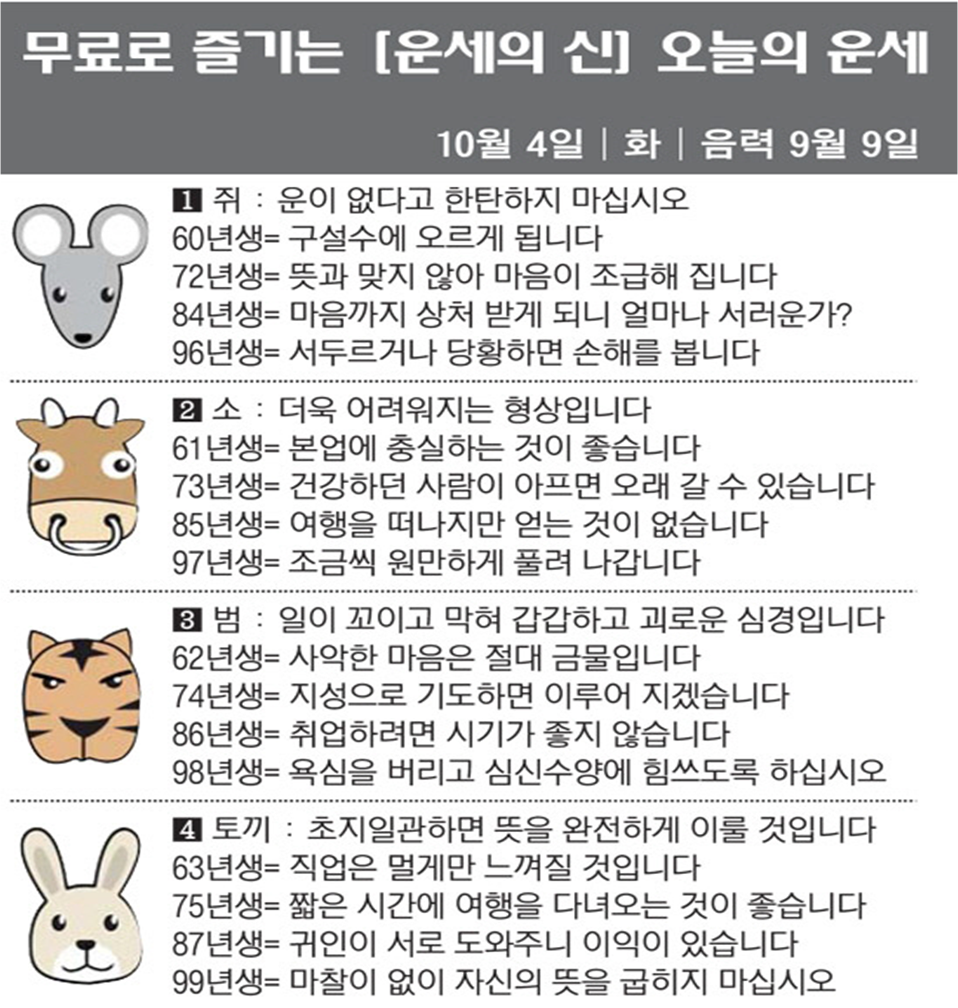 오늘의 운세 2022년 10월 4일 화요일 띠별운세 스포츠조선 2022. 10. 4. 08:33 #운세의신 에서만 무료로 제공하는 운세 모음!▼ 1. #연애궁합 - http://bit.ly/2HGcNGC 2. #오늘의운세 - http://bit.ly/2Kvo4ra 3. #운명의상대 - http://bit.ly/2xjt3ss 4. #평생사주 - http://bit.ly/2rg8WWv 5. #재물운 -http://bit.ly/2rdQz4A 6. #자녀운 - http://bit.ly/2krNsSx