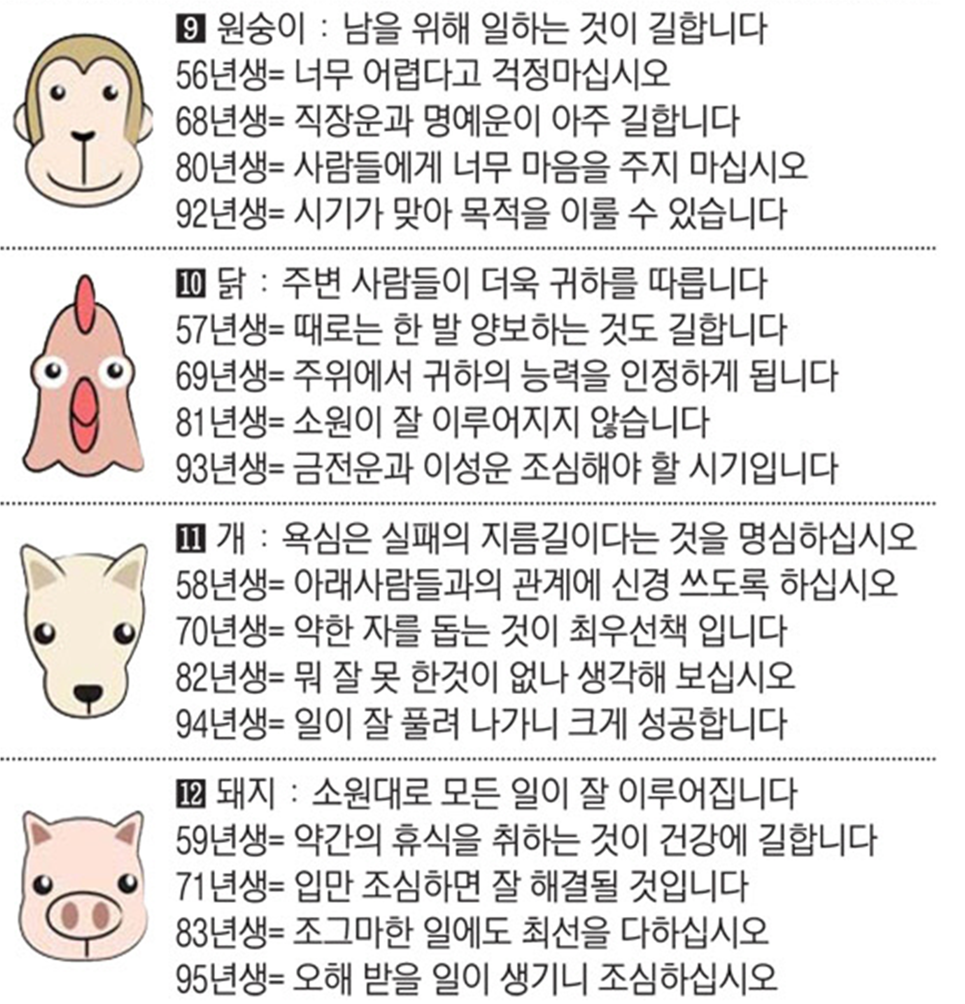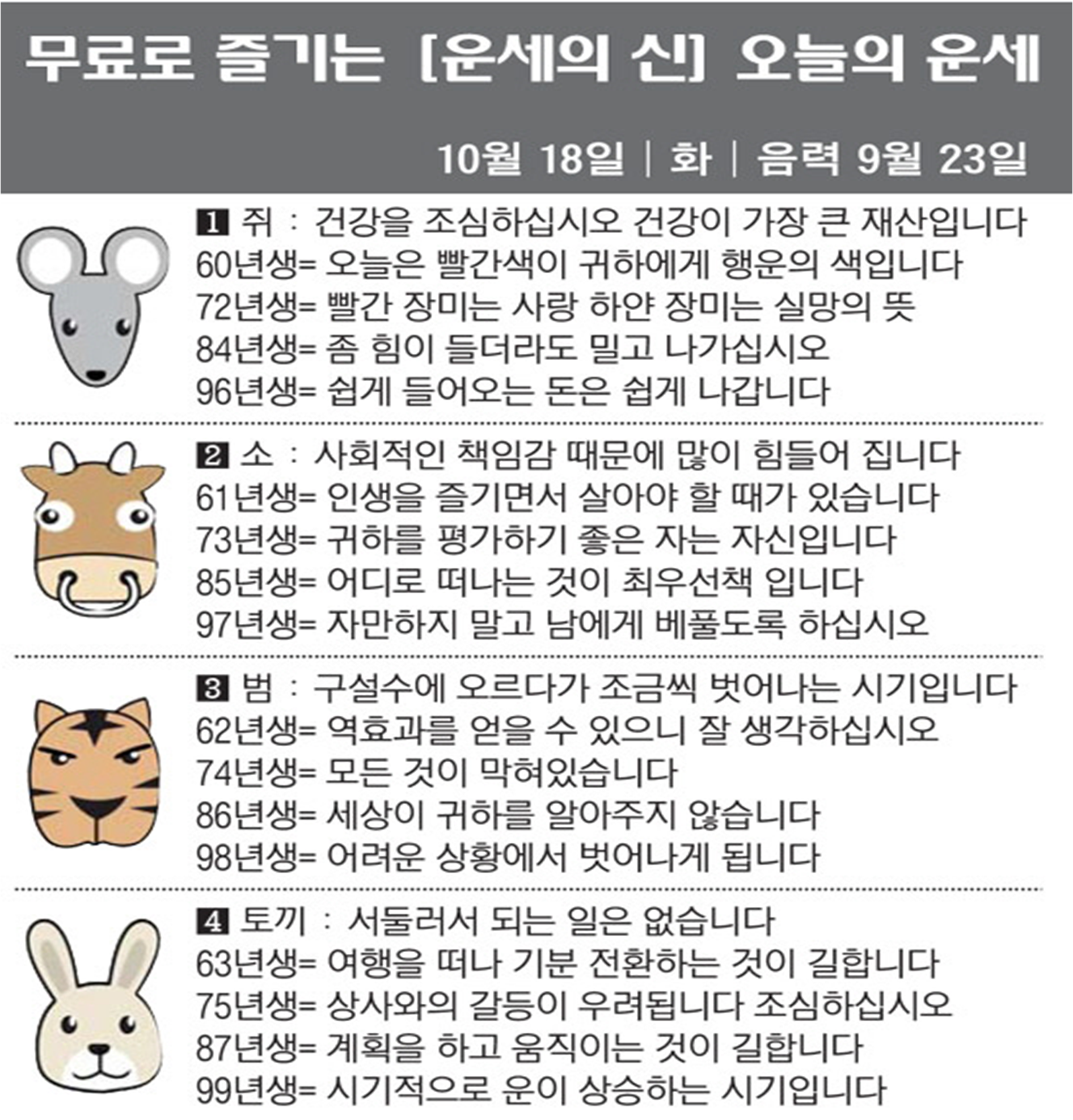 오늘의 운세 2022년 10월 18일 화요일 띠별운세 스포츠조선 2022. 10. 18. 08:36 #운세의신 에서만 무료로 제공하는 운세 모음!▼ 1. #연애궁합 - http://bit.ly/2HGcNGC 2. #오늘의운세 - http://bit.ly/2Kvo4ra 3. #운명의상대 - http://bit.ly/2xjt3ss 4. #평생사주 - http://bit.ly/2rg8WWv 5. #재물운 -http://bit.ly/2rdQz4A 6. #자녀운 - http://bit.ly/2krNsSx