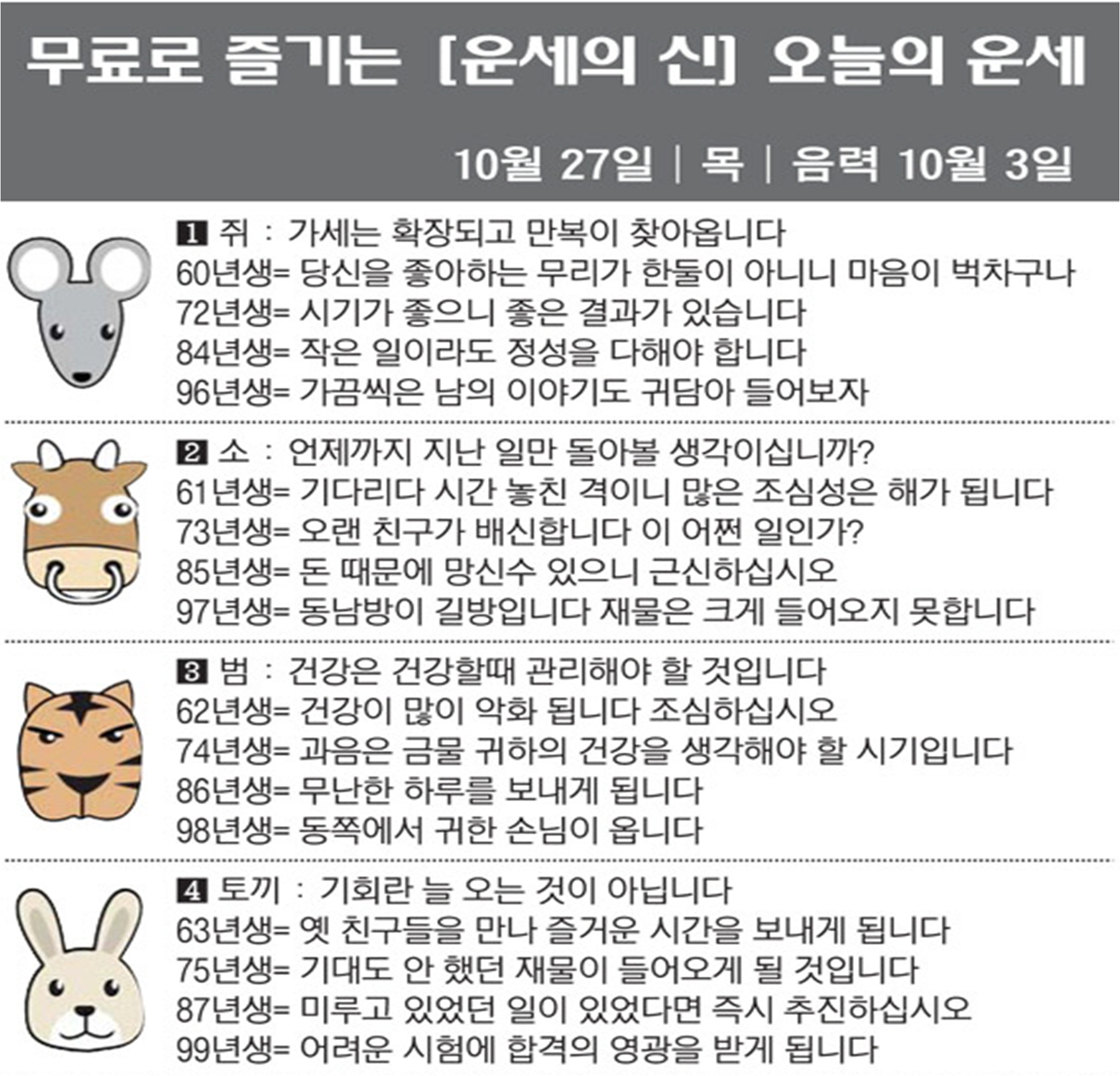 카테고리 없음 2022년 10월 27일 목요일 띠별운세 스포츠조선 2022. 10. 27. 08:55 #운세의신 에서만 무료로 제공하는 운세 모음!▼ 1. #연애궁합 - http://bit.ly/2HGcNGC 2. #오늘의운세 - http://bit.ly/2Kvo4ra 3. #운명의상대 - http://bit.ly/2xjt3ss 4. #평생사주 - http://bit.ly/2rg8WWv 5. #재물운 -http://bit.ly/2rdQz4A 6. #자녀운 - http://bit.ly/2krNsSx