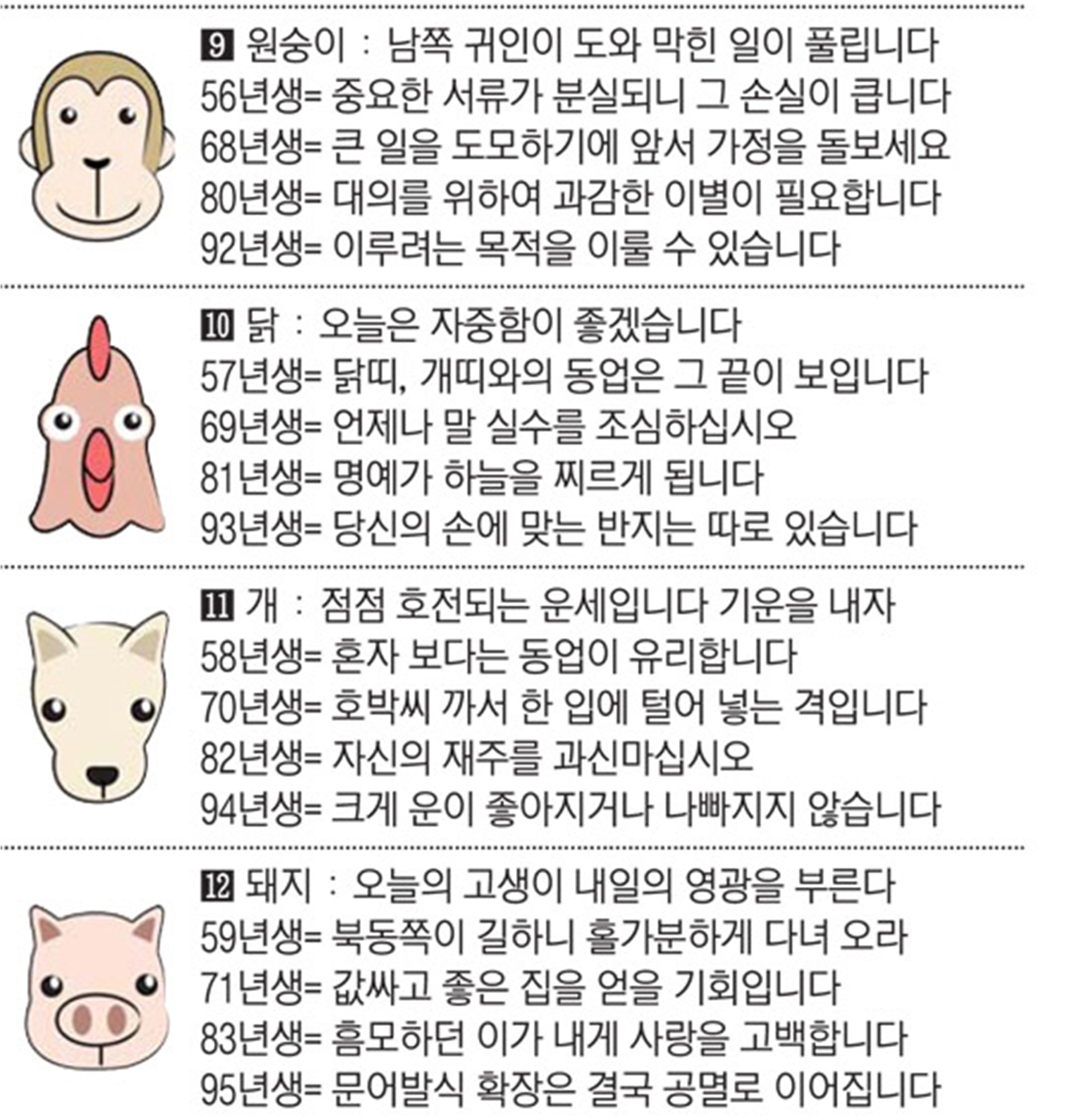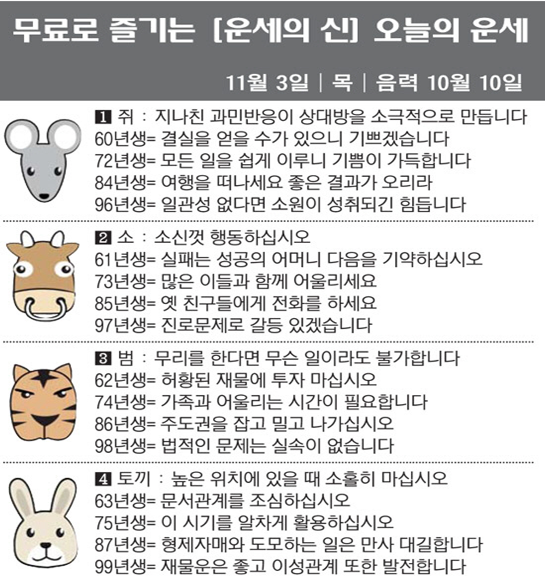 오늘의 운세 2022년 11월 3일 목요일 띠별운세 스포츠조선 2022. 11. 3. 08:50 ★2023년 신년운세 OPEN!! https://bit.ly/3NouAAT #운세의신 에서만 무료로 제공하는 운세 모음!▼ 1. #연애궁합 - http://bit.ly/2HGcNGC 2. #오늘의운세 - http://bit.ly/2Kvo4ra 3. #운명의상대 - http://bit.ly/2xjt3ss 4. #평생사주 - http://bit.ly/2rg8WWv 5. #재물운 -http://bit.ly/2rdQz4A 6. #자녀운 - http://bit.ly/2krNsSx