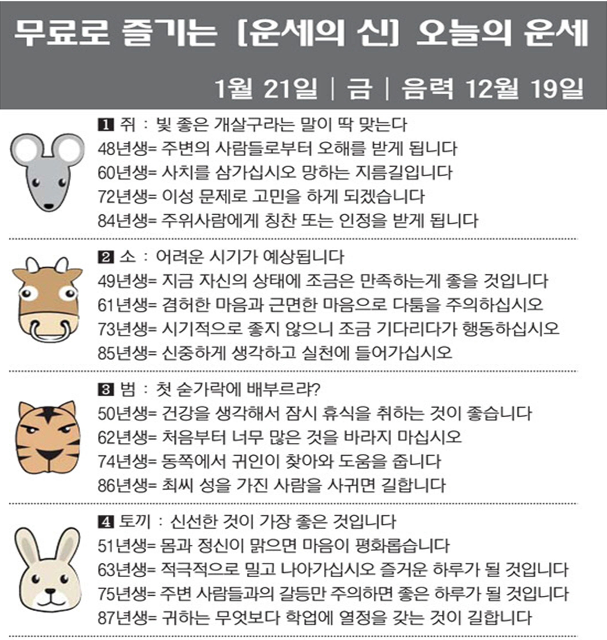 오늘의 운세 2022년 1월 21일 금요일 띠별운세 스포츠조선 2022. 1. 21. 08:45 ★2022 신년운세 보러가기 : https://bit.ly/360Jzf4 #운세의신 에서만 무료로 제공하는 운세 모음!▼ 1. #연애궁합 - http://bit.ly/2HGcNGC 2. #오늘의운세 - http://bit.ly/2Kvo4ra 3. #운명의상대 - http://bit.ly/2xjt3ss 4. #평생사주 - http://bit.ly/2rg8WWv 5. #재물운 -http://bit.ly/2rdQz4A 6. #자녀운 - http://bit.ly/2krNsSx