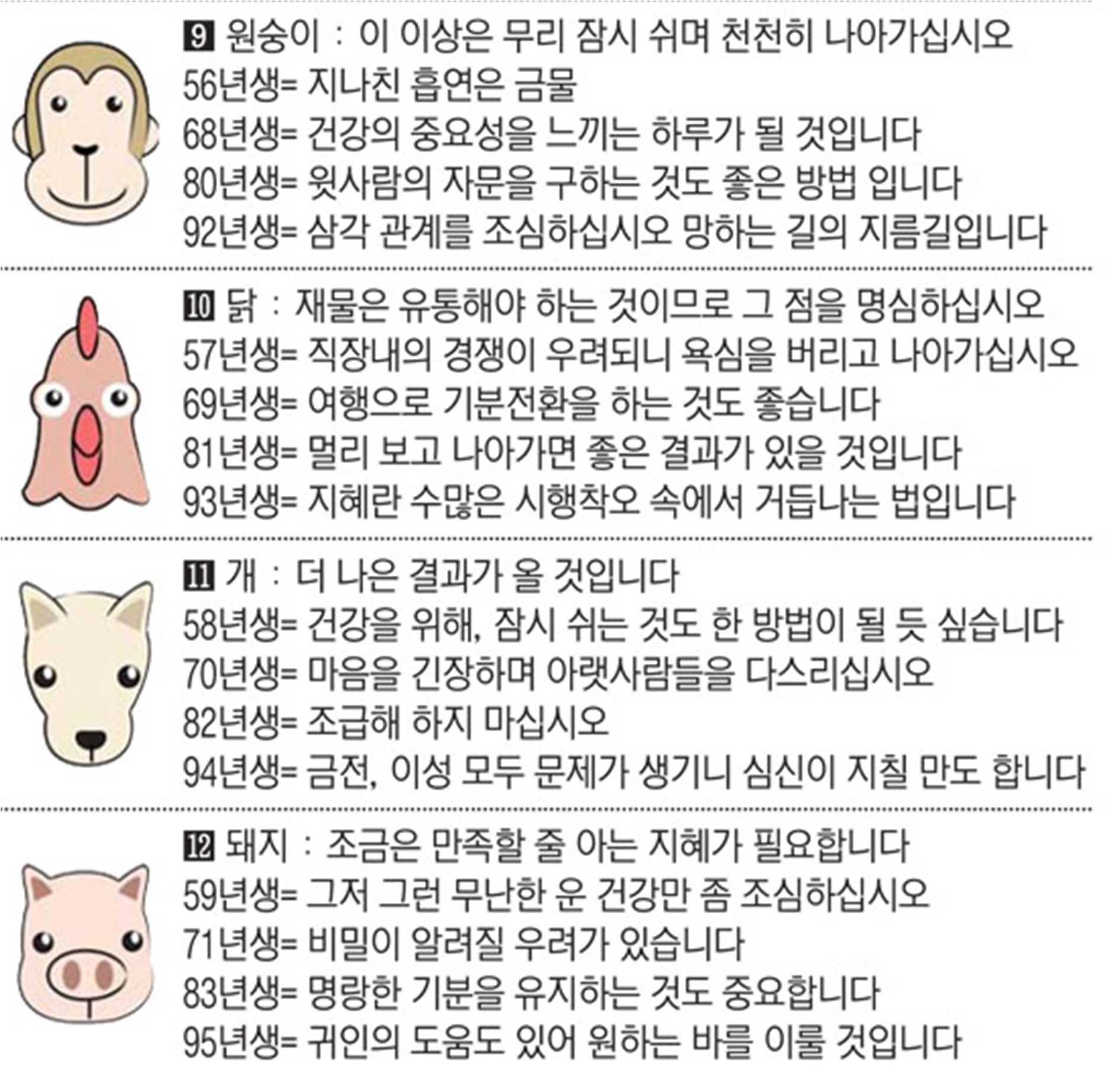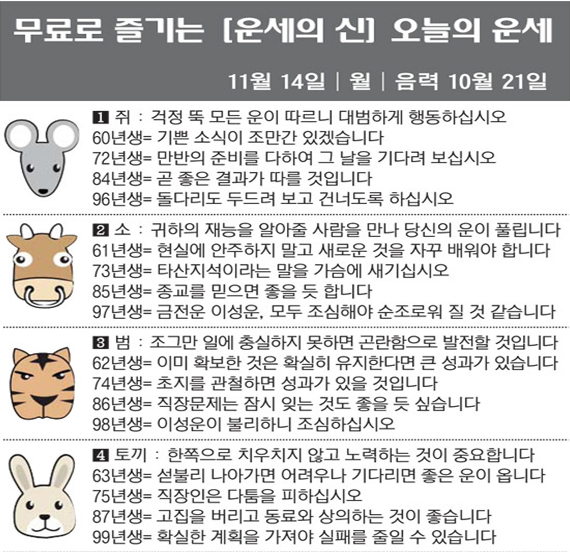 오늘의 운세 2022년 11월 14일 월요일 띠별운세 스포츠조선 2022. 11. 14. 09:07 ★2023년 신년운세 OPEN!! https://bit.ly/3NouAAT #운세의신 에서만 무료로 제공하는 운세 모음!▼ 1. #연애궁합 - http://bit.ly/2HGcNGC 2. #오늘의운세 - http://bit.ly/2Kvo4ra 3. #운명의상대 - http://bit.ly/2xjt3ss 4. #평생사주 - http://bit.ly/2rg8WWv 5. #재물운 -http://bit.ly/2rdQz4A 6. #자녀운 - http://bit.ly/2krNsSx