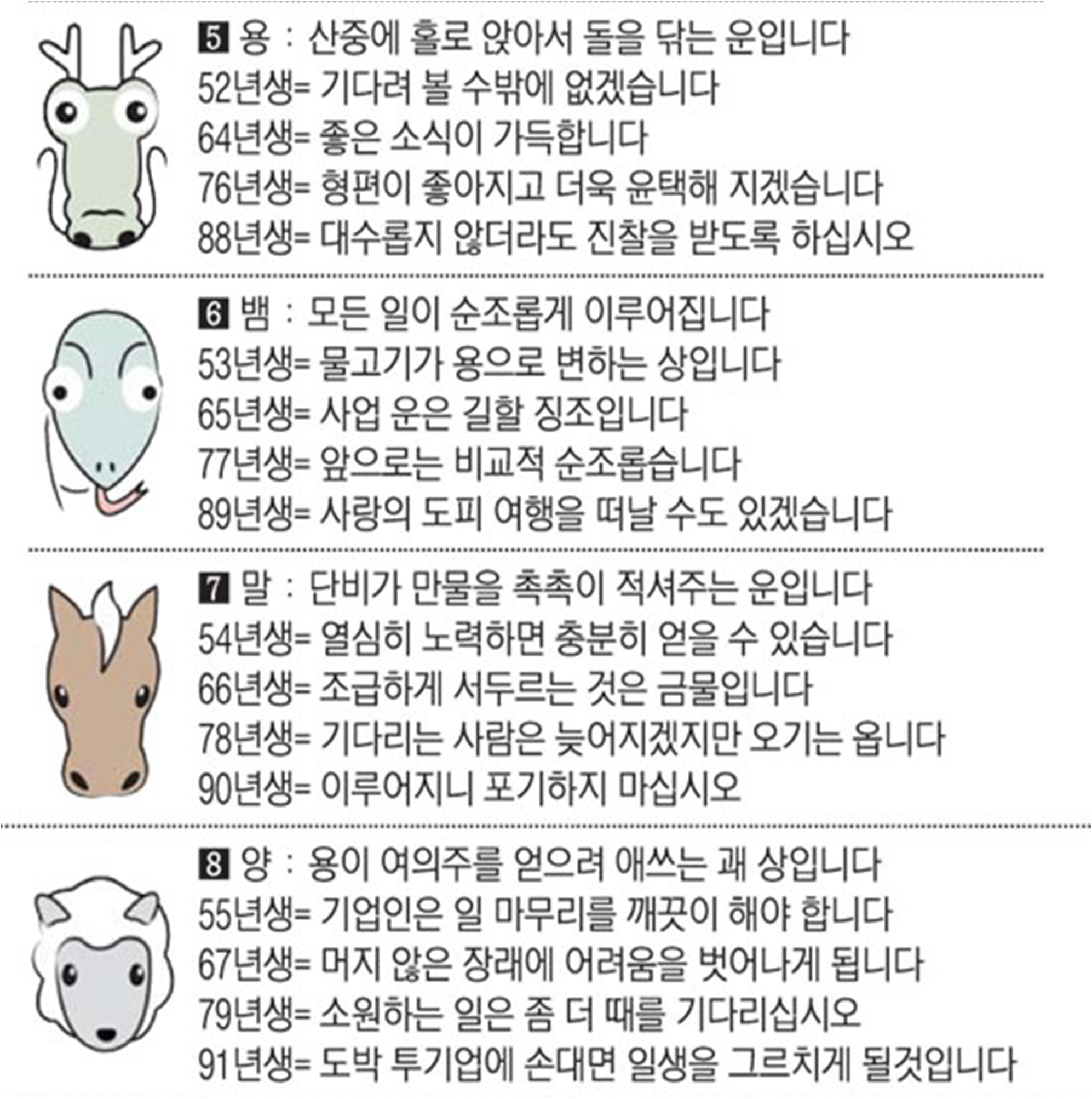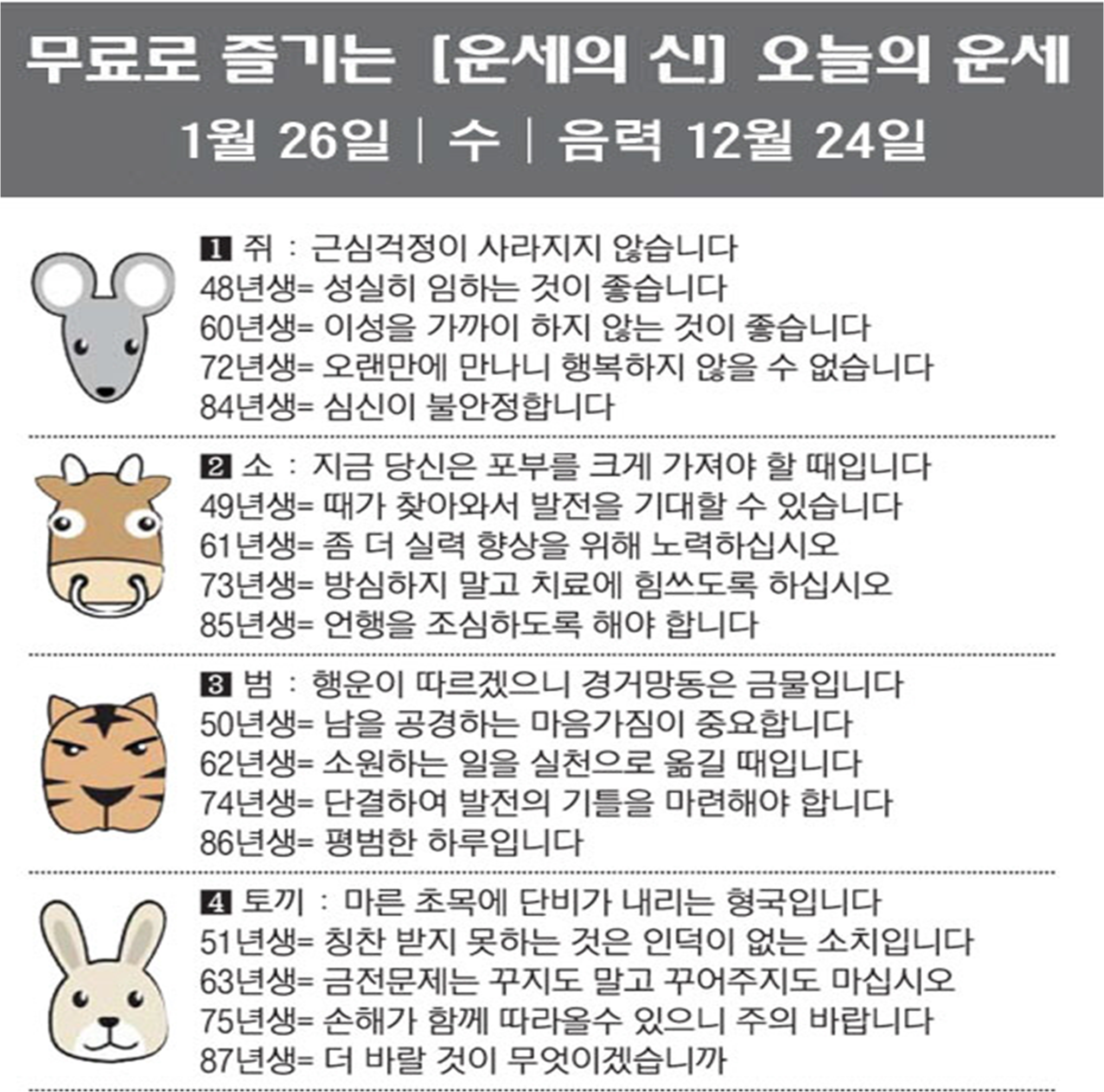 오늘의 운세 2022년 1월 26일 수요일 띠별운세 스포츠조선 2022. 1. 26. 08:53 ★2022 신년운세 보러가기 : https://bit.ly/360Jzf4 #운세의신 에서만 무료로 제공하는 운세 모음!▼ 1. #연애궁합 - http://bit.ly/2HGcNGC 2. #오늘의운세 - http://bit.ly/2Kvo4ra 3. #운명의상대 - http://bit.ly/2xjt3ss 4. #평생사주 - http://bit.ly/2rg8WWv 5. #재물운 -http://bit.ly/2rdQz4A 6. #자녀운 - http://bit.ly/2krNsSx