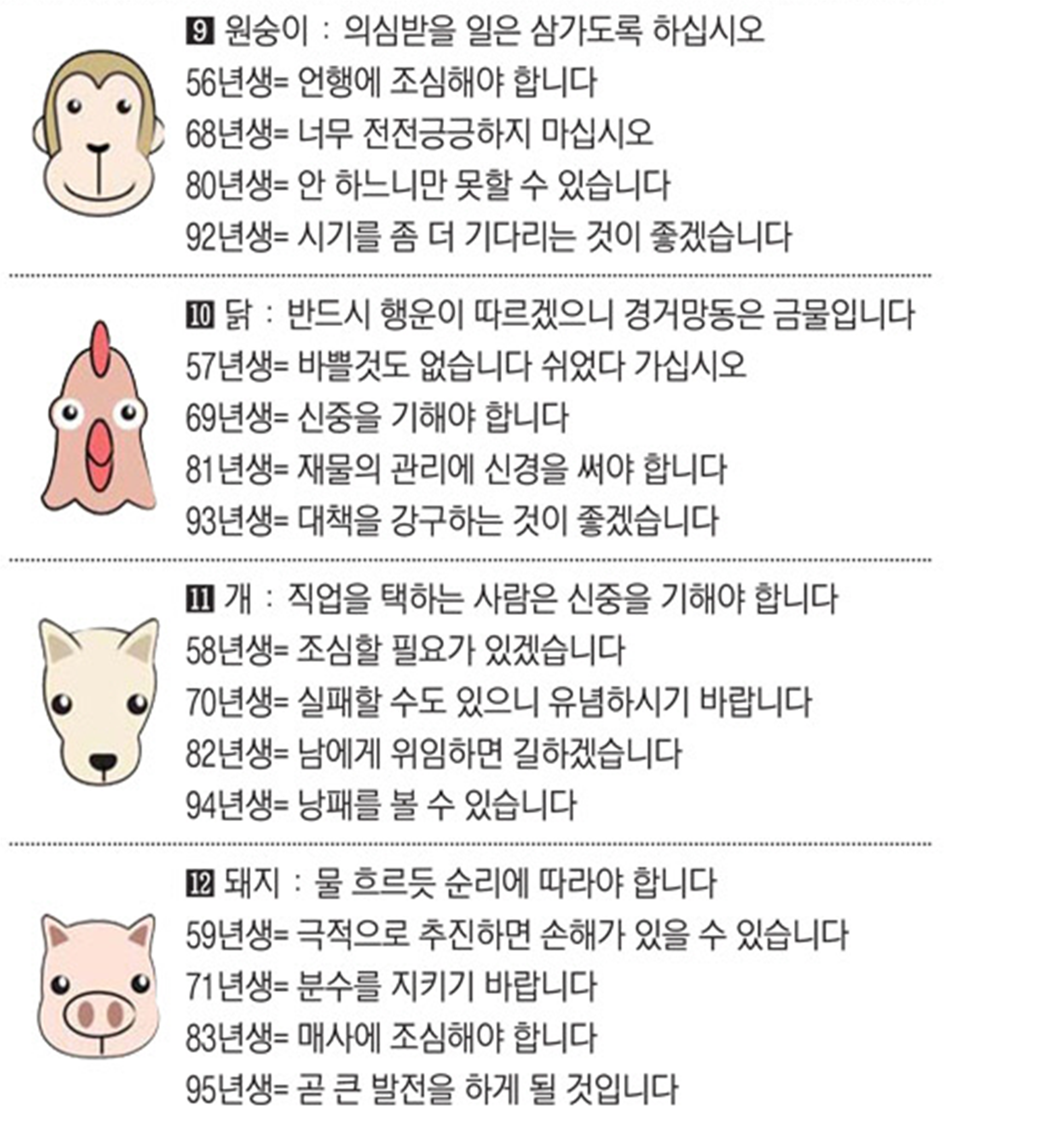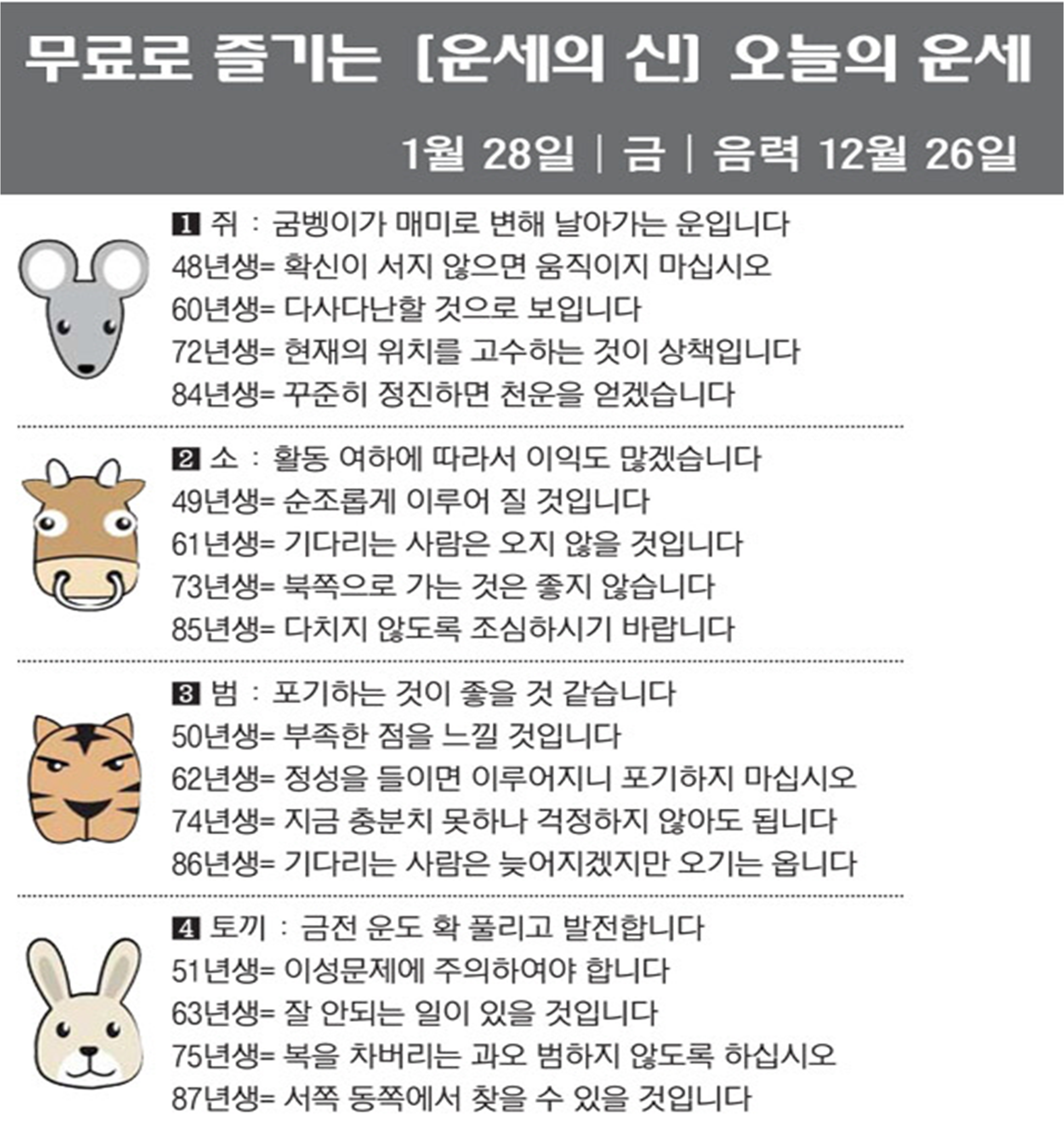오늘의 운세 2022년 1월 28일 금요일 띠별운세 스포츠조선 2022. 1. 28. 08:36 ★2022 신년운세 보러가기 : https://bit.ly/360Jzf4 #운세의신 에서만 무료로 제공하는 운세 모음!▼ 1. #연애궁합 - http://bit.ly/2HGcNGC 2. #오늘의운세 - http://bit.ly/2Kvo4ra 3. #운명의상대 - http://bit.ly/2xjt3ss 4. #평생사주 - http://bit.ly/2rg8WWv 5. #재물운 -http://bit.ly/2rdQz4A 6. #자녀운 - http://bit.ly/2krNsSx