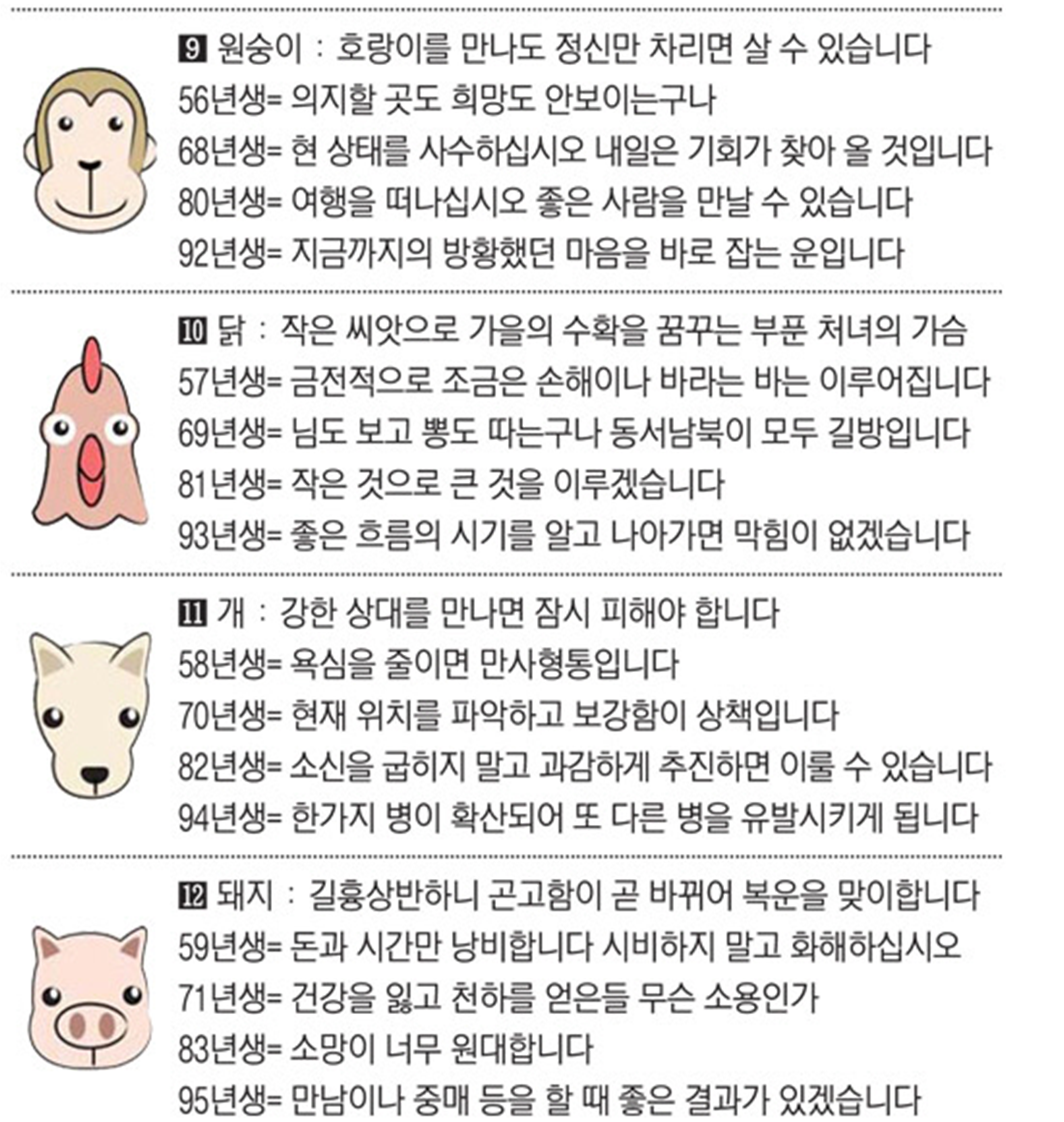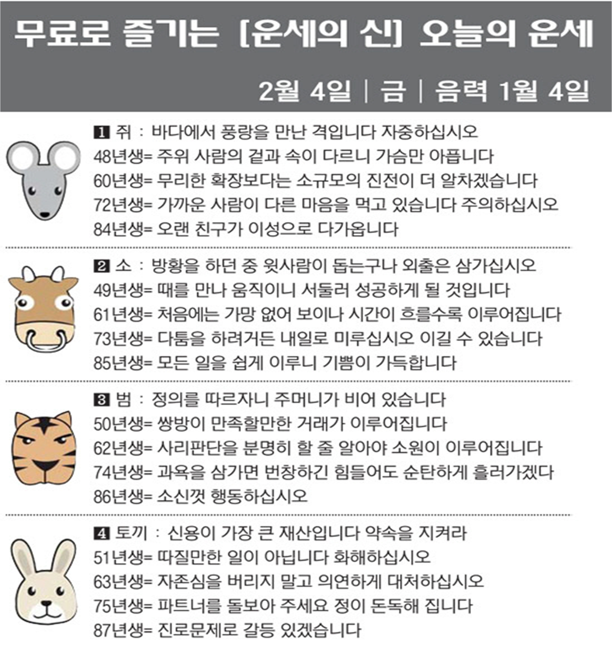 오늘의 운세 2022년 2월 4일 금요일 띠별운세 스포츠조선 2022. 2. 4. 08:43 ★2022 신년운세 보러가기 : https://bit.ly/360Jzf4 #운세의신 에서만 무료로 제공하는 운세 모음!▼ 1. #연애궁합 - http://bit.ly/2HGcNGC 2. #오늘의운세 - http://bit.ly/2Kvo4ra 3. #운명의상대 - http://bit.ly/2xjt3ss 4. #평생사주 - http://bit.ly/2rg8WWv 5. #재물운 -http://bit.ly/2rdQz4A 6. #자녀운 - http://bit.ly/2krNsSx