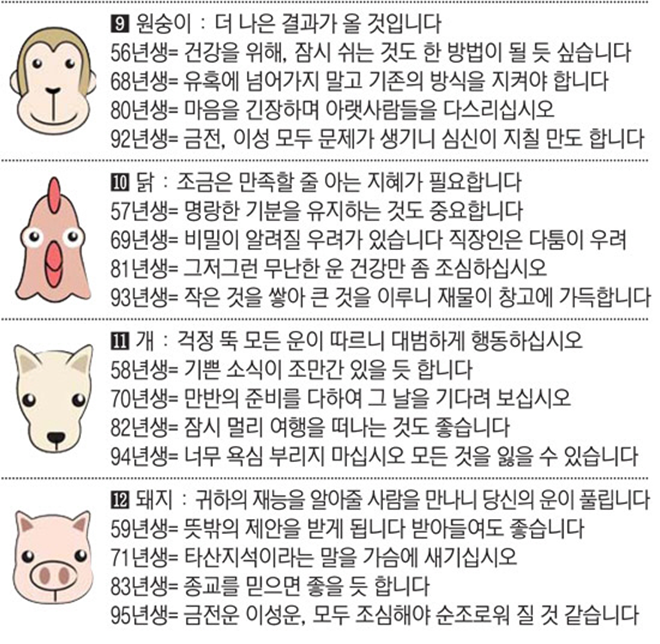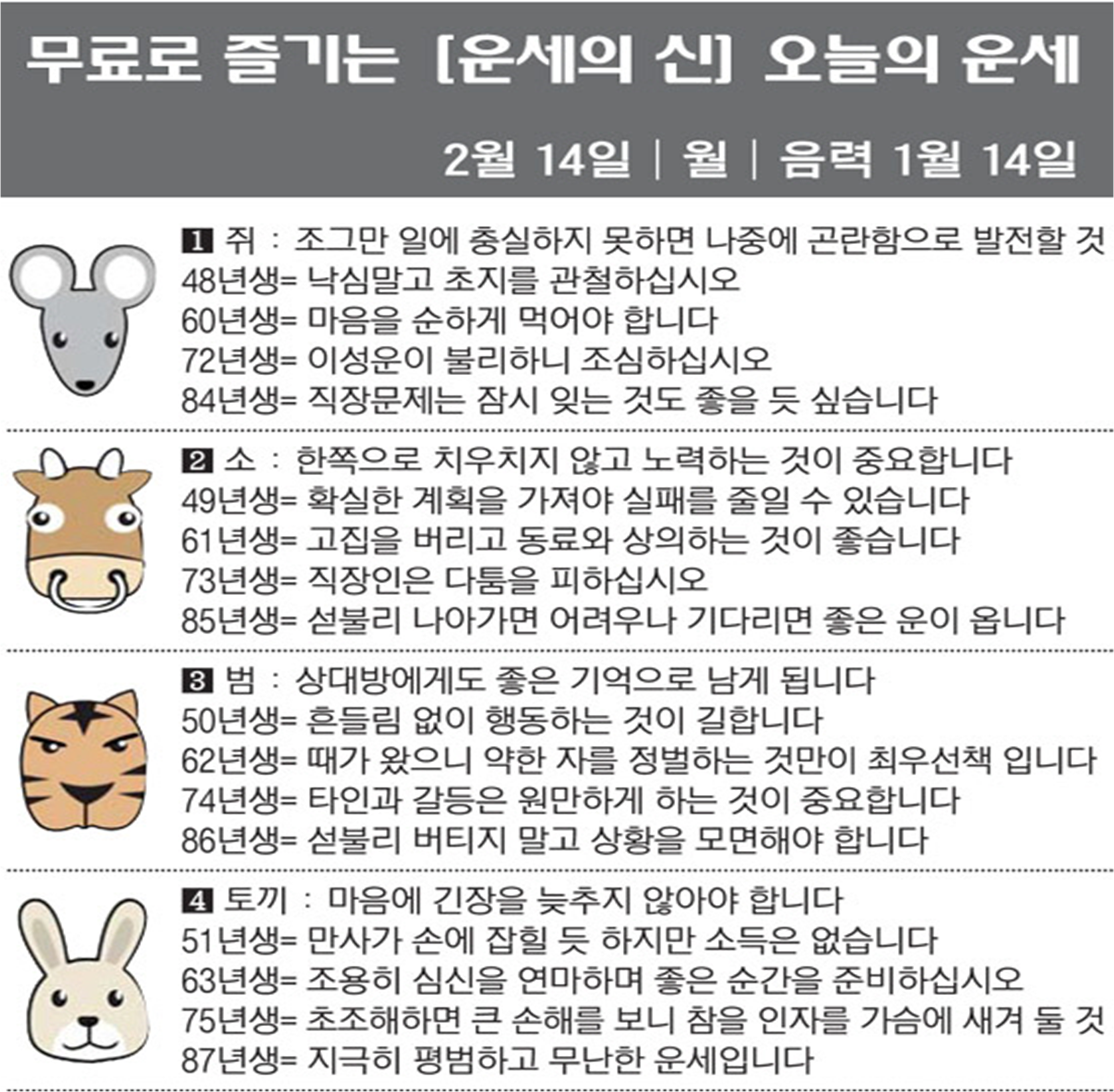 오늘의 운세 2022년 2월 14일 월요일 띠별운세 스포츠조선 2022. 2. 14. 08:44 ★2022 신년운세 보러가기 : https://bit.ly/360Jzf4 #운세의신 에서만 무료로 제공하는 운세 모음!▼ 1. #연애궁합 - http://bit.ly/2HGcNGC 2. #오늘의운세 - http://bit.ly/2Kvo4ra 3. #운명의상대 - http://bit.ly/2xjt3ss 4. #평생사주 - http://bit.ly/2rg8WWv 5. #재물운 -http://bit.ly/2rdQz4A 6. #자녀운 - http://bit.ly/2krNsSx