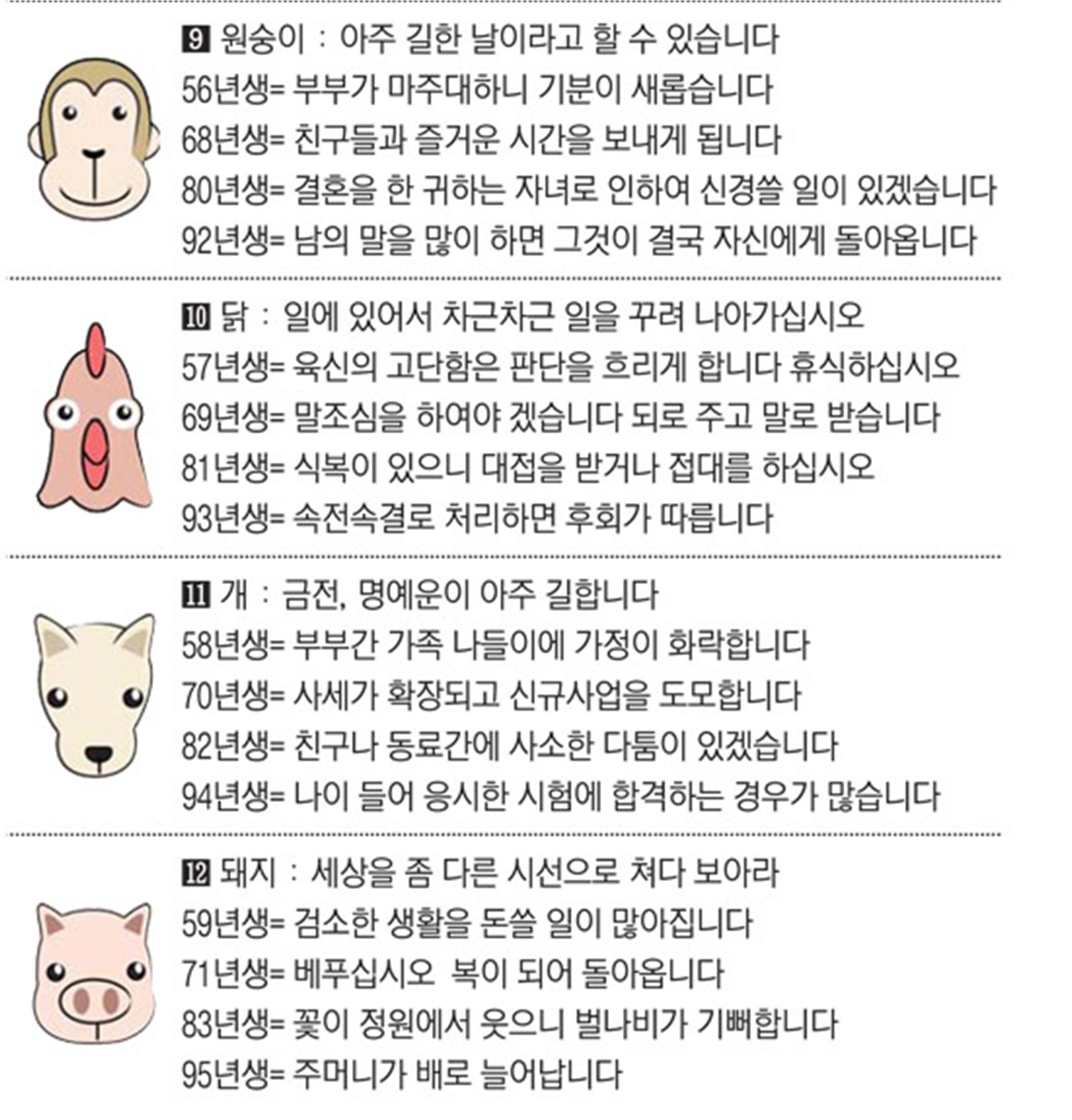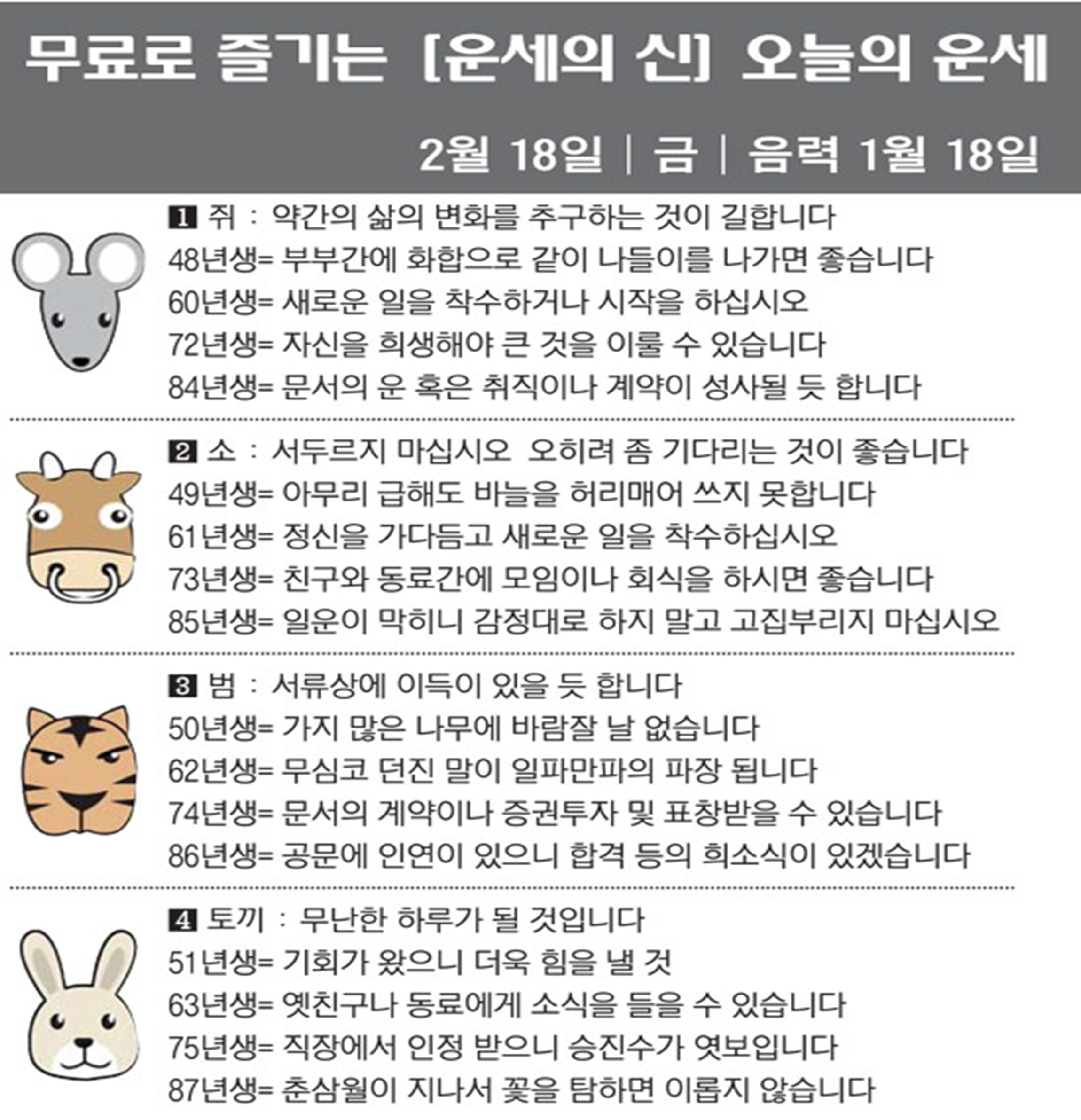 오늘의 운세 2022년 2월 18일 금요일 띠별운세 스포츠조선 2022. 2. 18. 08:40 ★2022 신년운세 보러가기 : https://bit.ly/360Jzf4 #운세의신 에서만 무료로 제공하는 운세 모음!▼ 1. #연애궁합 - http://bit.ly/2HGcNGC 2. #오늘의운세 - http://bit.ly/2Kvo4ra 3. #운명의상대 - http://bit.ly/2xjt3ss 4. #평생사주 - http://bit.ly/2rg8WWv 5. #재물운 -http://bit.ly/2rdQz4A 6. #자녀운 - http://bit.ly/2krNsSx