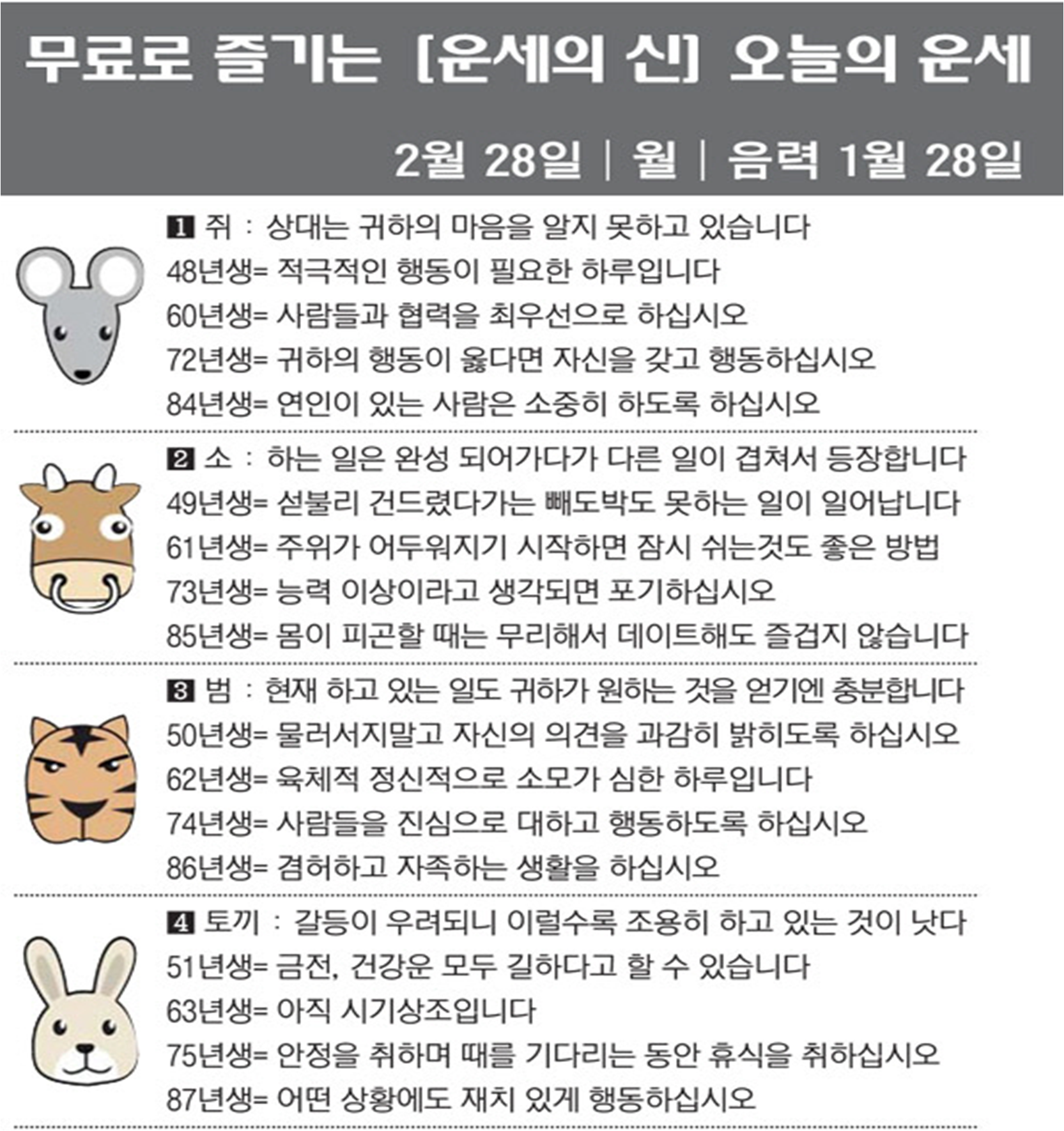 오늘의 운세 2022년 2월 28일 월요일 띠별운세 스포츠조선 2022. 2. 28. 08:44 ★2022 신년운세 보러가기 : https://bit.ly/360Jzf4 #운세의신 에서만 무료로 제공하는 운세 모음!▼ 1. #연애궁합 - http://bit.ly/2HGcNGC 2. #오늘의운세 - http://bit.ly/2Kvo4ra 3. #운명의상대 - http://bit.ly/2xjt3ss 4. #평생사주 - http://bit.ly/2rg8WWv 5. #재물운 -http://bit.ly/2rdQz4A 6. #자녀운 - http://bit.ly/2krNsSx