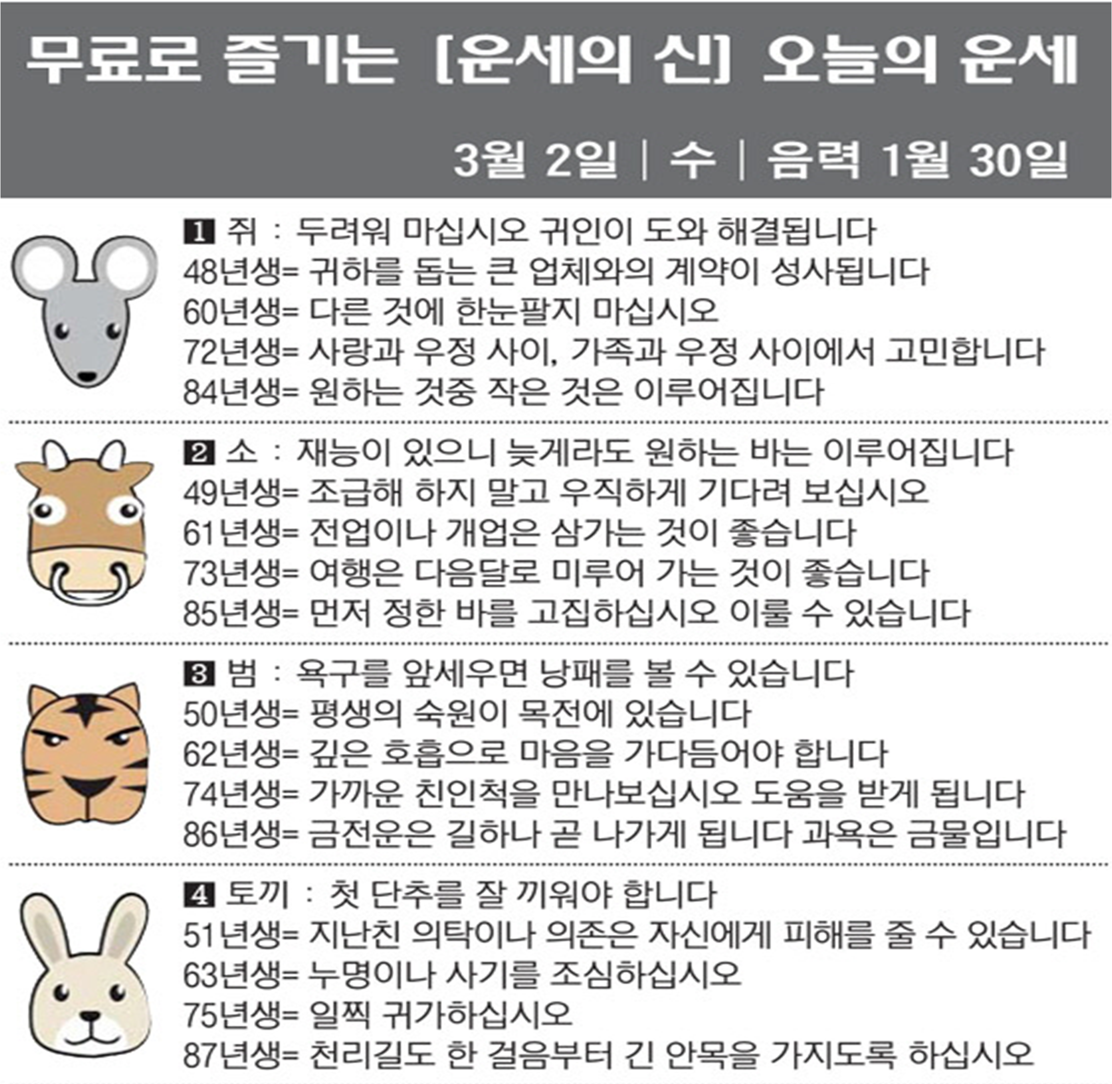 오늘의 운세 2022년 3월 2일 수요일 띠별운세 스포츠조선 2022. 3. 2. 08:39 ★2022 신년운세 보러가기 : https://bit.ly/360Jzf4 #운세의신 에서만 무료로 제공하는 운세 모음!▼ 1. #연애궁합 - http://bit.ly/2HGcNGC 2. #오늘의운세 - http://bit.ly/2Kvo4ra 3. #운명의상대 - http://bit.ly/2xjt3ss 4. #평생사주 - http://bit.ly/2rg8WWv 5. #재물운 -http://bit.ly/2rdQz4A 6. #자녀운 - http://bit.ly/2krNsSx