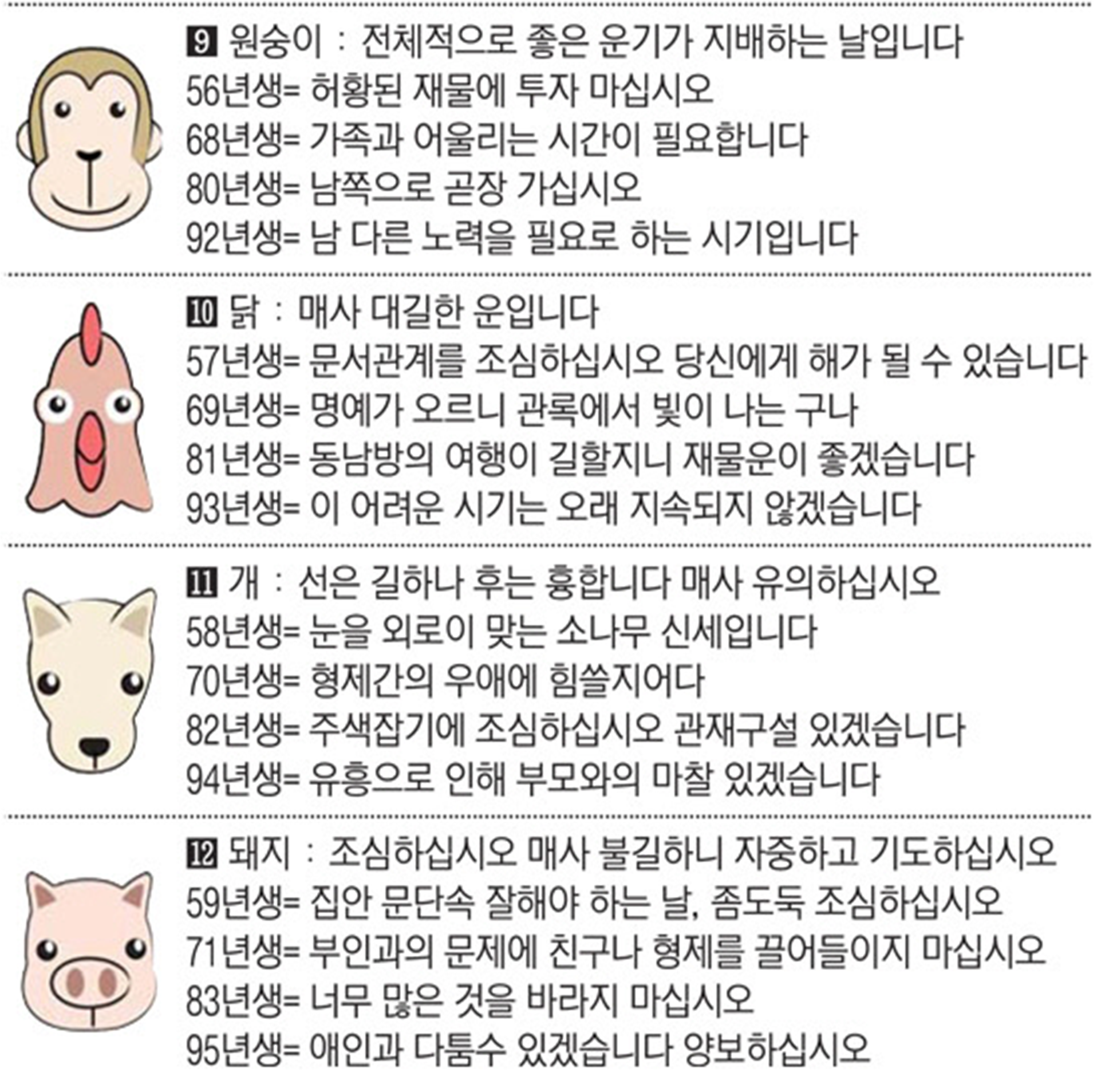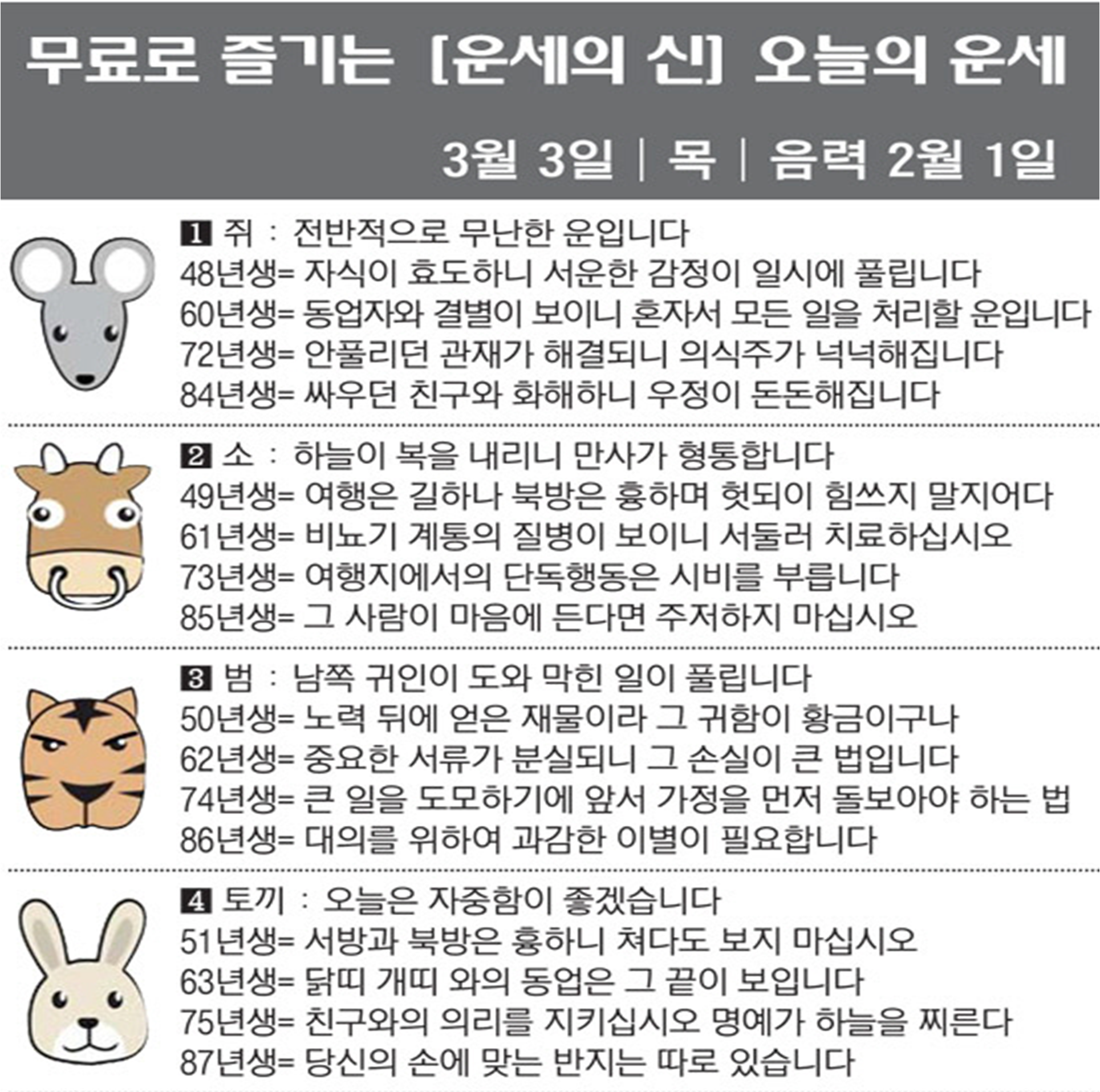 오늘의 운세 2022년 3월 3일 목요일 띠별운세 스포츠조선 2022. 3. 3. 09:01 ★2022 신년운세 보러가기 : https://bit.ly/360Jzf4 #운세의신 에서만 무료로 제공하는 운세 모음!▼ 1. #연애궁합 - http://bit.ly/2HGcNGC 2. #오늘의운세 - http://bit.ly/2Kvo4ra 3. #운명의상대 - http://bit.ly/2xjt3ss 4. #평생사주 - http://bit.ly/2rg8WWv 5. #재물운 -http://bit.ly/2rdQz4A 6. #자녀운 - http://bit.ly/2krNsSx