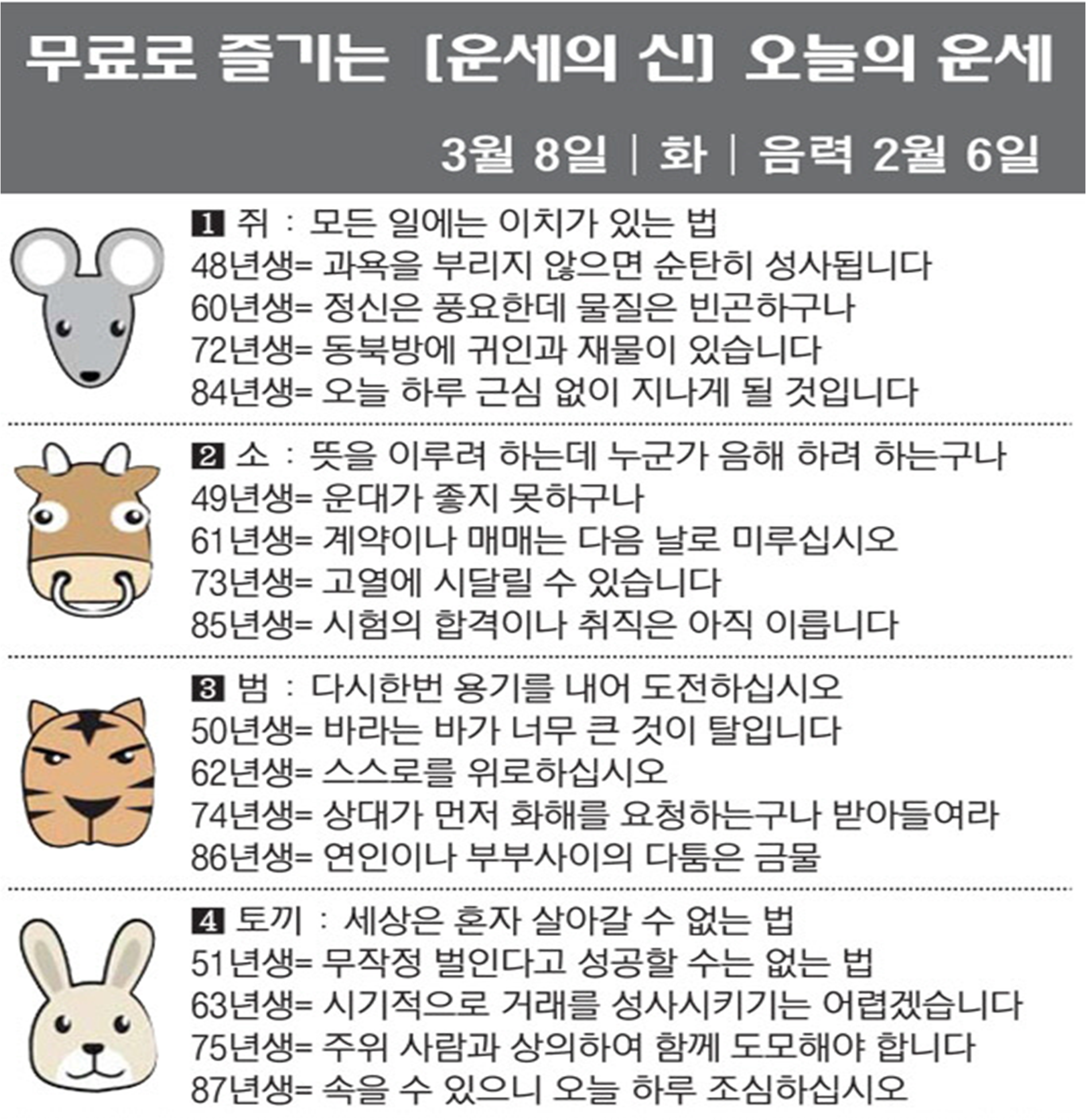 오늘의 운세 2022년 3월 8일 화요일 #띠별운세 스포츠조선 2022. 3. 8. 08:34 ★2022 신년운세 보러가기 : https://bit.ly/360Jzf4 #운세의신 에서만 무료로 제공하는 운세 모음!▼ 1. #연애궁합 - http://bit.ly/2HGcNGC 2. #오늘의운세 - http://bit.ly/2Kvo4ra 3. #운명의상대 - http://bit.ly/2xjt3ss 4. #평생사주 - http://bit.ly/2rg8WWv 5. #재물운 -http://bit.ly/2rdQz4A 6. #자녀운 - http://bit.ly/2krNsSx