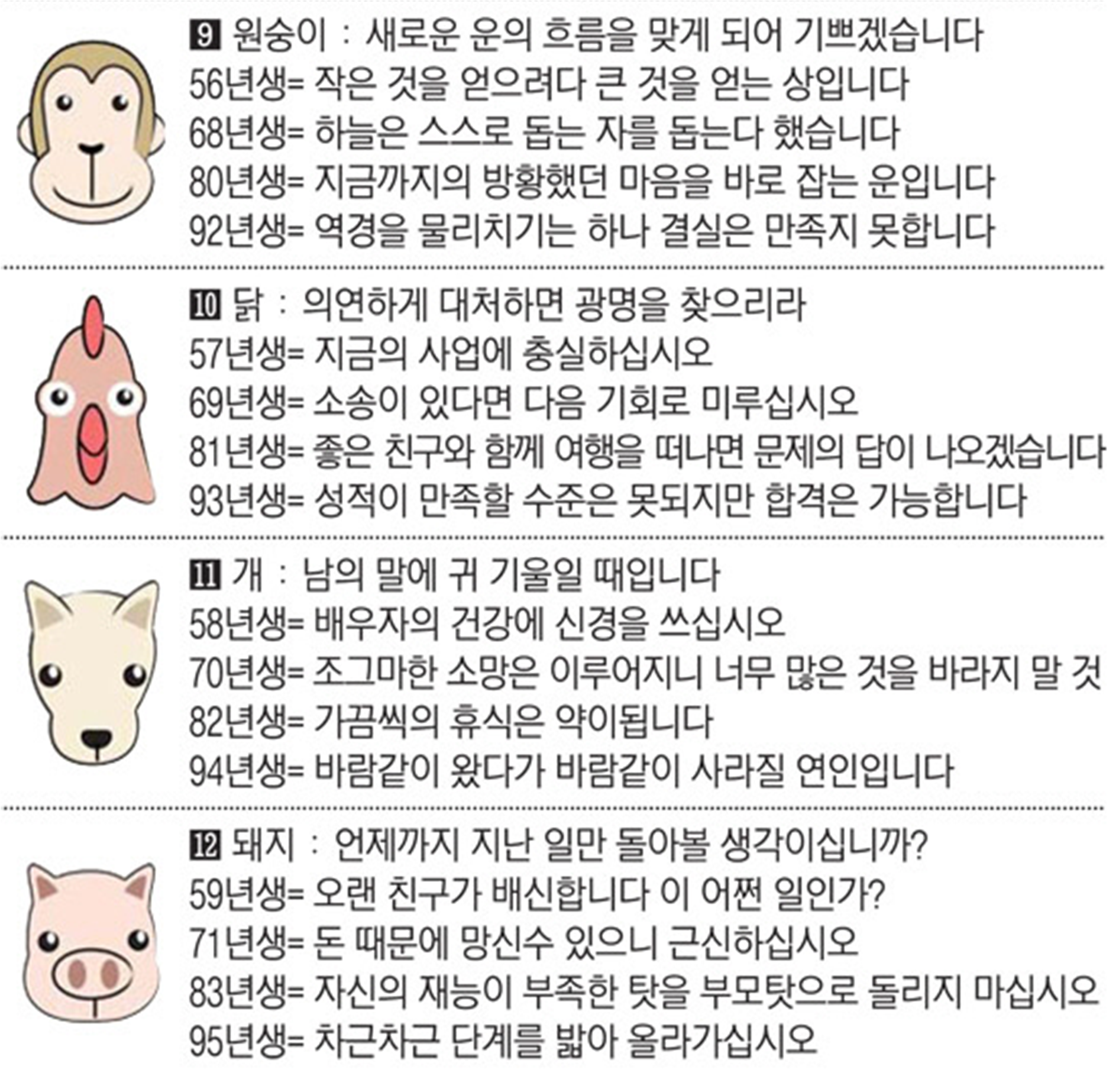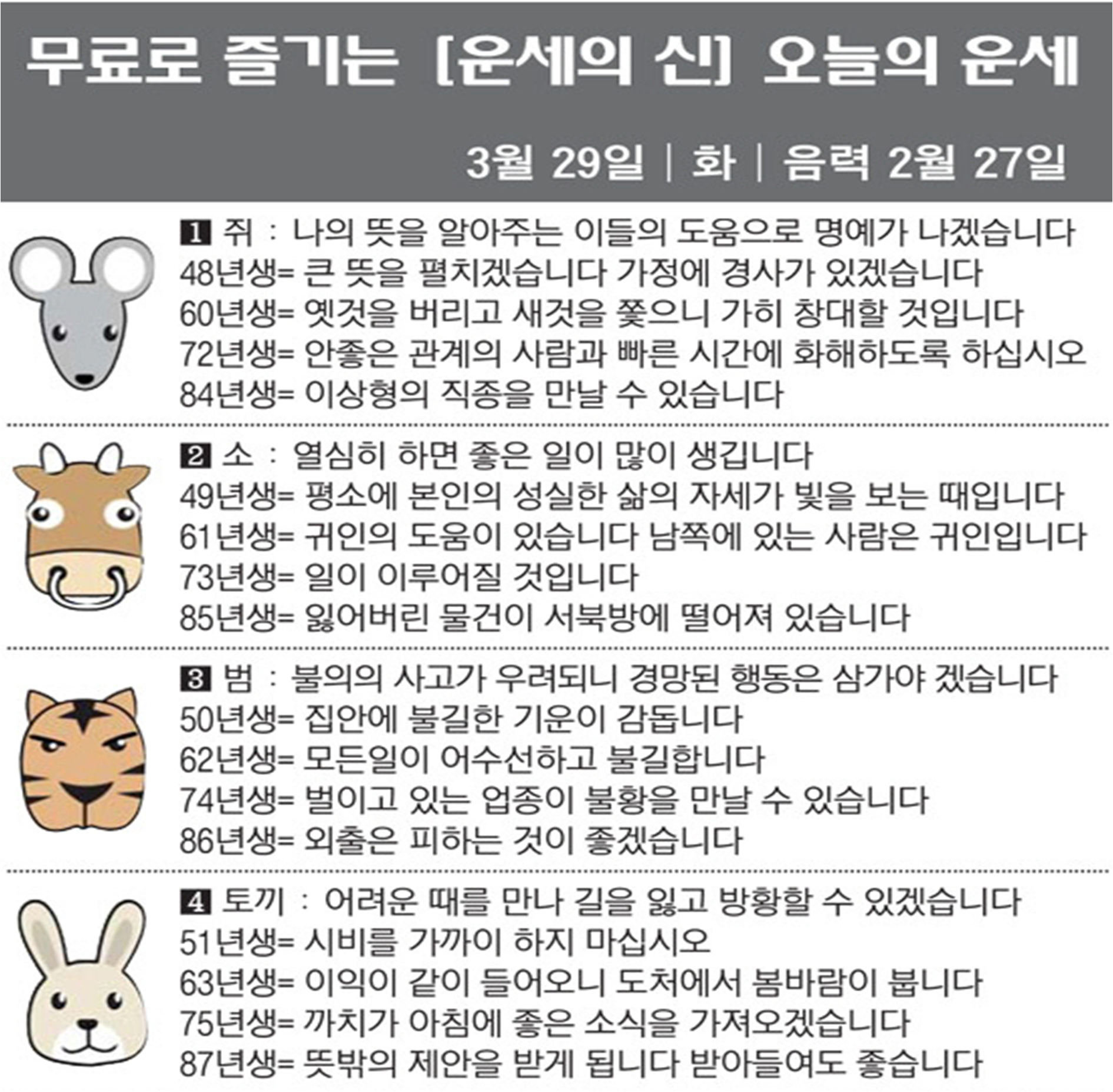 오늘의 운세 2022년 3월 29일 화요일 띠별운세 스포츠조선 2022. 3. 29. 08:44 ★2022 신년운세 보러가기 : https://bit.ly/360Jzf4 #운세의신 에서만 무료로 제공하는 운세 모음!▼ 1. #연애궁합 - http://bit.ly/2HGcNGC 2. #오늘의운세 - http://bit.ly/2Kvo4ra 3. #운명의상대 - http://bit.ly/2xjt3ss 4. #평생사주 - http://bit.ly/2rg8WWv 5. #재물운 -http://bit.ly/2rdQz4A 6. #자녀운 - http://bit.ly/2krNsSx