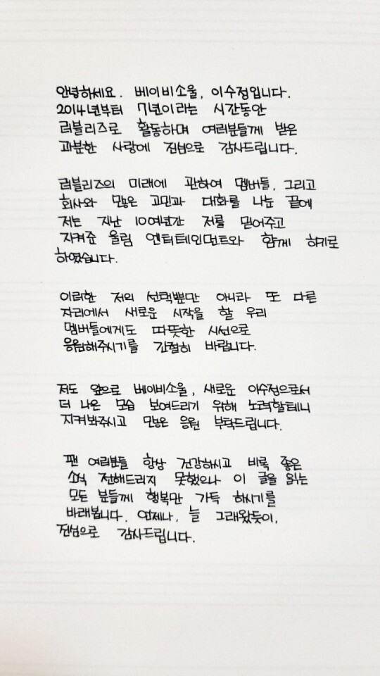 이어 "베이비소울은 당사와 오랜시간 쌓아온 신의를 바탕으로 재계약을 체결했다. 당사는 오랜시간 함께한 베이비소울의 조력자로서 새로운 도약과 활발한 활동을 위해 전폭적인 지원을 아끼지 않을 예정이다. 7년간 울림의 소속 아티스트로서 회사를 빛내주고 최선을 다해준 러블리즈 8명의 멤버에게 감사하며 멤버들의 새 출발을 진심으로 응원한다"고 전했다.