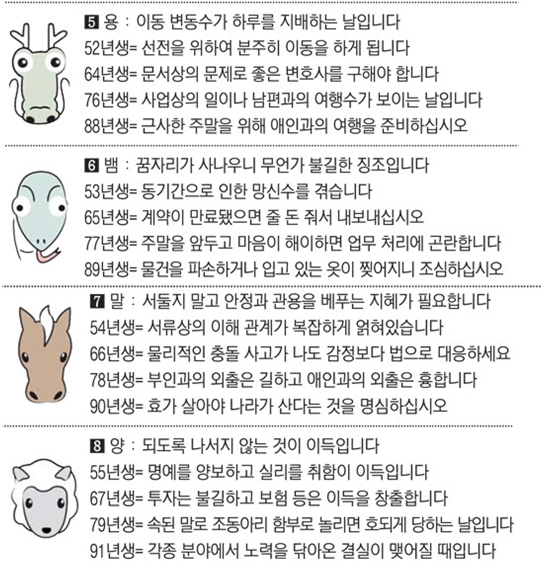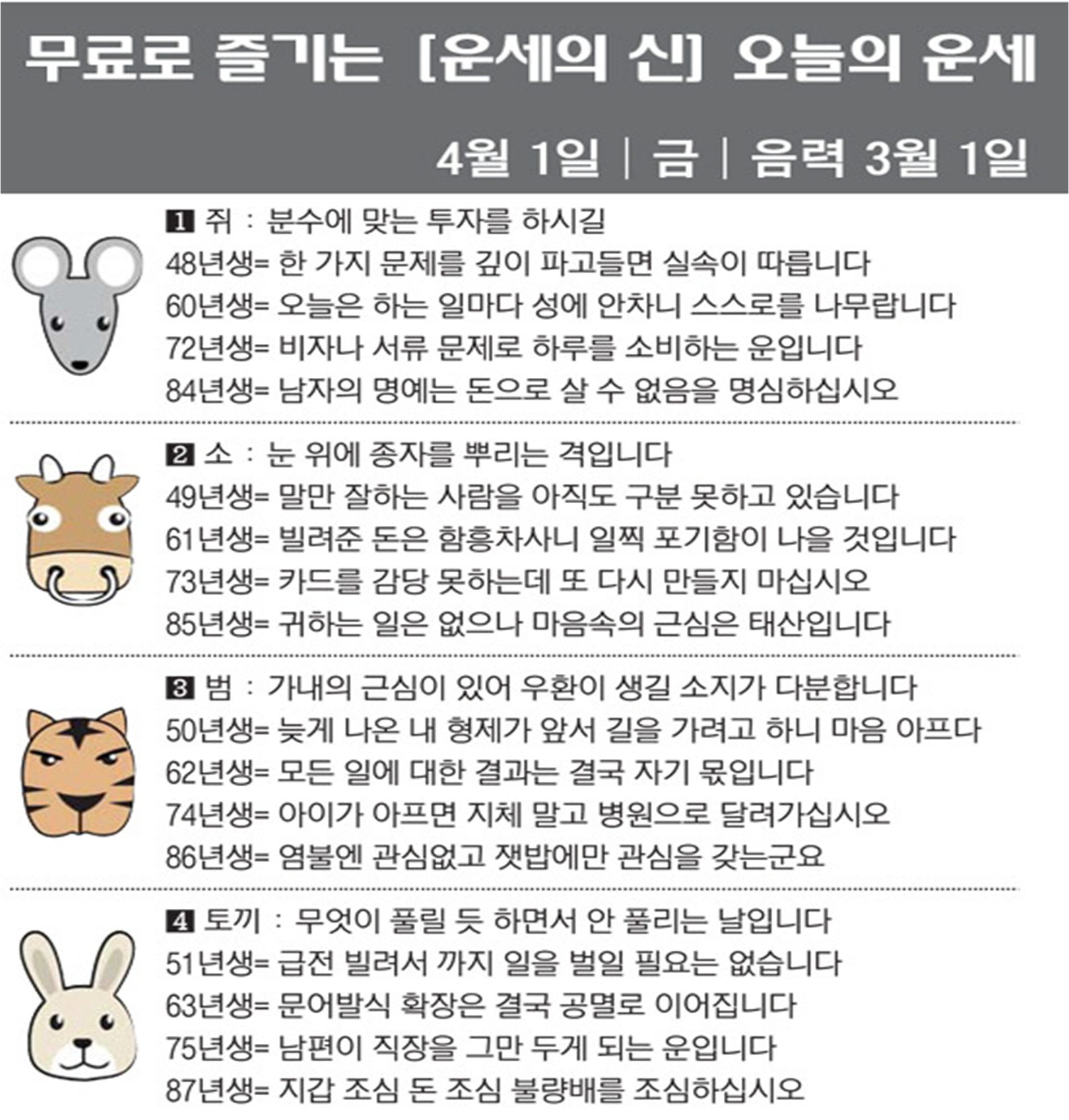 오늘의 운세 2022년 4월 1일 목요일 띠별운세 스포츠조선 2022. 4. 1. 09:28 ★2022 신년운세 보러가기 : https://bit.ly/360Jzf4 #운세의신 에서만 무료로 제공하는 운세 모음!▼ 1. #연애궁합 - http://bit.ly/2HGcNGC 2. #오늘의운세 - http://bit.ly/2Kvo4ra 3. #운명의상대 - http://bit.ly/2xjt3ss 4. #평생사주 - http://bit.ly/2rg8WWv 5. #재물운 -http://bit.ly/2rdQz4A 6. #자녀운 - http://bit.ly/2krNsSx