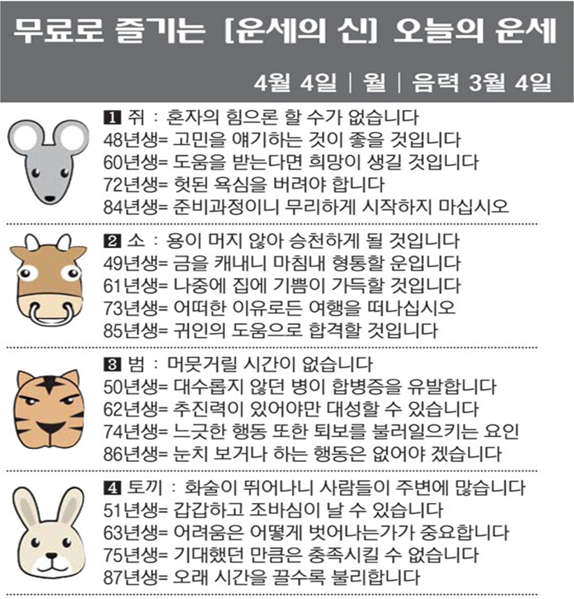 오늘의 운세 2022년 4월 4일 월요일 띠별운세 스포츠조선 2022. 4. 4. 08:54 ★2022 신년운세 보러가기 : https://bit.ly/360Jzf4 #운세의신 에서만 무료로 제공하는 운세 모음!▼ 1. #연애궁합 - http://bit.ly/2HGcNGC 2. #오늘의운세 - http://bit.ly/2Kvo4ra 3. #운명의상대 - http://bit.ly/2xjt3ss 4. #평생사주 - http://bit.ly/2rg8WWv 5. #재물운 -http://bit.ly/2rdQz4A 6. #자녀운 - http://bit.ly/2krNsSx