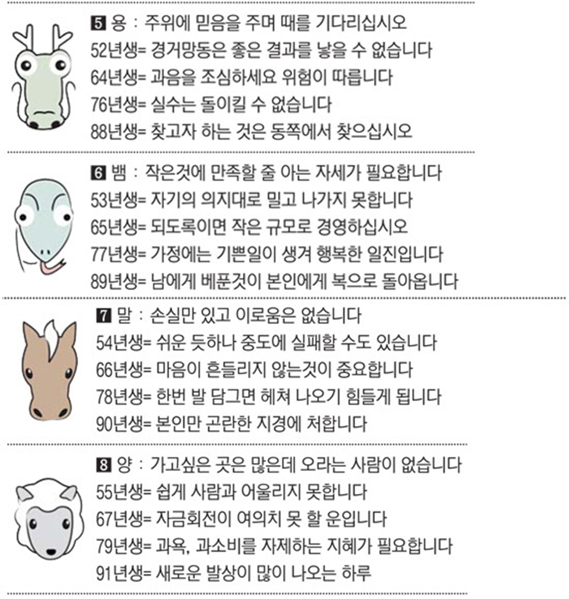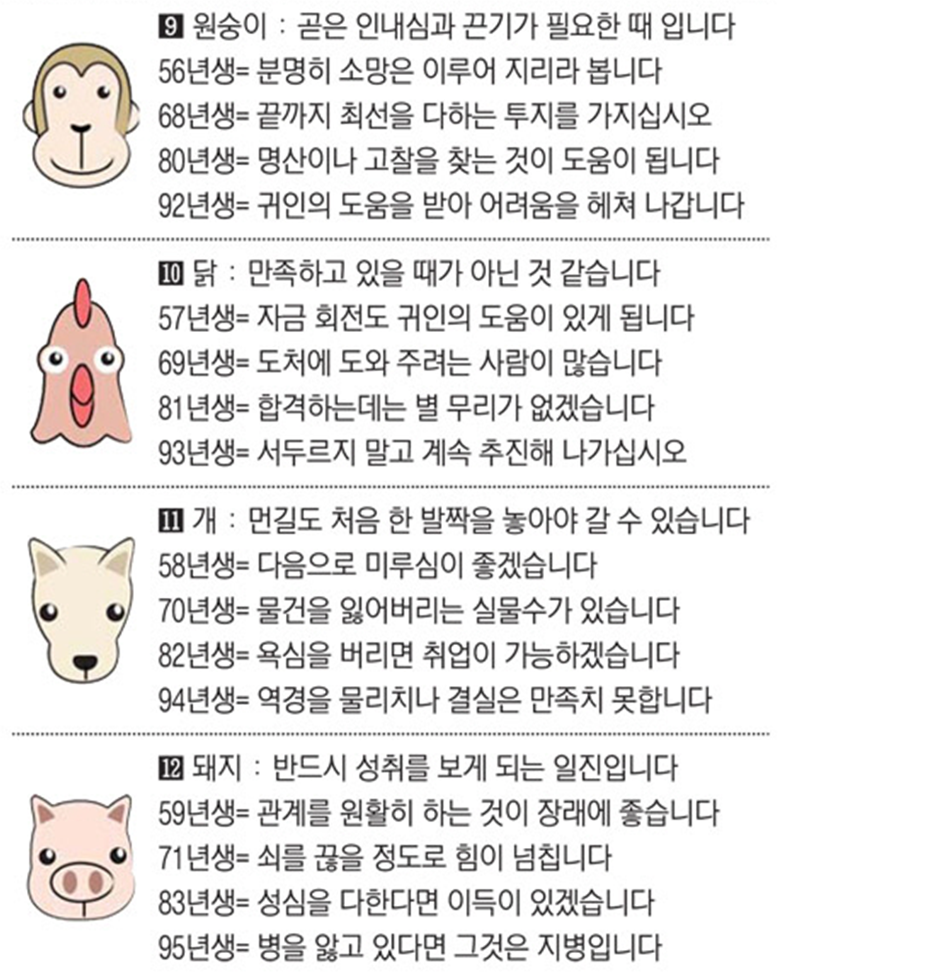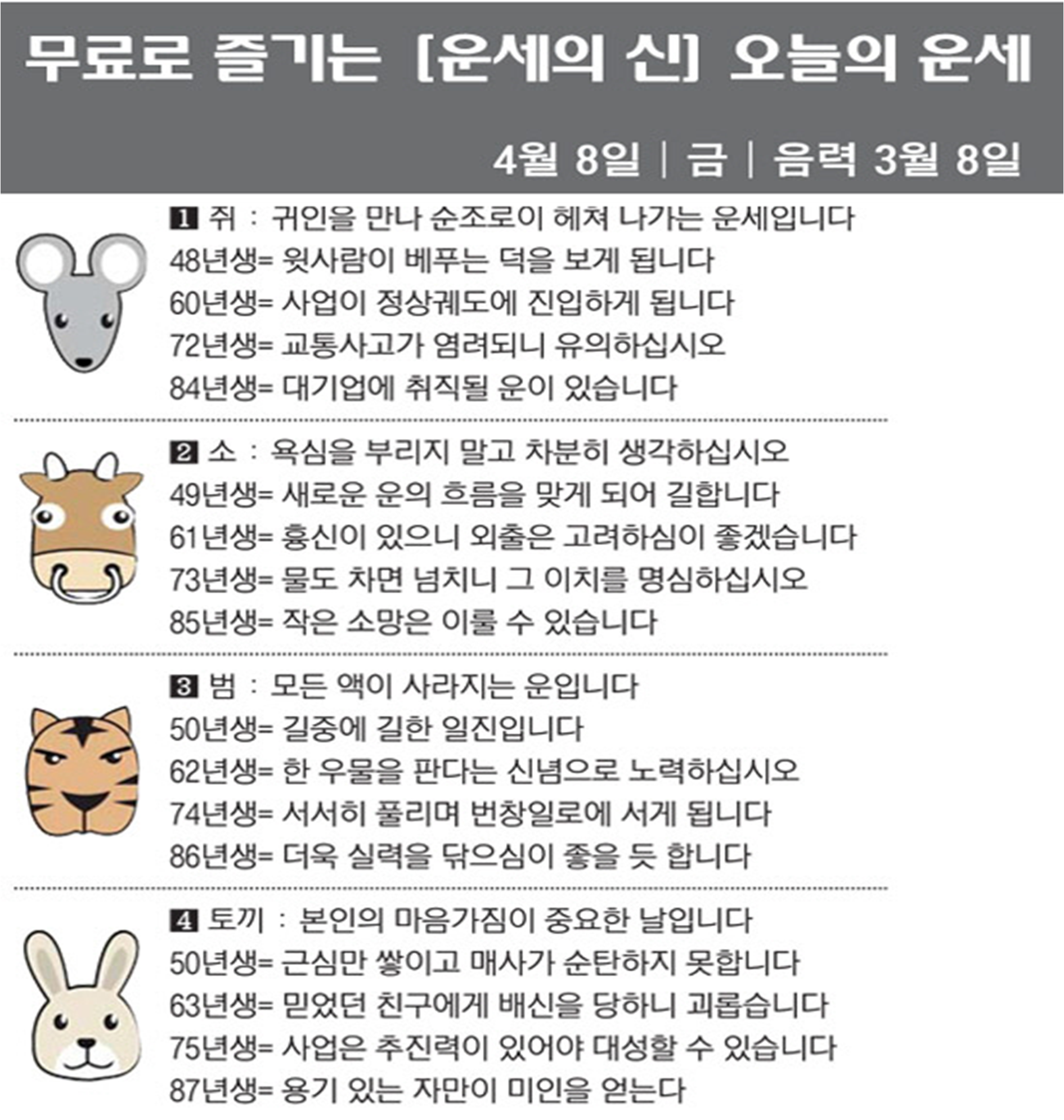 오늘의 운세 2022년 4월 8일 금요일 띠별운세 스포츠조선 2022. 4. 8. 09:08 ★2022 신년운세 보러가기 : https://bit.ly/360Jzf4 #운세의신 에서만 무료로 제공하는 운세 모음!▼ 1. #연애궁합 - http://bit.ly/2HGcNGC 2. #오늘의운세 - http://bit.ly/2Kvo4ra 3. #운명의상대 - http://bit.ly/2xjt3ss 4. #평생사주 - http://bit.ly/2rg8WWv 5. #재물운 -http://bit.ly/2rdQz4A 6. #자녀운 - http://bit.ly/2krNsSx