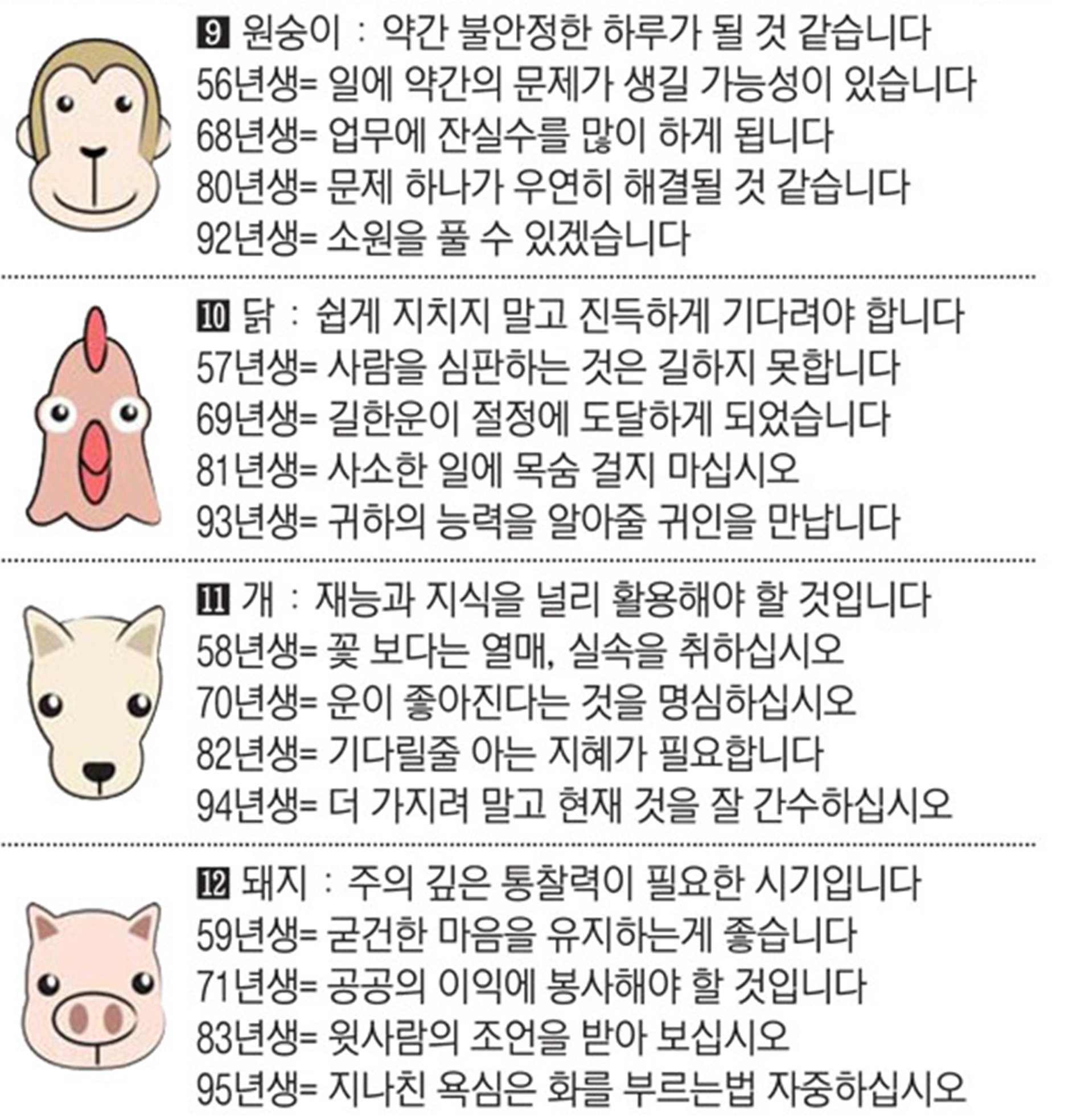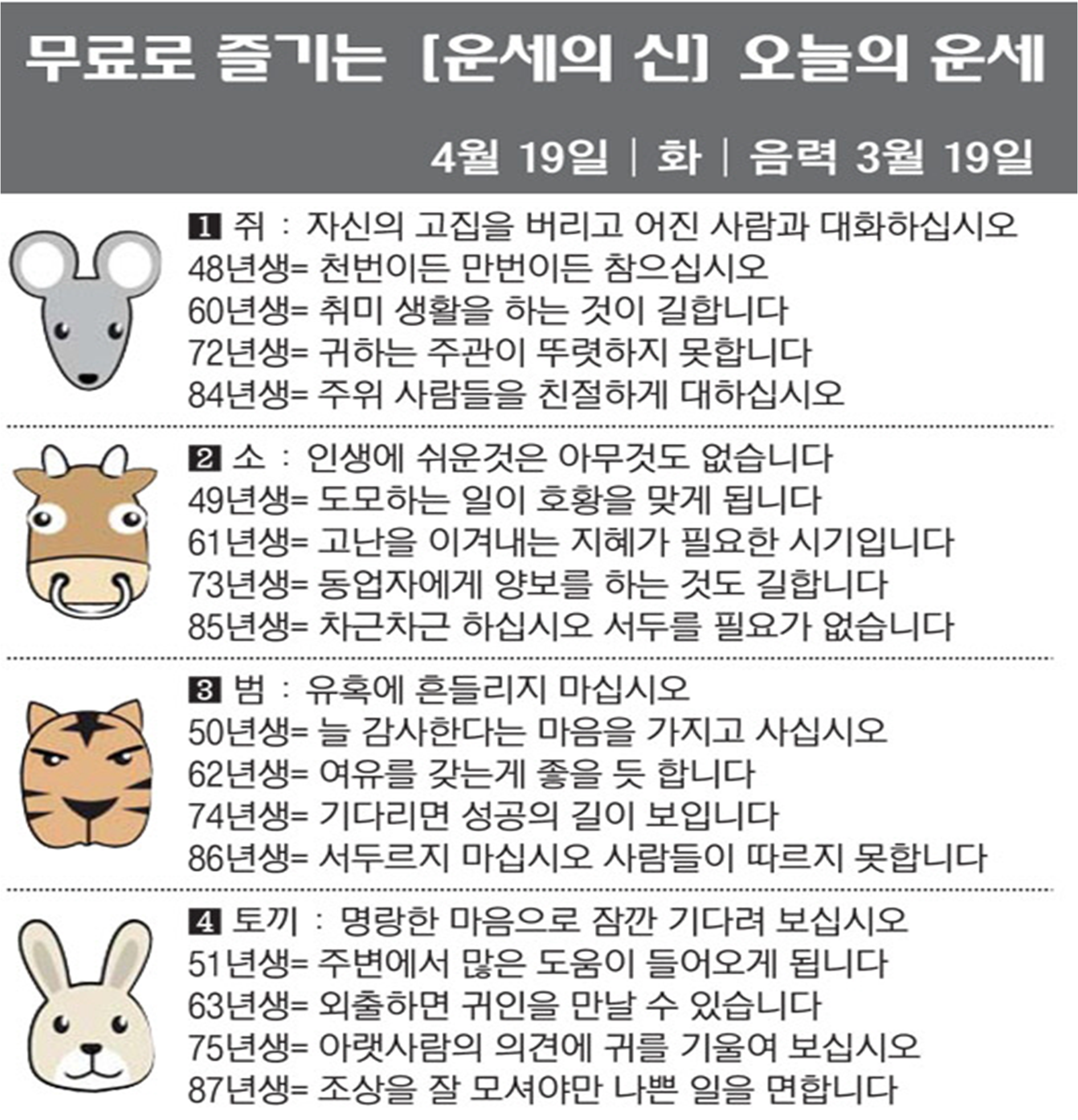 오늘의 운세 2022년 4월 19일 화요일 띠별운세 스포츠조선 2022. 4. 19. 08:49 #운세의신 에서만 무료로 제공하는 운세 모음!▼ 1. #연애궁합 - http://bit.ly/2HGcNGC 2. #오늘의운세 - http://bit.ly/2Kvo4ra 3. #운명의상대 - http://bit.ly/2xjt3ss 4. #평생사주 - http://bit.ly/2rg8WWv 5. #재물운 -http://bit.ly/2rdQz4A 6. #자녀운 - http://bit.ly/2krNsSx