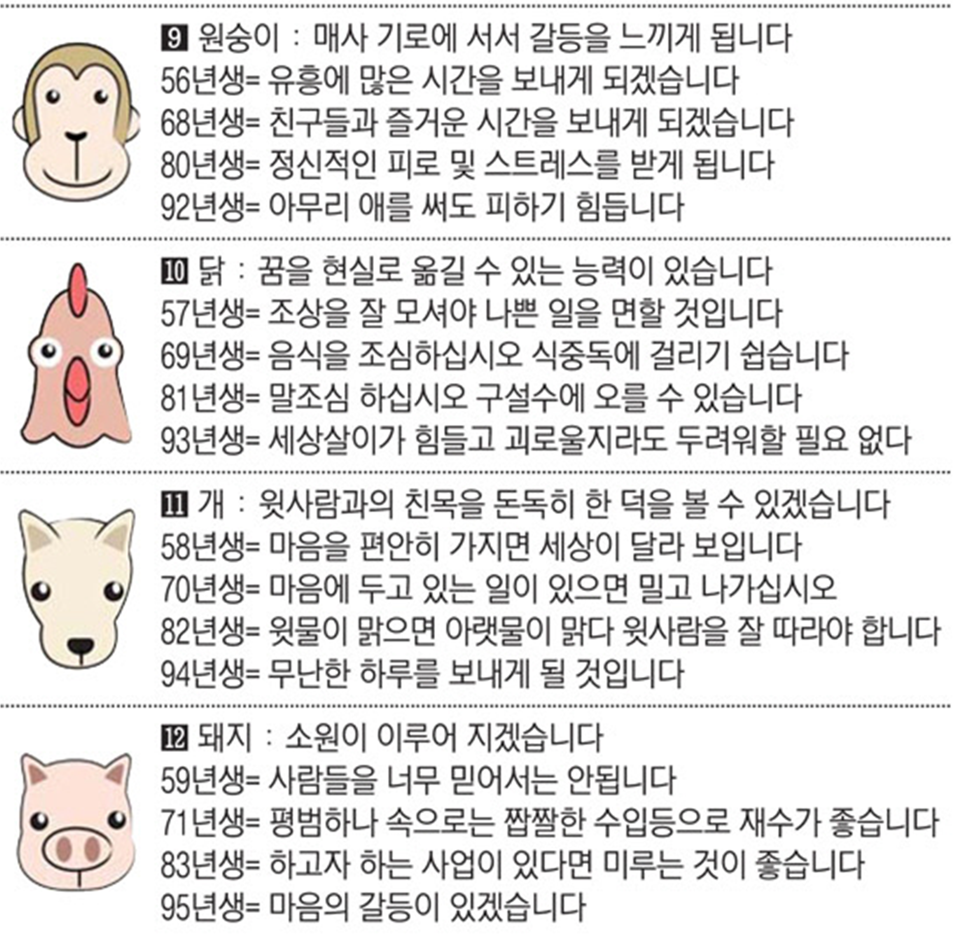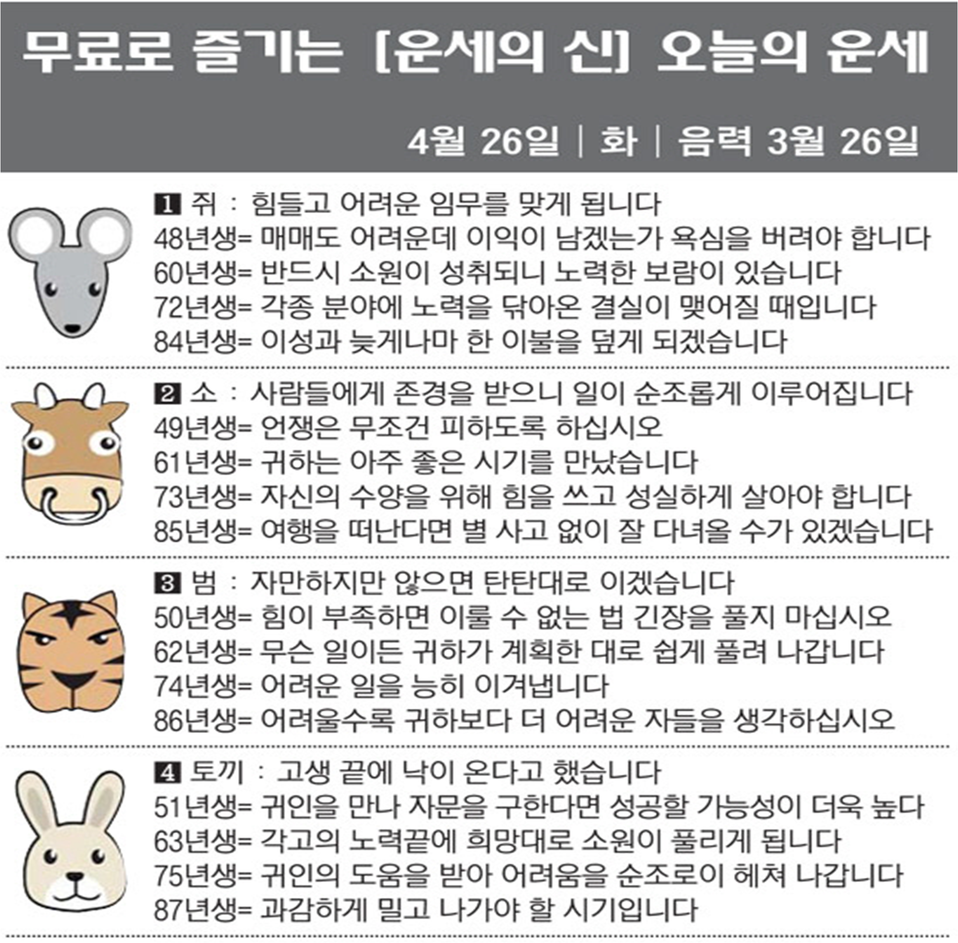 오늘의 운세 2022년 4월 26일 화요일 띠별운세 스포츠조선 2022. 4. 26. 08:52 #운세의신 에서만 무료로 제공하는 운세 모음!▼ 1. #연애궁합 - http://bit.ly/2HGcNGC 2. #오늘의운세 - http://bit.ly/2Kvo4ra 3. #운명의상대 - http://bit.ly/2xjt3ss 4. #평생사주 - http://bit.ly/2rg8WWv 5. #재물운 -http://bit.ly/2rdQz4A 6. #자녀운 - http://bit.ly/2krNsSx