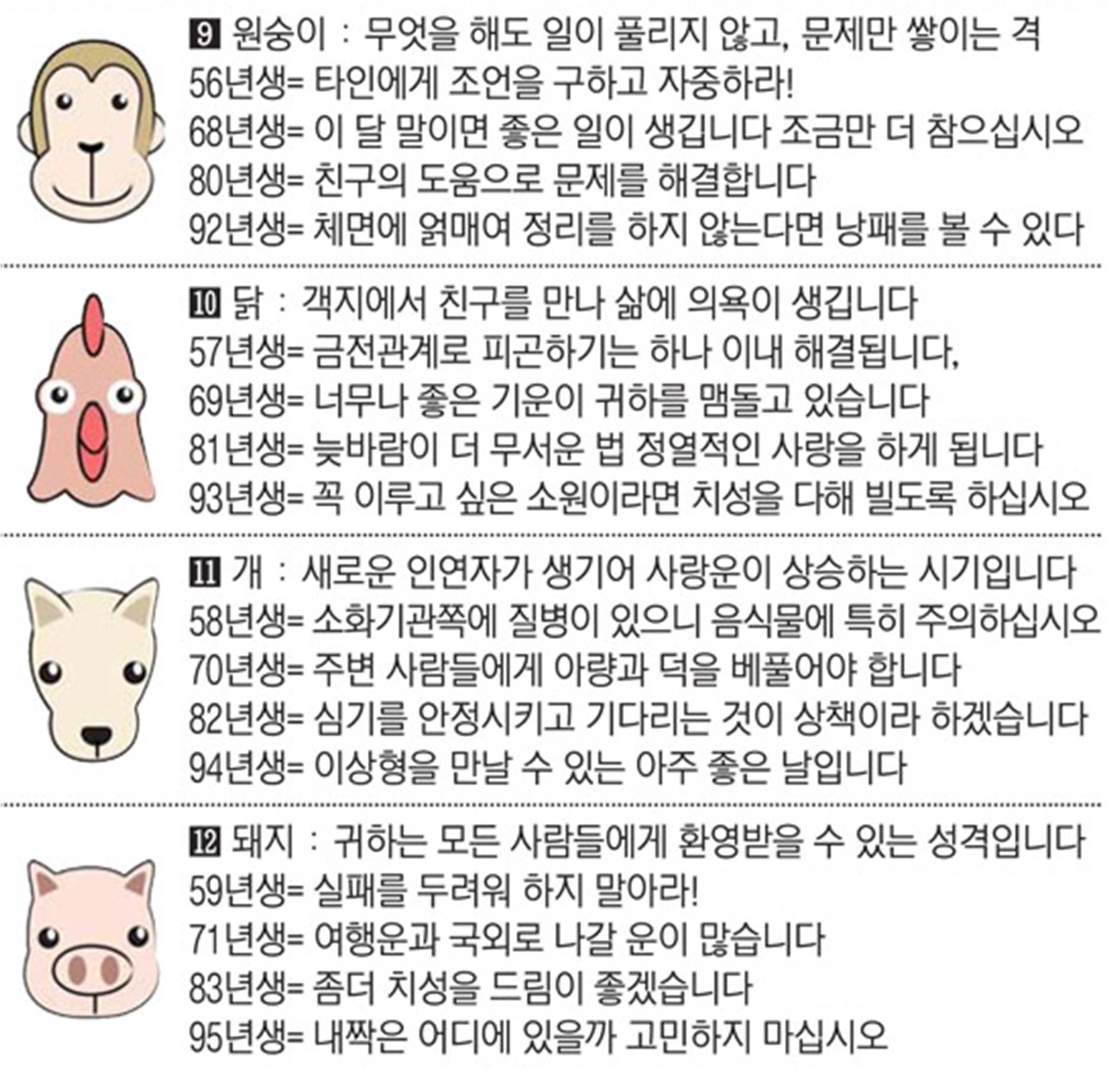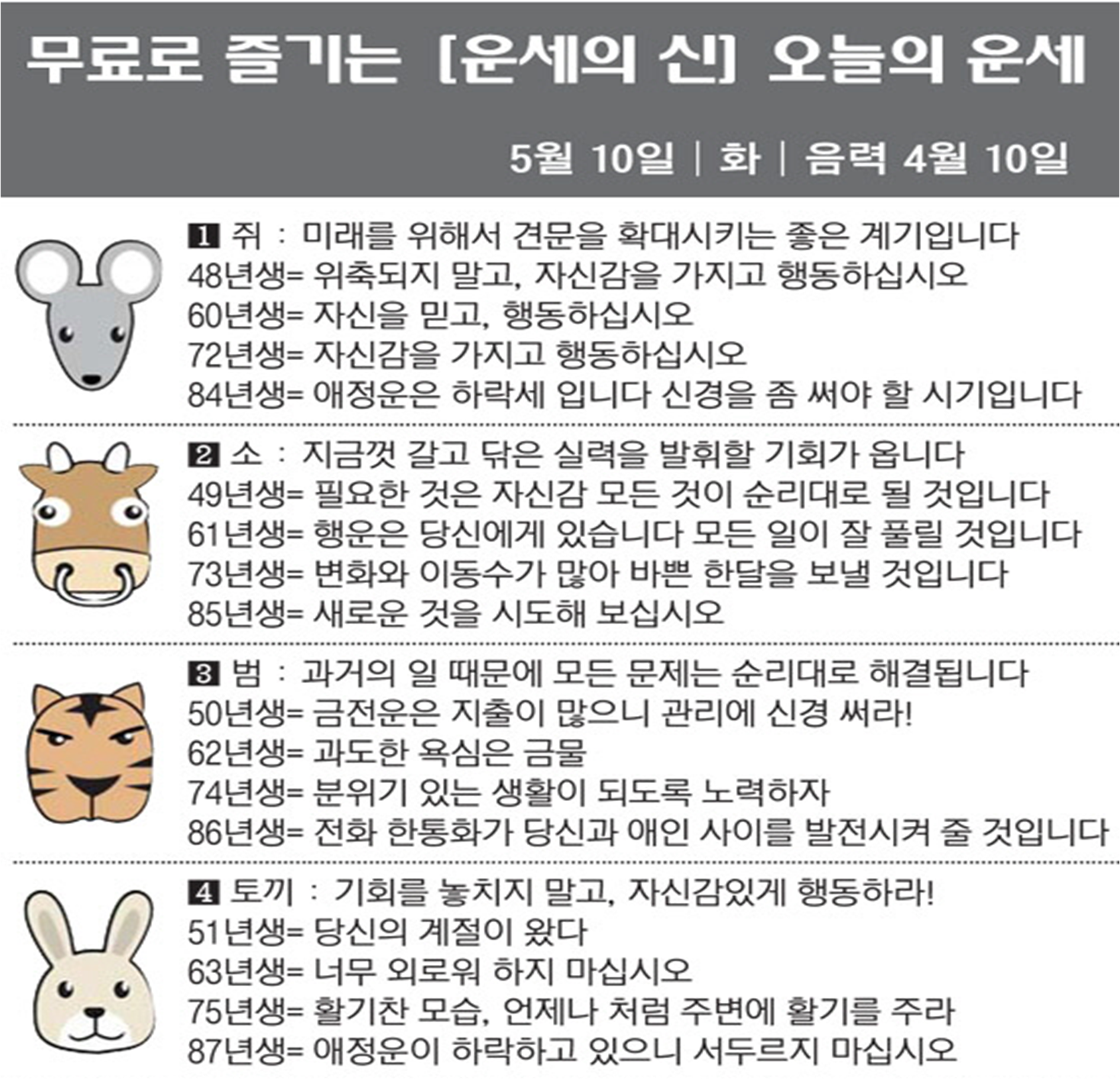 오늘의 운세 2022년 5월 10일 화요일 띠별운세 스포츠조선 2022. 5. 10. 08:49 #운세의신 에서만 무료로 제공하는 운세 모음!▼ 1. #연애궁합 - http://bit.ly/2HGcNGC 2. #오늘의운세 - http://bit.ly/2Kvo4ra 3. #운명의상대 - http://bit.ly/2xjt3ss 4. #평생사주 - http://bit.ly/2rg8WWv 5. #재물운 -http://bit.ly/2rdQz4A 6. #자녀운 - http://bit.ly/2krNsSx