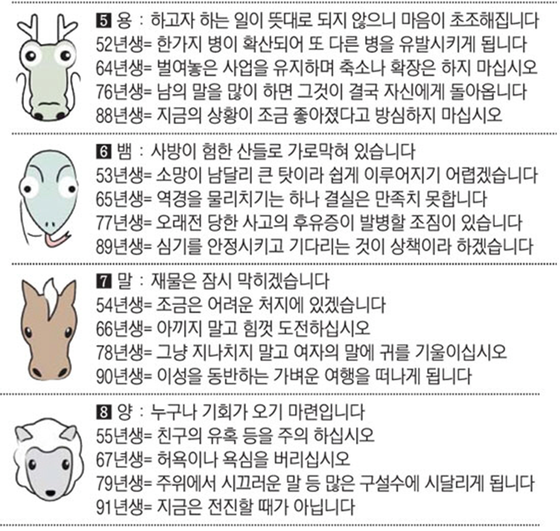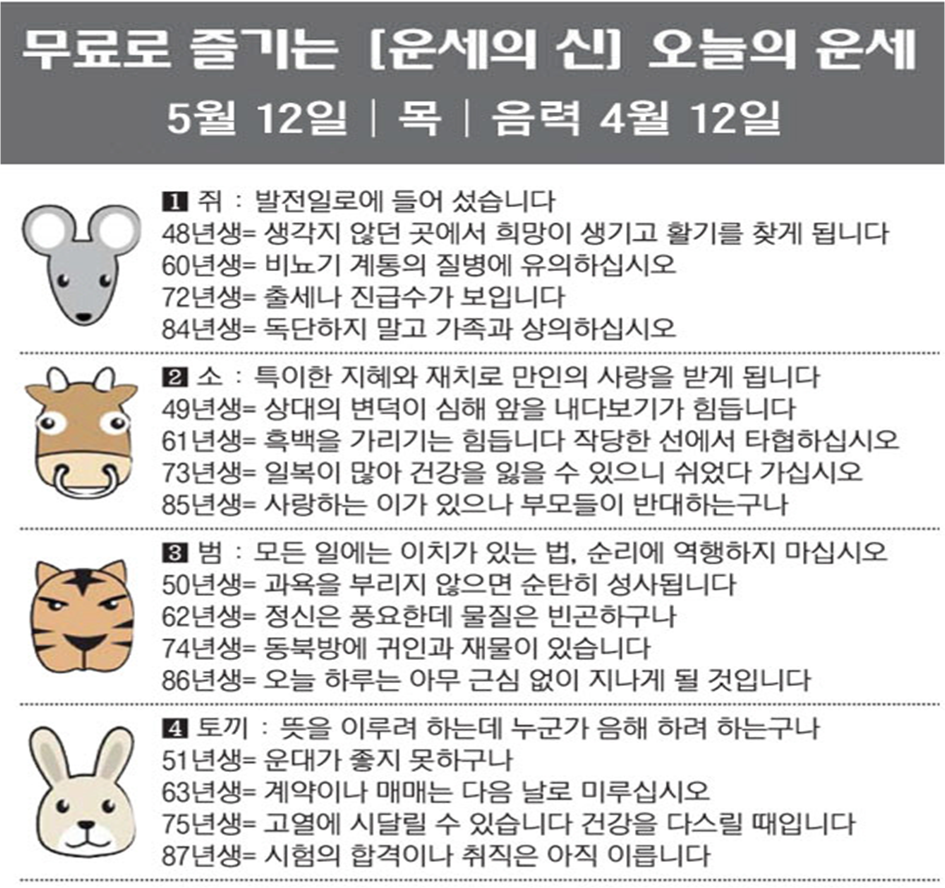 오늘의 운세 2022년 5월 12일 목요일 띠별운세 스포츠조선 2022. 5. 12. 09:01 #운세의신 에서만 무료로 제공하는 운세 모음!▼ 1. #연애궁합 - http://bit.ly/2HGcNGC 2. #오늘의운세 - http://bit.ly/2Kvo4ra 3. #운명의상대 - http://bit.ly/2xjt3ss 4. #평생사주 - http://bit.ly/2rg8WWv 5. #재물운 -http://bit.ly/2rdQz4A 6. #자녀운 - http://bit.ly/2krNsSx