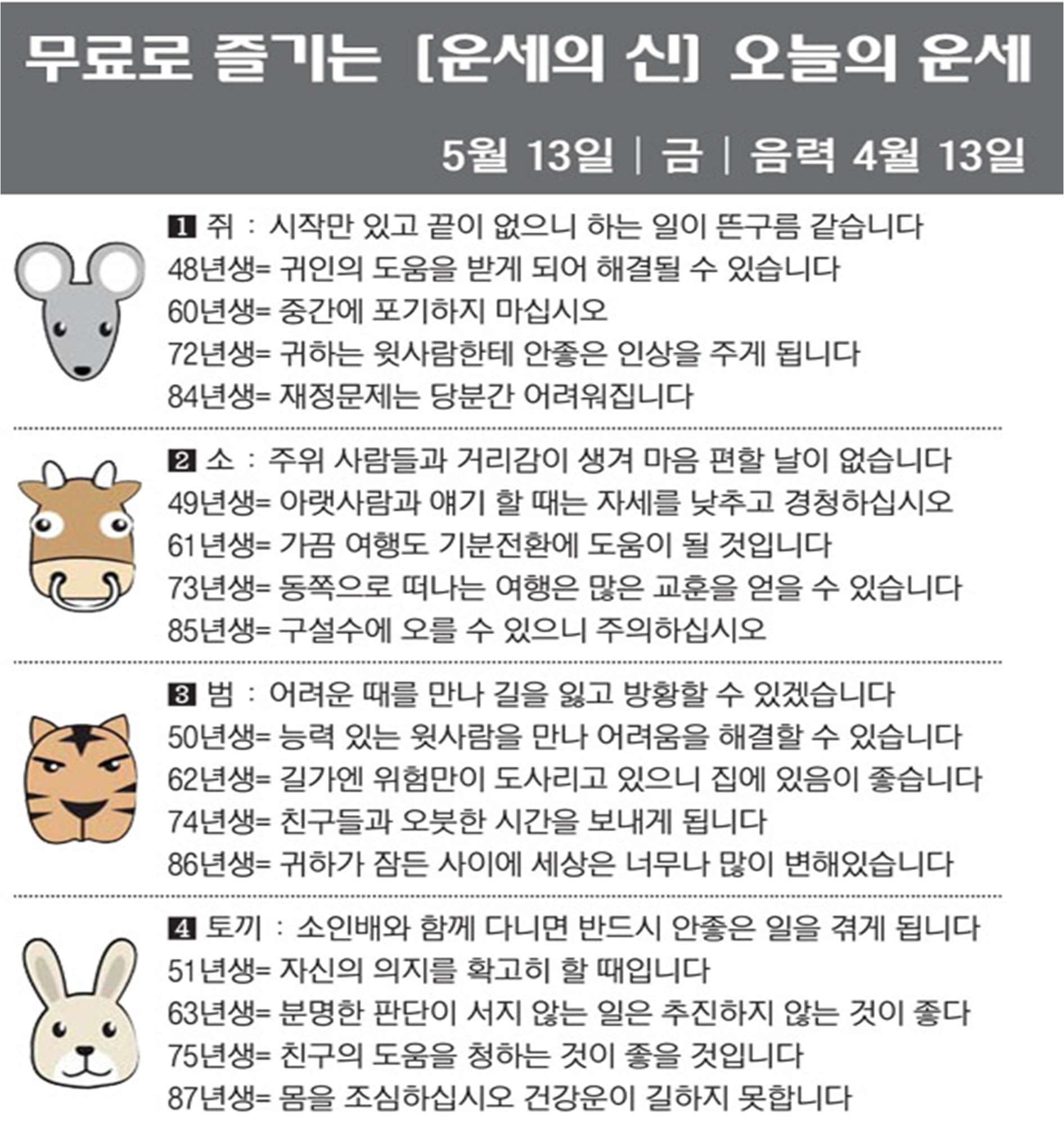 오늘의 운세 2022년 5월 13일 금요일 띠별운세 스포츠조선 2022. 5. 13. 08:57 #운세의신 에서만 무료로 제공하는 운세 모음!▼ 1. #연애궁합 - http://bit.ly/2HGcNGC 2. #오늘의운세 - http://bit.ly/2Kvo4ra 3. #운명의상대 - http://bit.ly/2xjt3ss 4. #평생사주 - http://bit.ly/2rg8WWv 5. #재물운 -http://bit.ly/2rdQz4A 6. #자녀운 - http://bit.ly/2krNsSx