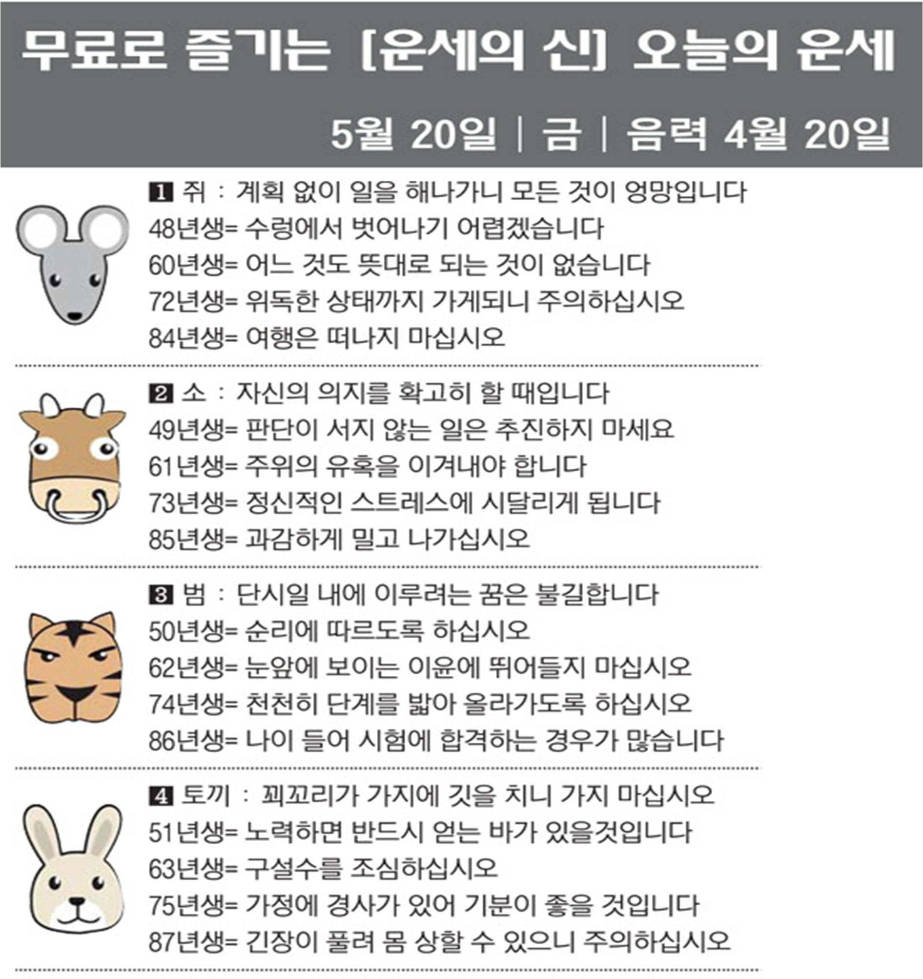 오늘의 운세 2022년 5월 20일 금요일 띠별운세 스포츠조선 2022. 5. 20. 09:39 #운세의신 에서만 무료로 제공하는 운세 모음!▼ 1. #연애궁합 - http://bit.ly/2HGcNGC 2. #오늘의운세 - http://bit.ly/2Kvo4ra 3. #운명의상대 - http://bit.ly/2xjt3ss 4. #평생사주 - http://bit.ly/2rg8WWv 5. #재물운 -http://bit.ly/2rdQz4A 6. #자녀운 - http://bit.ly/2krNsSx