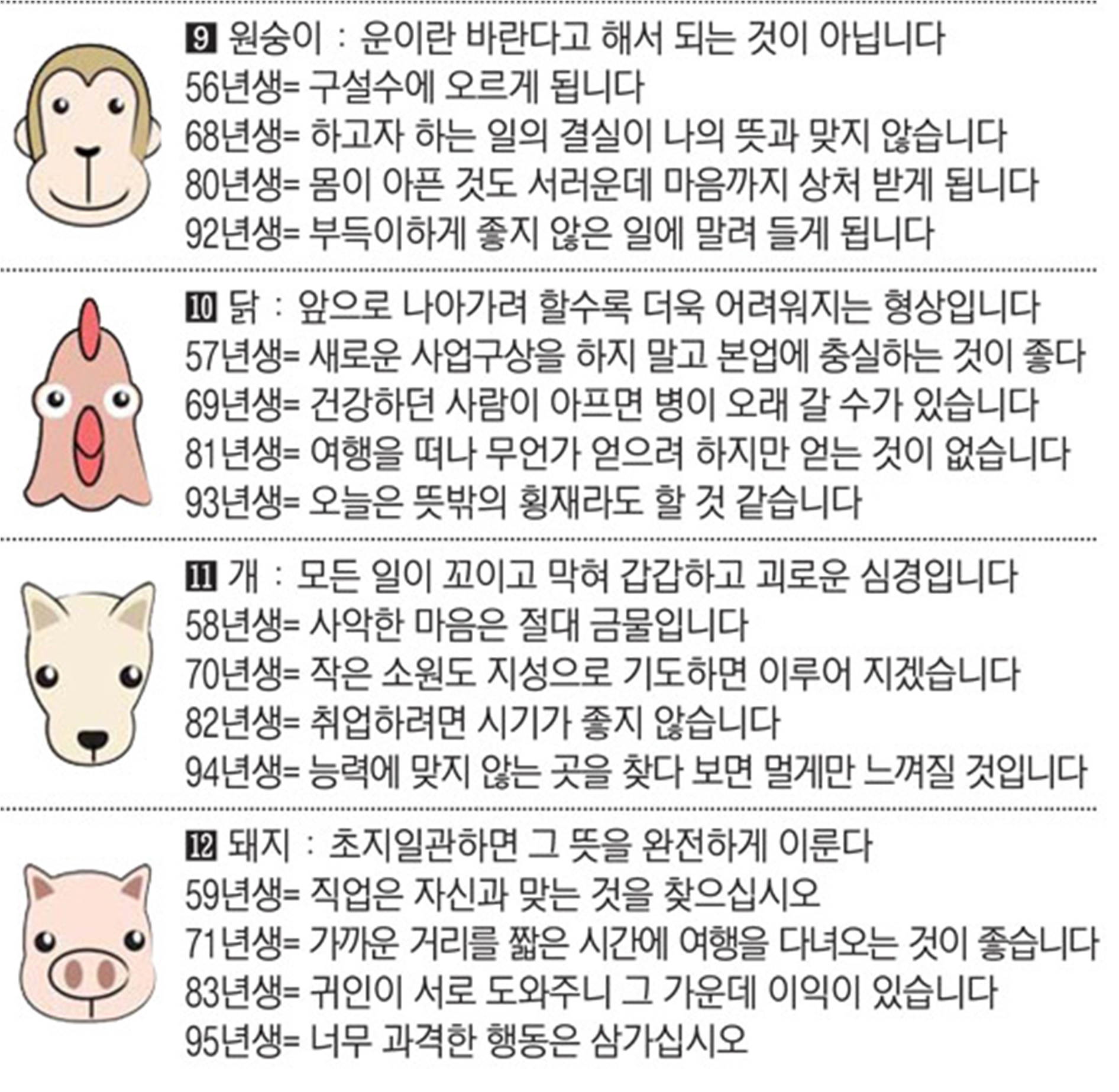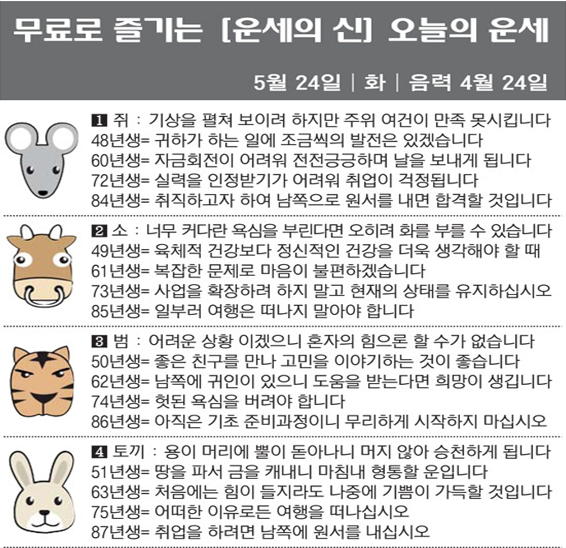 오늘의 운세 2022년 5월 24일 화요일 띠별운세 스포츠조선 2022. 5. 24. 08:43 #운세의신 에서만 무료로 제공하는 운세 모음!▼ 1. #연애궁합 - http://bit.ly/2HGcNGC 2. #오늘의운세 - http://bit.ly/2Kvo4ra 3. #운명의상대 - http://bit.ly/2xjt3ss 4. #평생사주 - http://bit.ly/2rg8WWv 5. #재물운 -http://bit.ly/2rdQz4A 6. #자녀운 - http://bit.ly/2krNsSx