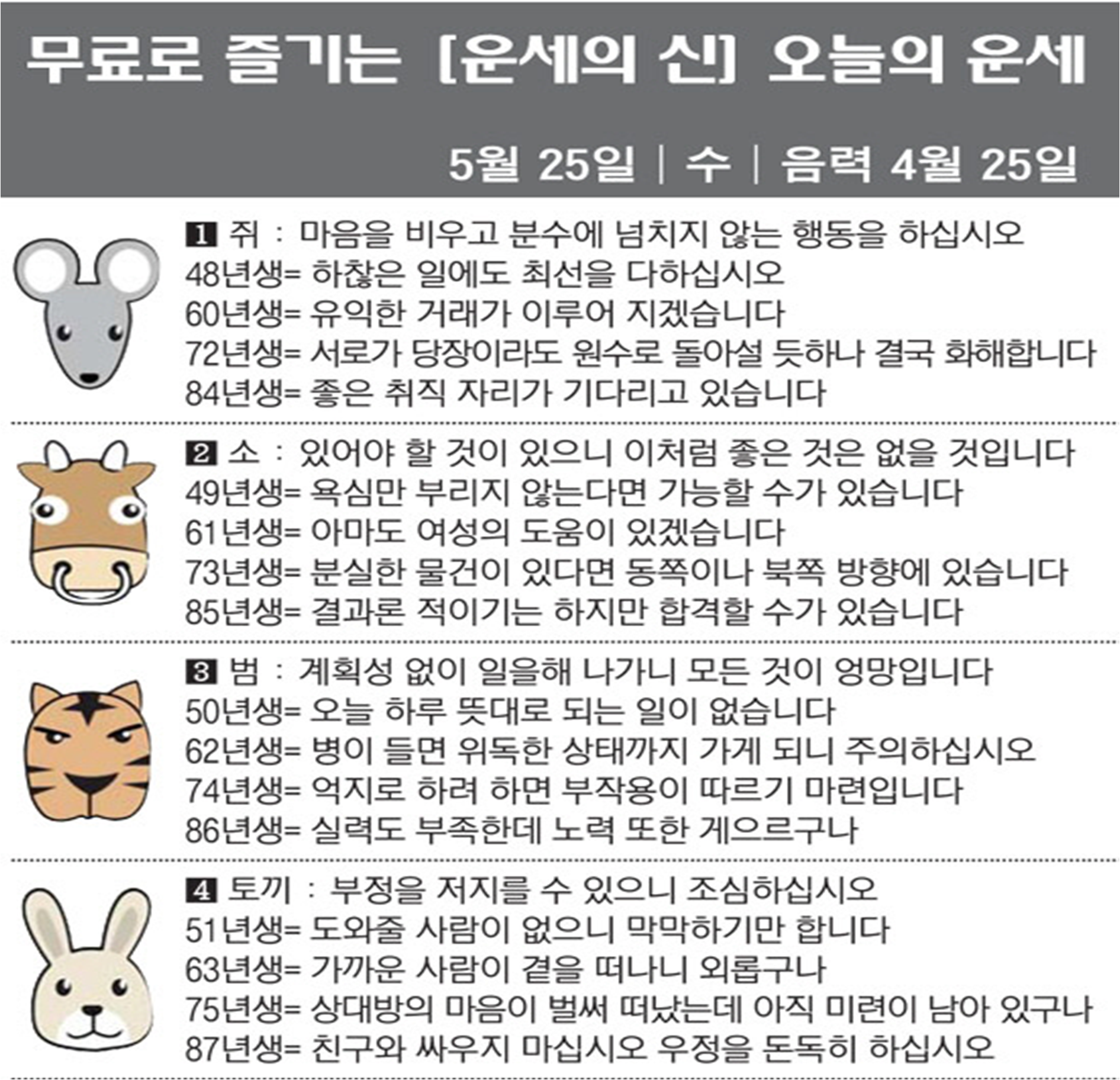 오늘의 운세 2022년 5월 25일 수요일 띠별운세 스포츠조선 2022. 5. 25. 08:41 #운세의신 에서만 무료로 제공하는 운세 모음!▼ 1. #연애궁합 - http://bit.ly/2HGcNGC 2. #오늘의운세 - http://bit.ly/2Kvo4ra 3. #운명의상대 - http://bit.ly/2xjt3ss 4. #평생사주 - http://bit.ly/2rg8WWv 5. #재물운 -http://bit.ly/2rdQz4A 6. #자녀운 - http://bit.ly/2krNsSx