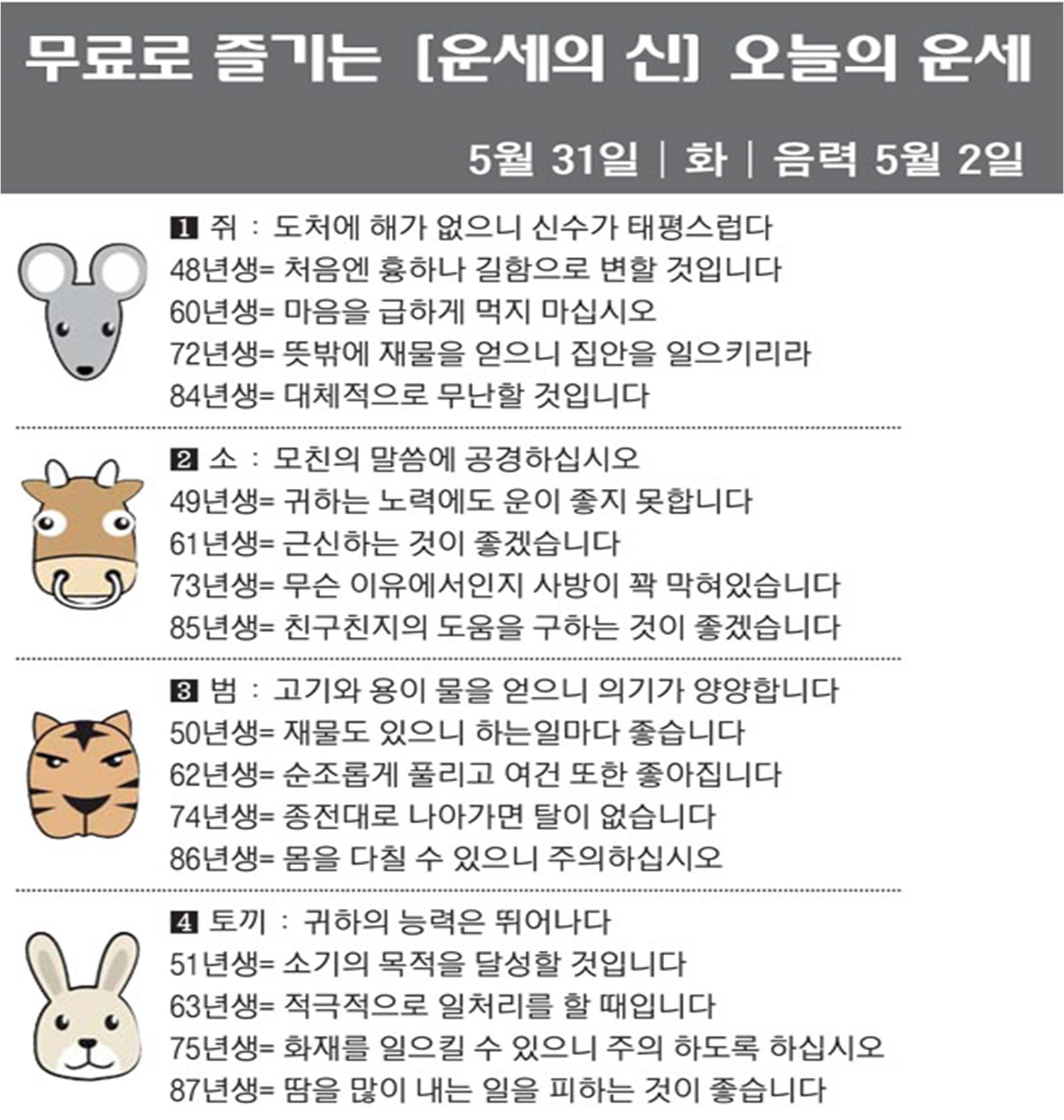 오늘의 운세 2022년 5월 31일 화요일 띠별운세 스포츠조선 2022. 5. 31. 08:45 #운세의신 에서만 무료로 제공하는 운세 모음!▼ 1. #연애궁합 - http://bit.ly/2HGcNGC 2. #오늘의운세 - http://bit.ly/2Kvo4ra 3. #운명의상대 - http://bit.ly/2xjt3ss 4. #평생사주 - http://bit.ly/2rg8WWv 5. #재물운 -http://bit.ly/2rdQz4A 6. #자녀운 - http://bit.ly/2krNsSx